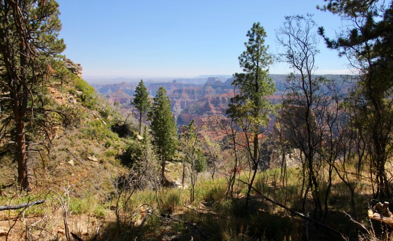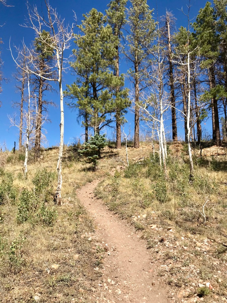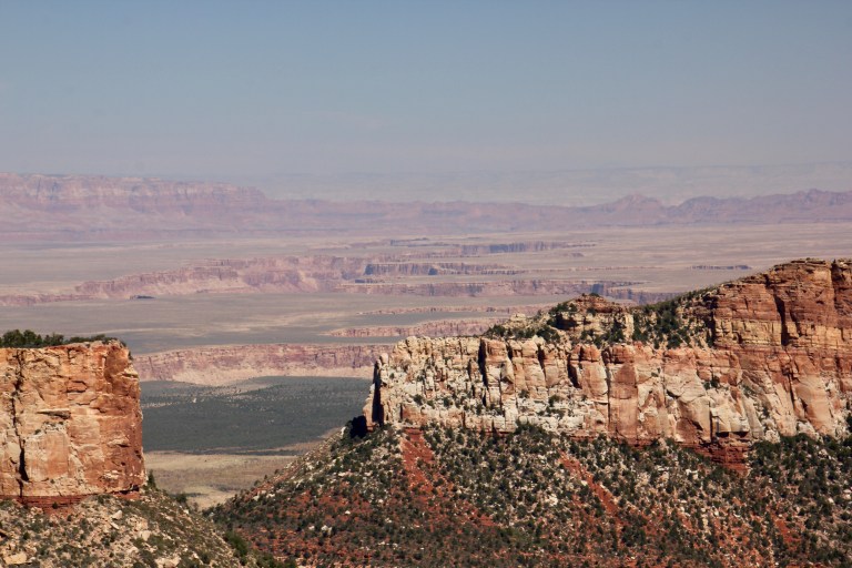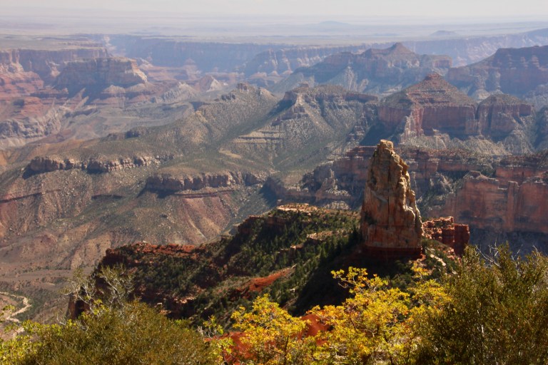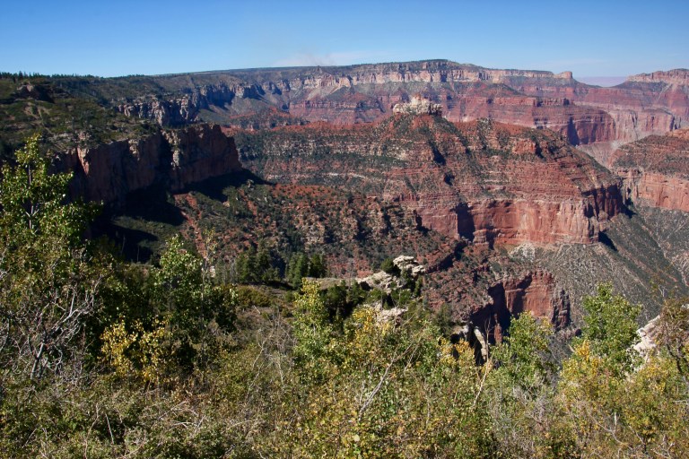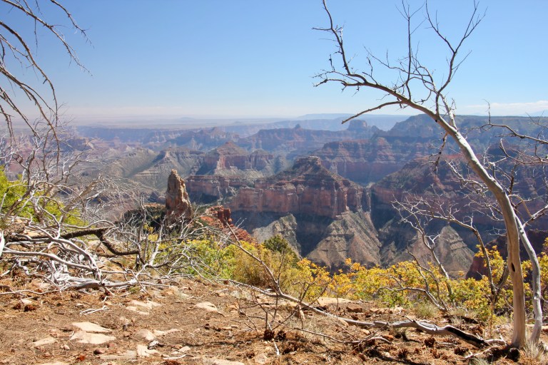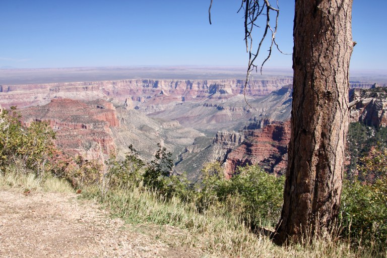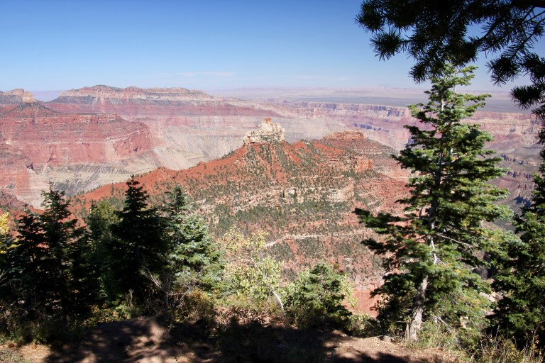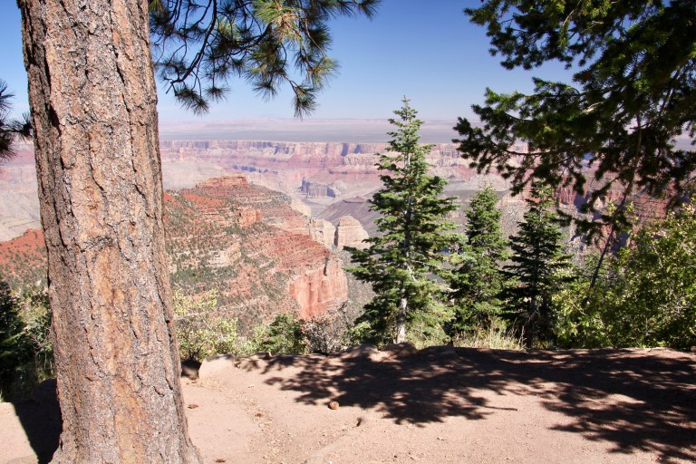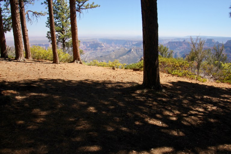 We took the Cape Royal Road towards Point Imperial, which was lined with colourful aspens and towering pines. Point Imperial is the highest point on the north rim at over 8,800 feet. Walking around was an effort, but we seem to be getting more used to it as the days pass. It was also scenic, with views across to the Vermillion and Echo Cliffs. We walked a short way west along the Ken Patrick trail for additional views, totalling around three quarters of a mile.