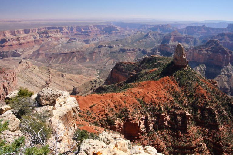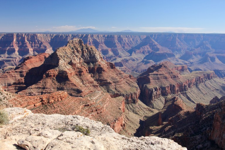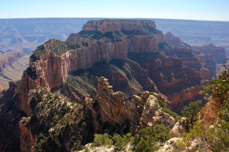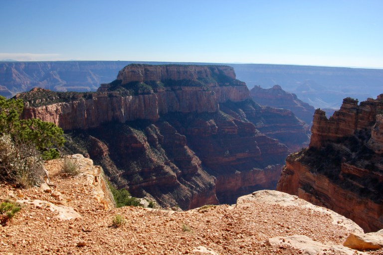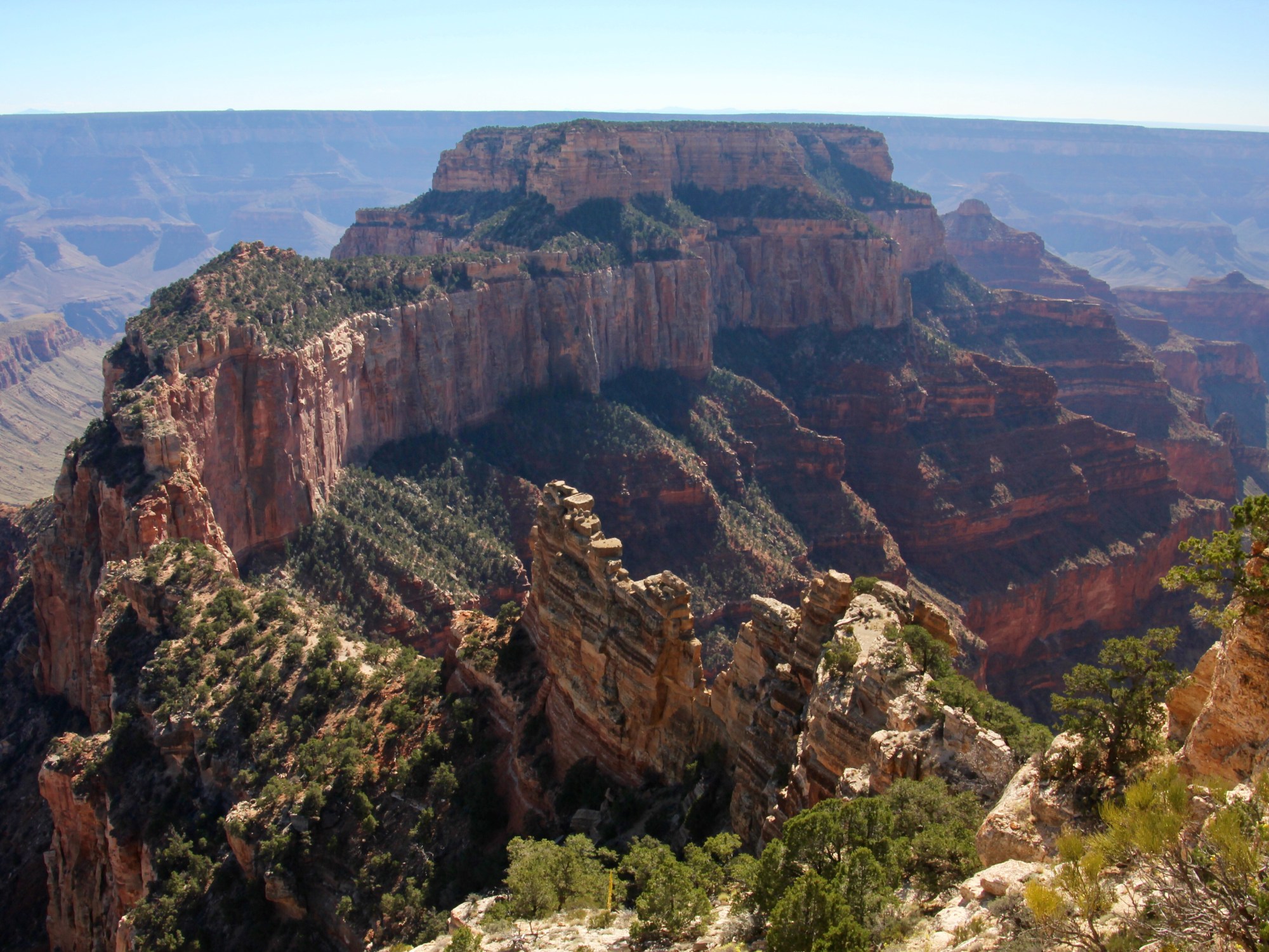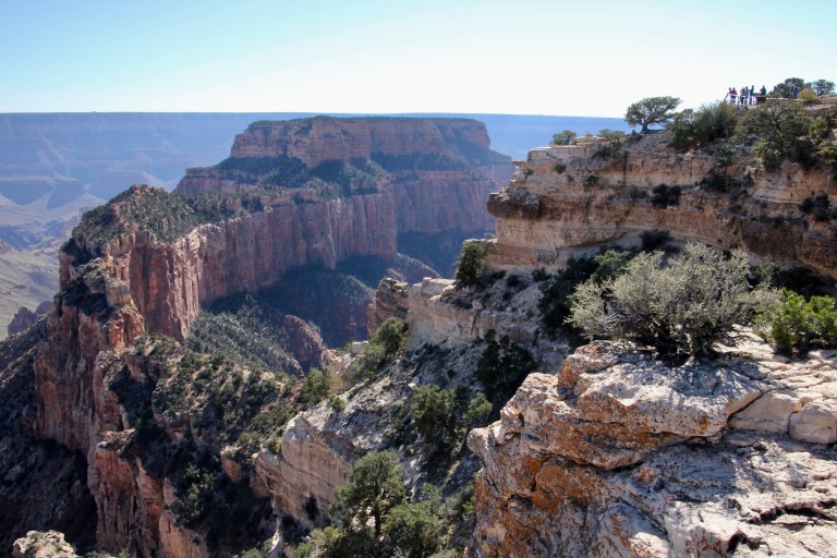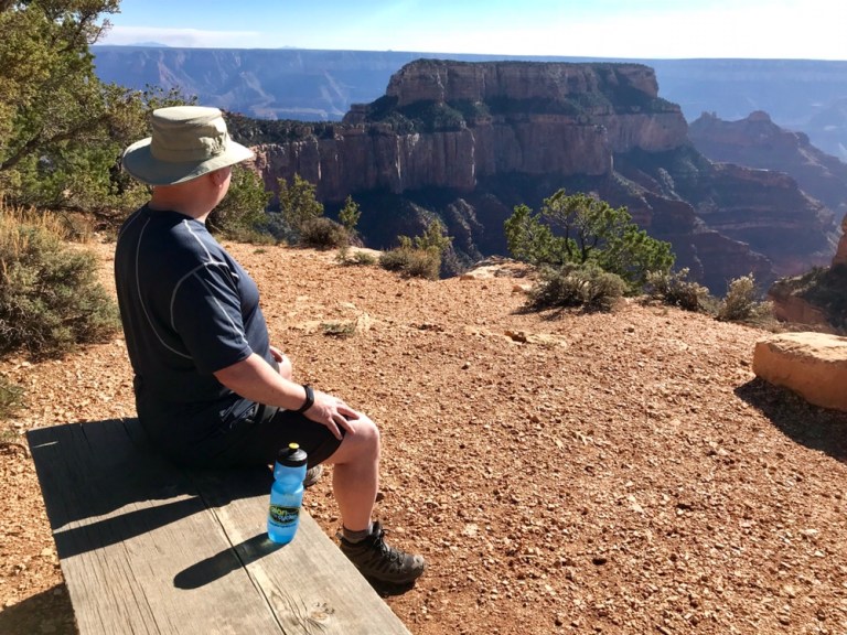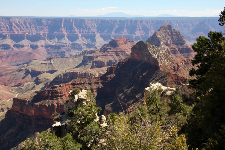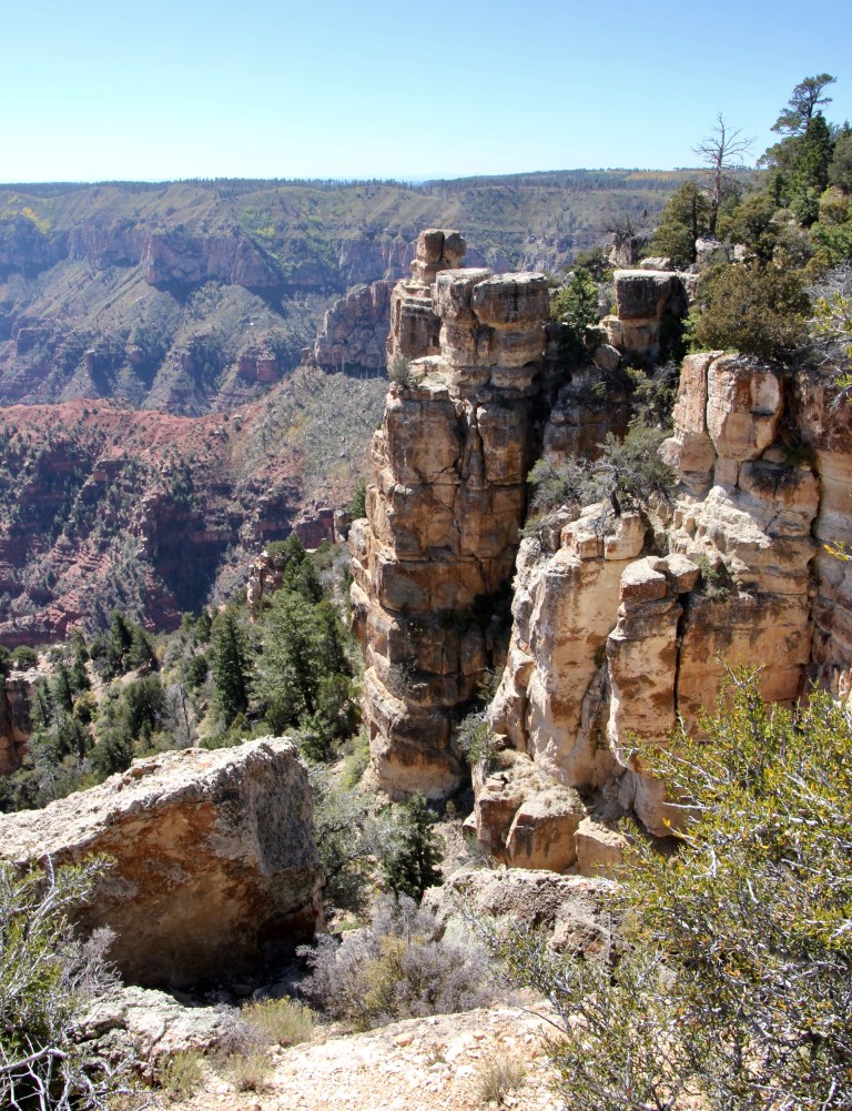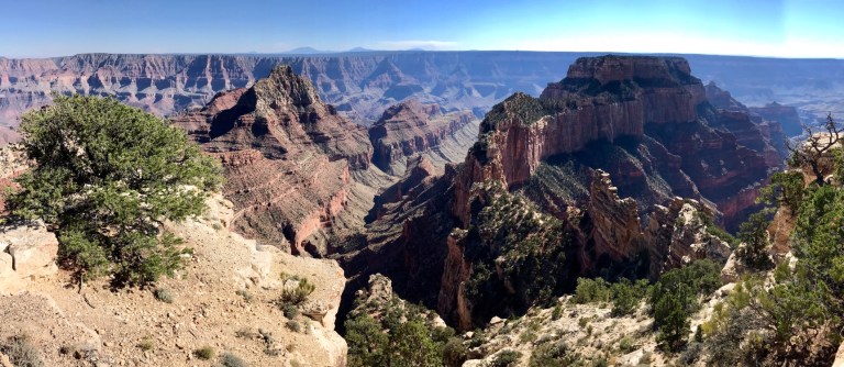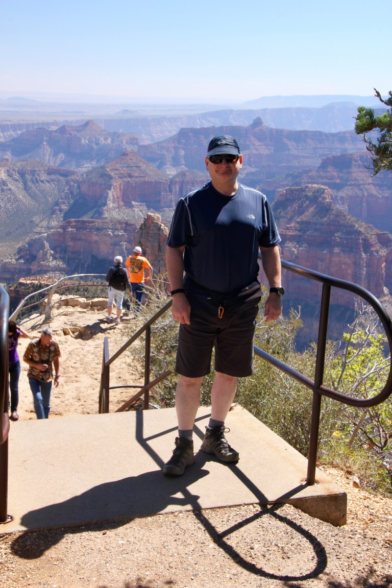 Finally we reached the end of the road and walked the paved trail, firstly to Angels Window, and secondly to Cape Royal. The views of Wotan’s Throne and the Vishnu Temple were great, and it was good to look across to the south rim and see places we are familiar with: the Palisades of the Desert, the Desert View Watchtower, Grand View and the Horseshoe Mesa, and right around towards the South Kaibab trail.