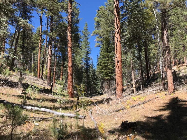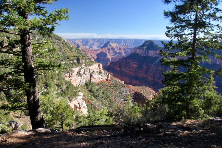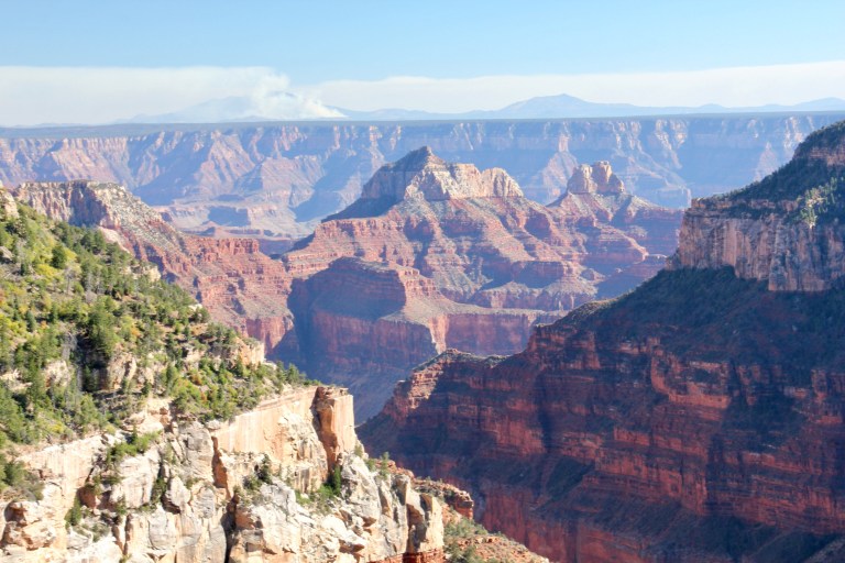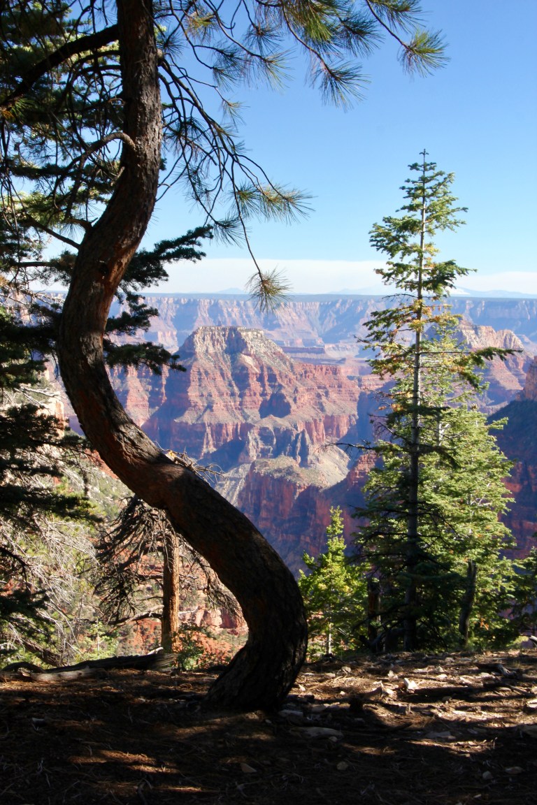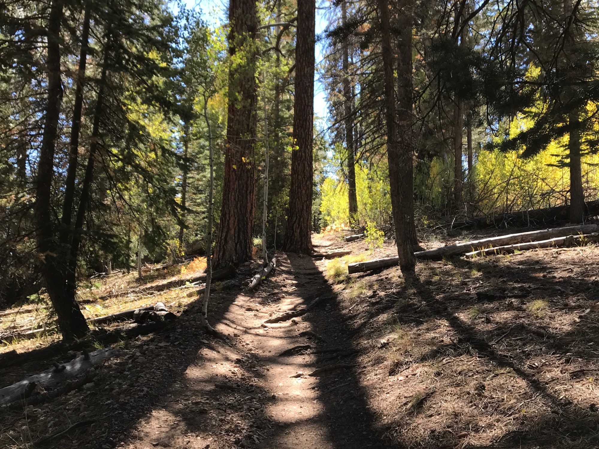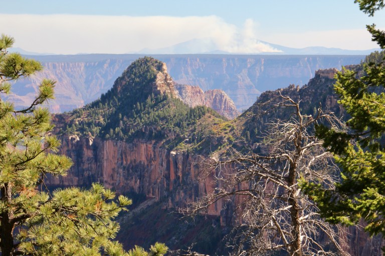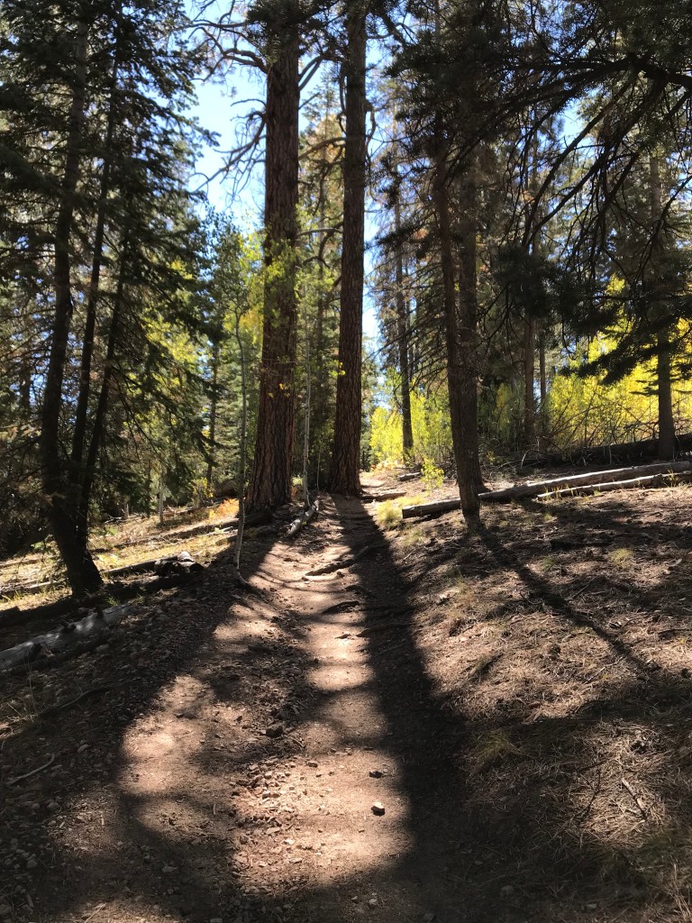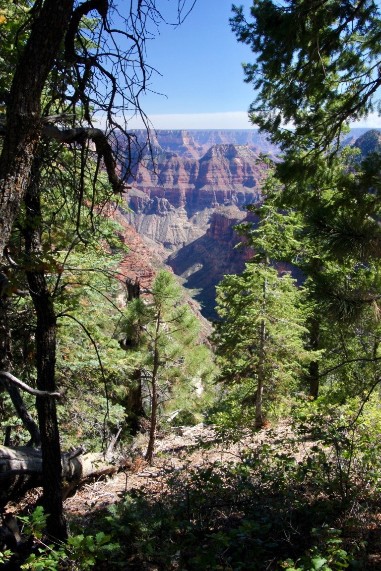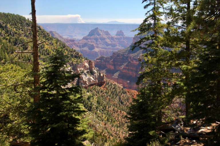 Still, it was lovely walking through the forest. The scent of the pines, the aspens shining away…truly lovely. After three quarters of a mile we got our first vista of the canyon. From then on, the trail would wind up and down and into the woods and back to the rim, providing frequent glimpses of the canyon through the trees and occasional full panoramic views. Two wildfires were visible on the south rim plateau, possibly in the Kaibab National Forest, which appeared to increase in ferocity during the day. Smoke billowed high into the sky, luckily for us blowing away to west and not filling the canyon.