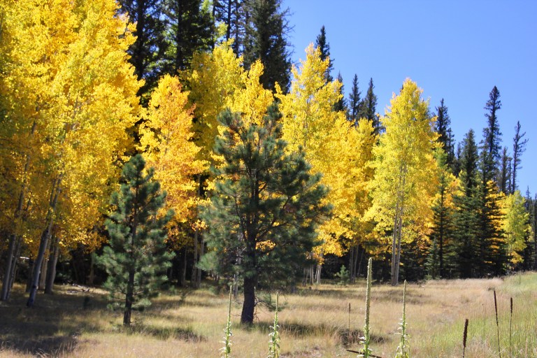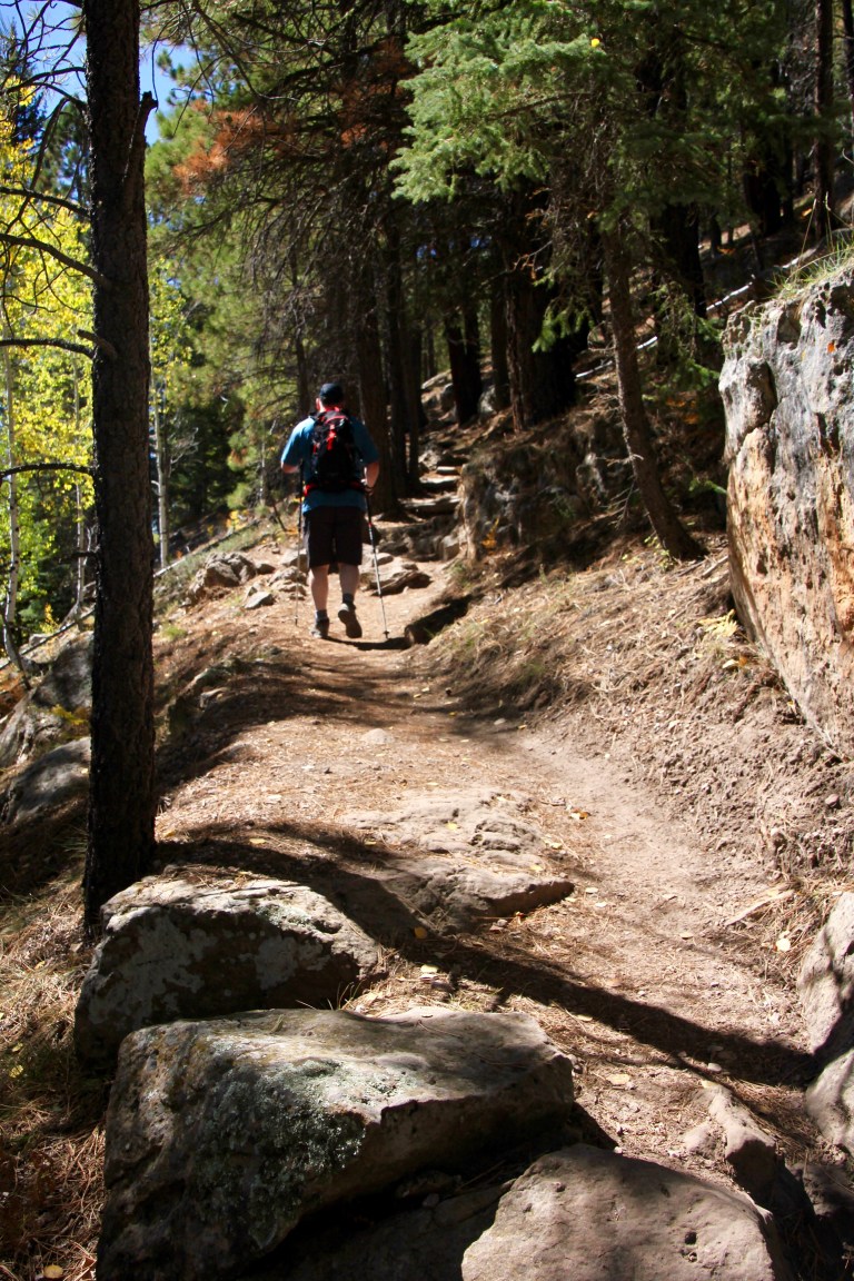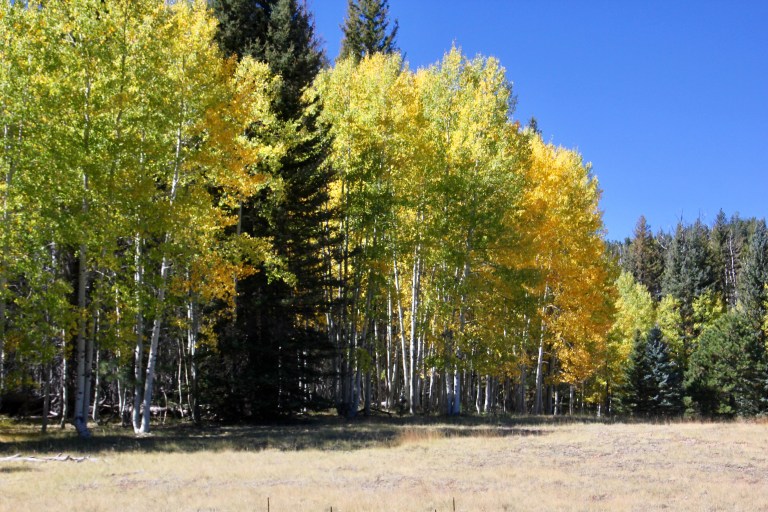 The sky was still blue, the sun shining again and we had the same good breakfast. After getting ourselves and our packs ready we headed down the road to the canyon. We stopped at a pull out I had noted yesterday to take pictures of the aspen trees. Just a few days ago these were mostly green and yellow, now they are already yellow and orange, shimmering in the sun.