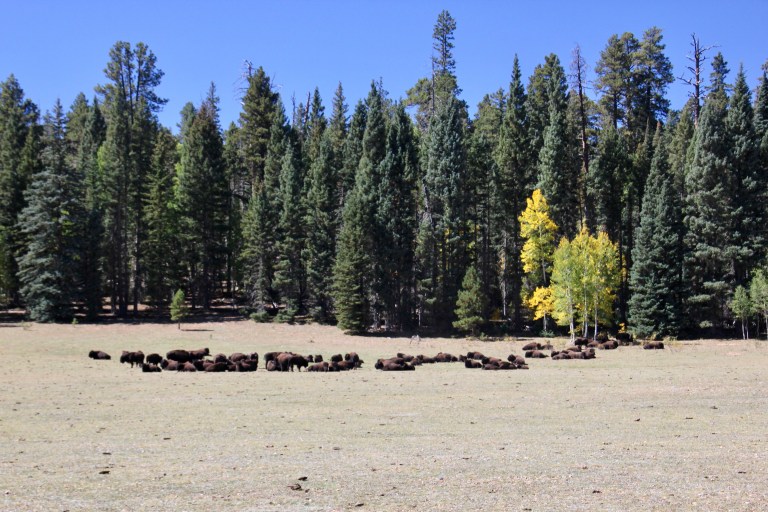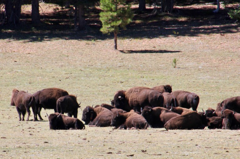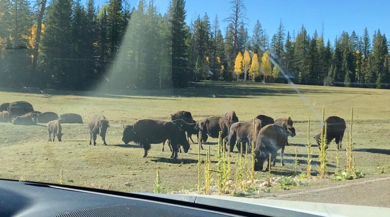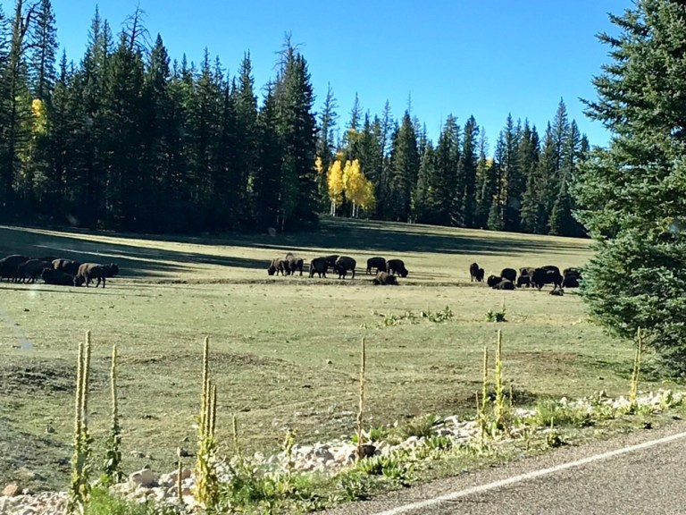 … before carrying on. In one of the large meadows was a herd of bison. These didn’t appear to be as large as the Yellowstone variety.
