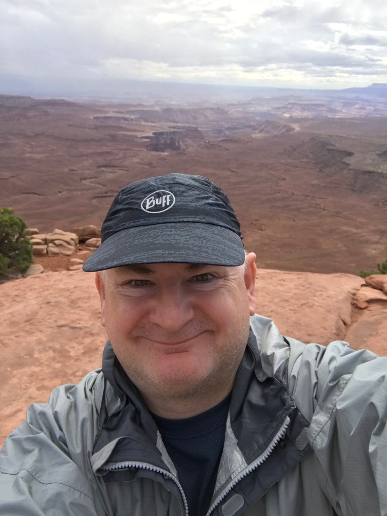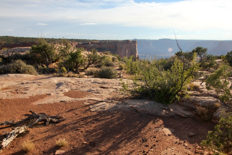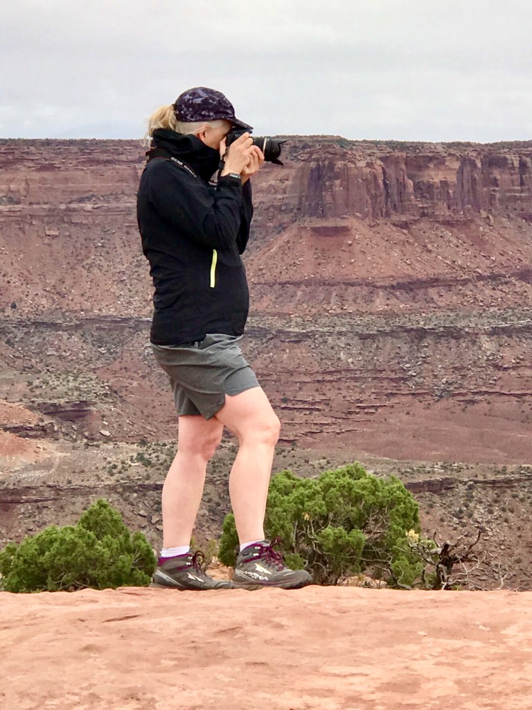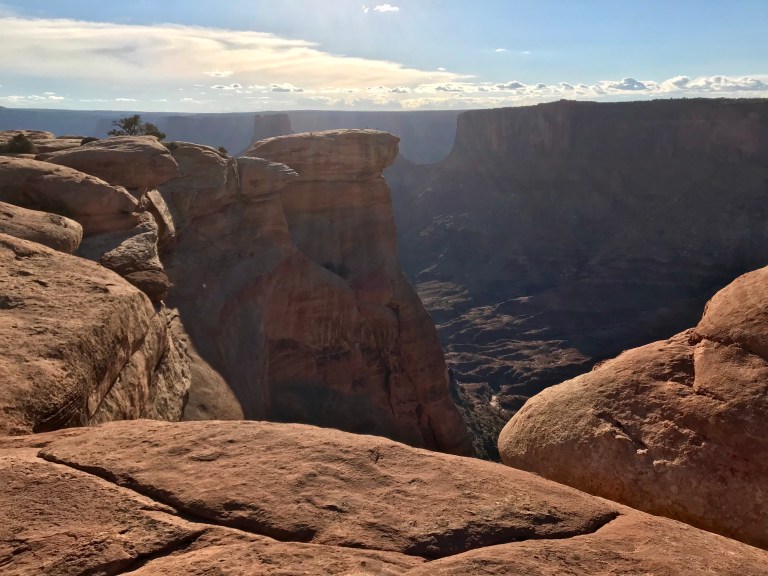 We left Canyonlands and went to Dead Horse Point state park, which is on the same Mesa. We have never hiked to Big Horn Overlook and so that is what we did. It starts at the visitor centre, crosses to the west and then follows around the edge of the canyon. It was a good hike, although completely the wrong time of day for photos as we were looking straight into the sun. The trail ends by going out along a series of sandstones fins, requiring some steep up and down, adjacent to a vertical drop off of a thousand feet off so. It was do-able, but our legs were tired and so we gave this final 50 metres a miss, instead returning to the car before sunset. We only passed one other couple the whole time, so again, we had found the peace and quiet that we enjoy. A total of about 6.8 miles hiked today.