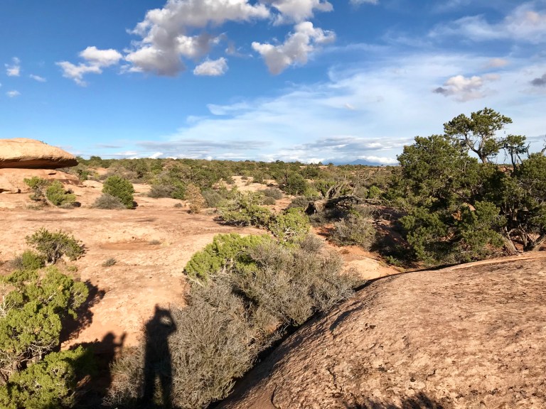 After passing through the entrance station (no queue) we approached the visit centre and it was busy with no parking spaces. We didn’t need it, luckily. We pulled in to the Mesa Arch car park, which is a ‘main attraction’. We only wanted to use the toilet, but still had to queue for that! I was now worried that we wouldn’t get parked at the trailhead for our chosen hike, because it is only a small area accommodating up to 8-10 cars, depending upon how well they have parked. When we got there, though, there were only four other cars – success!