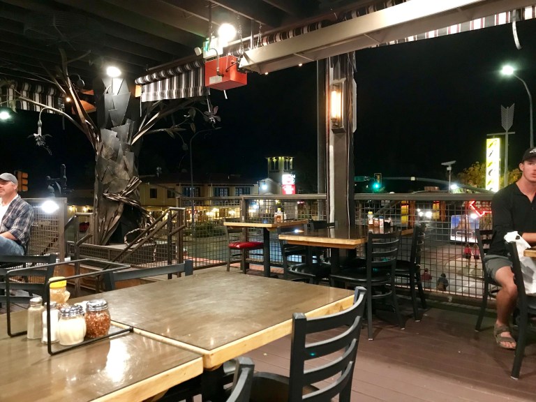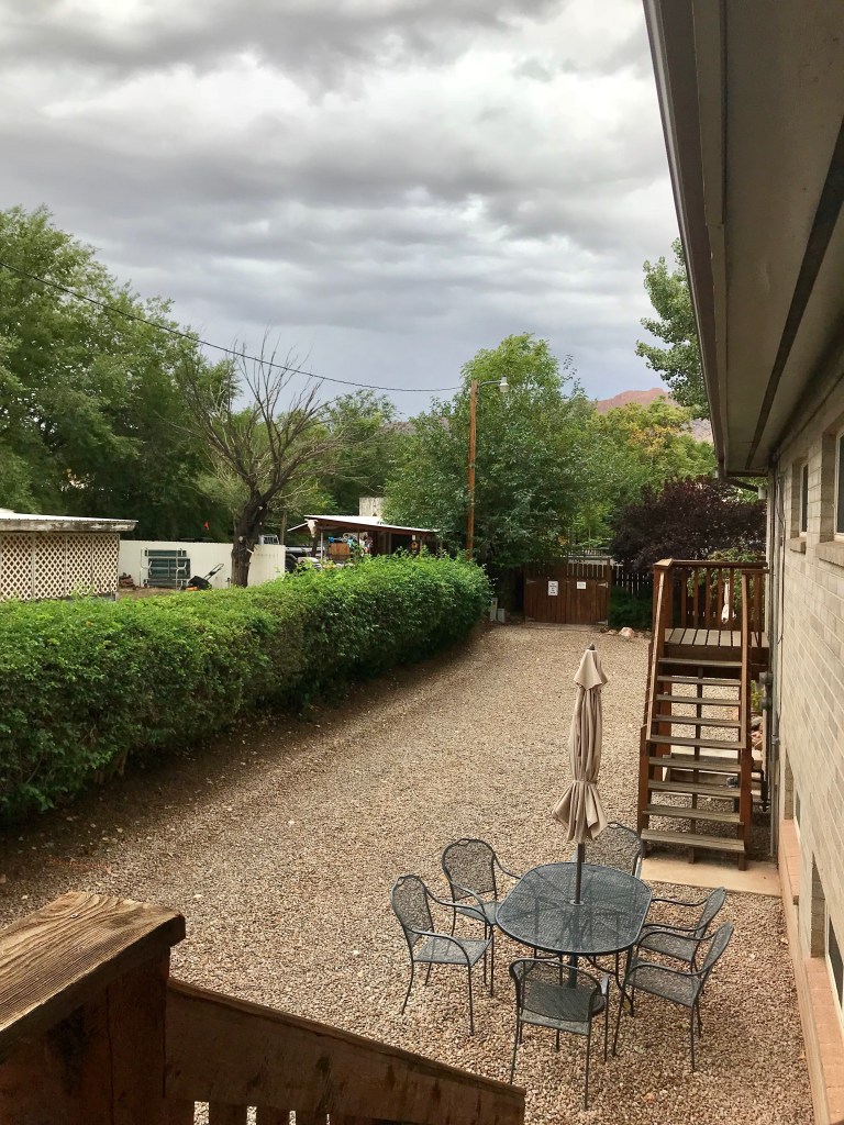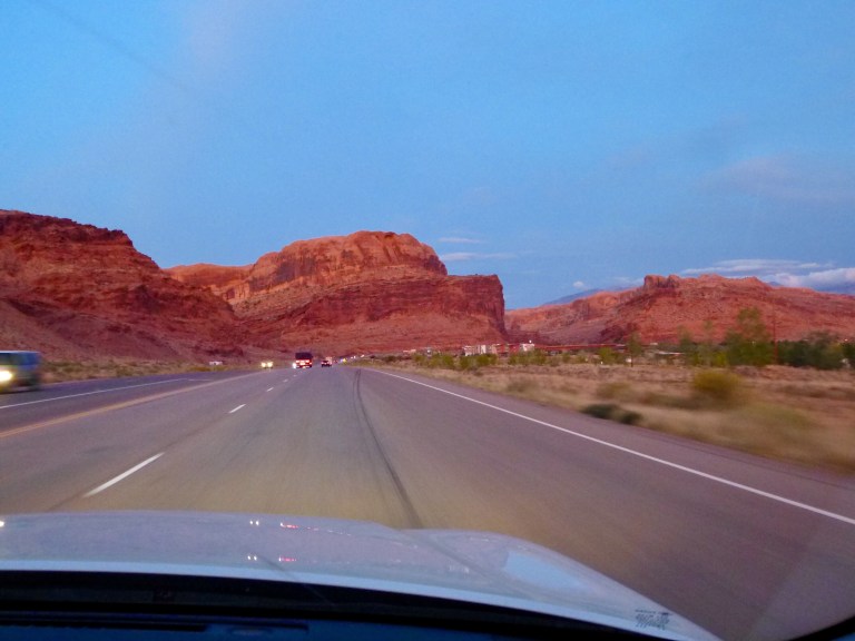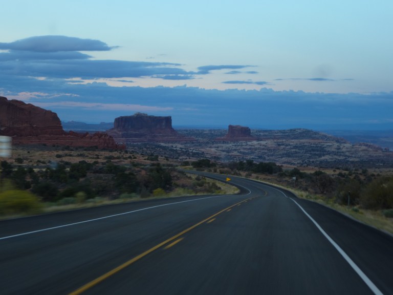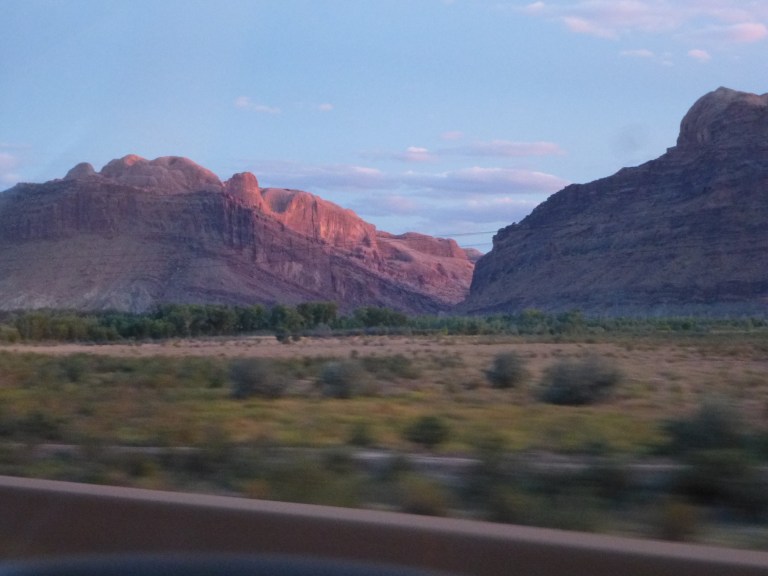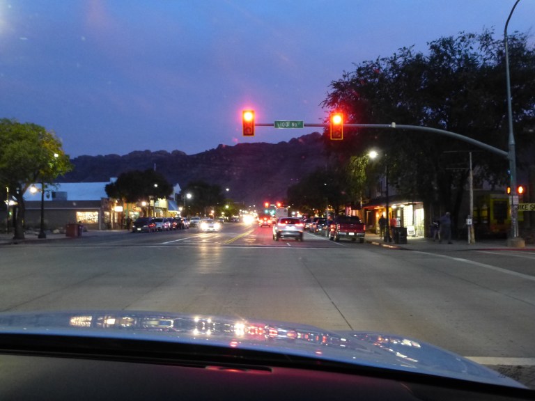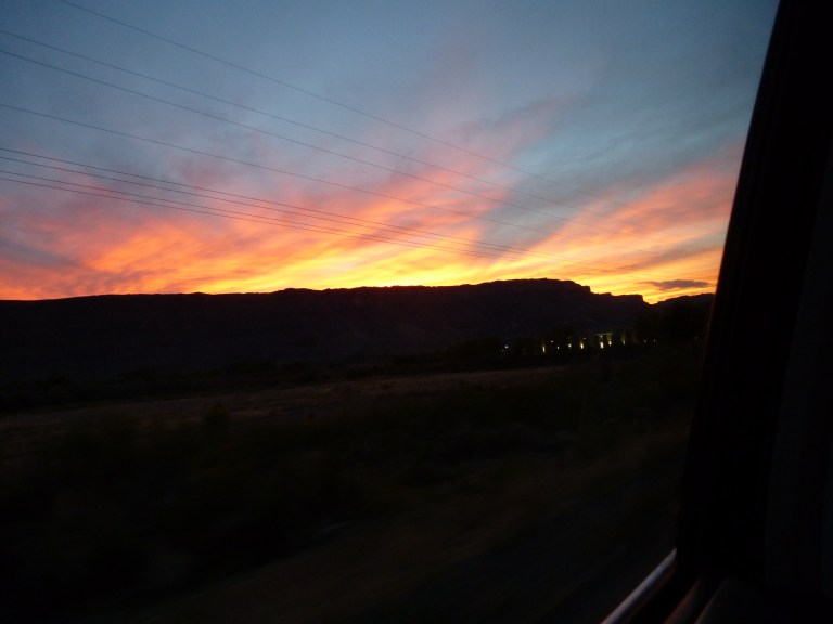 The sunset was not going to be impressive as the sun was dropping behind thick cloud so we returned to Moab. The clouds did turn pink and then orange along the way, making the red rim rocks glow. We quickly called in at the City Market for more eggs and milk and then it was back to out flat for a quick change before going back to Zax’s. It was getting a bit late, but we waited a few minutes and got an upstairs table just to see what it was like!