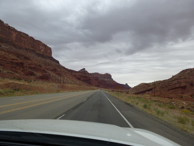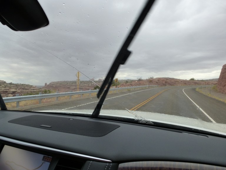 After that we drove up to Canyonlands. On our way we passed the entrance to Arches National Park. We have seen photos of really long queues to get in, but never had more than few cars in front of us when we are here…today the queue must have been over 30 cars long in two lanes. No wonder they are consulting on a permit system. I was then a bit worried about how busy Canyonlands would be, although I hoped the weather would make it less attractive. The rain started again as we drove towards the park. We stopped briefly at the Monitor and Merrimack, rain obscuring distant views. A good job we did the mountain loop drive yesterday because the tops were in cloud today.