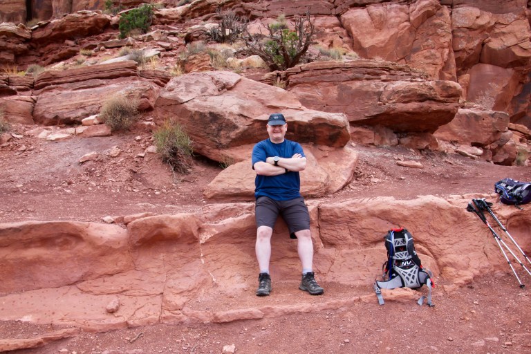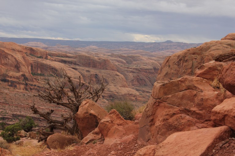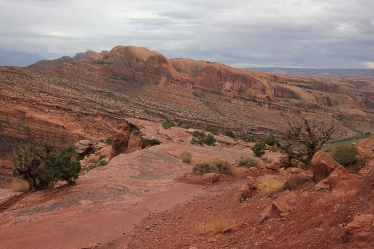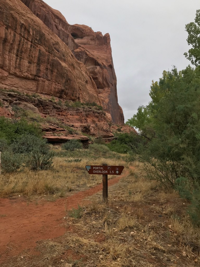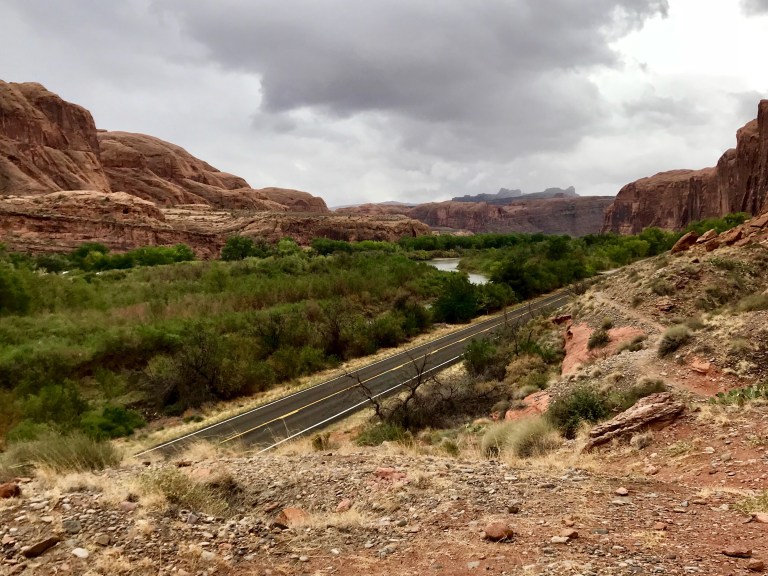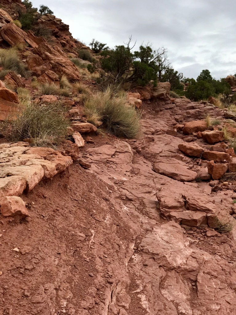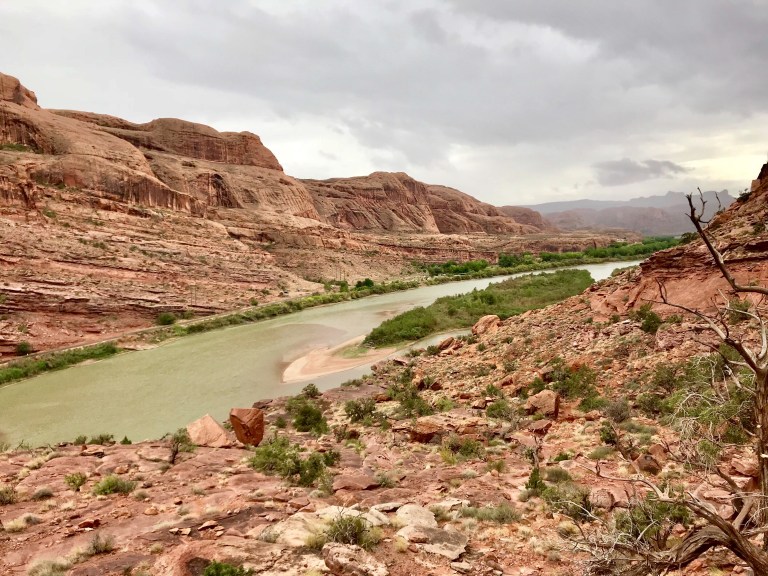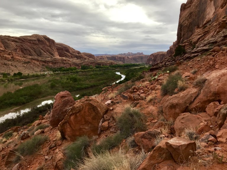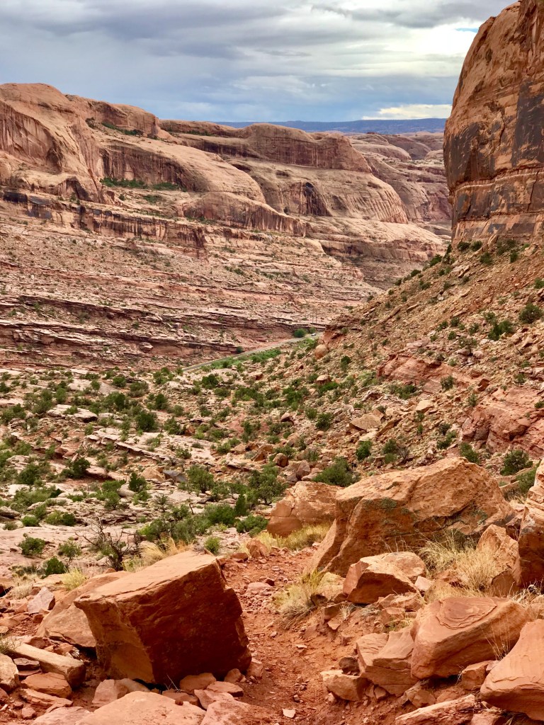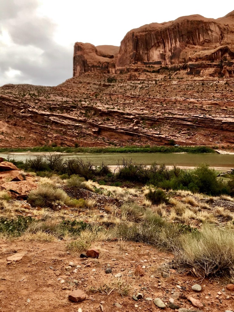 We drove down Potash road and stopped at the Jaycee recreation site, which is the trailhead for the Portal Overlook trail. We set off, through deep undergrowth… ! The trail soon cleared this area and started to climb as it paralleled the Colorado River. We got good views of the rain coming! All of the en route photos are taken with Andrew’s phone, as I kept my camera out of the rain and in my pack. We could hear and see jeeps and buggies climbing the rim road opposite.
