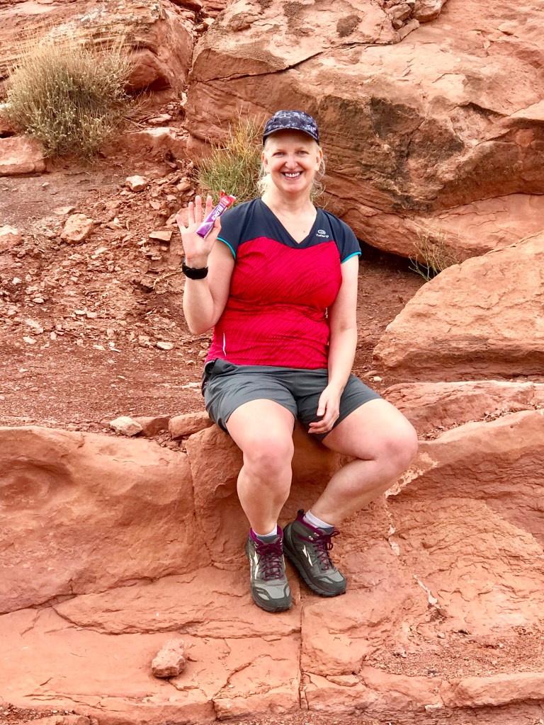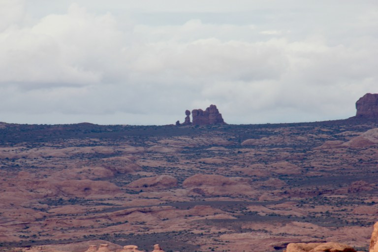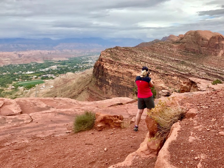 Jackets were off, on, off, on, off…and then we left them off as the climb steepened and it was too hot to wear them, regardless of the rain. Luckily this was only occasional light spots by now. Route finding was mostly ok, but we did lose the trail once. We realised quite quickly, as there were no other footsteps, so backtracked and found the right way. The climb was very tough but eventually we reached the top and an Overlook of Arches, the river and Moab. We could spot Balanced Rock, South Window (?), Courthouse Towers, our road in Moab and the City Market, which I could pick out with my camera’s zoom. We ate some Shotblock, shared a muffin, and then began the descent, which was dry and getting warmer.