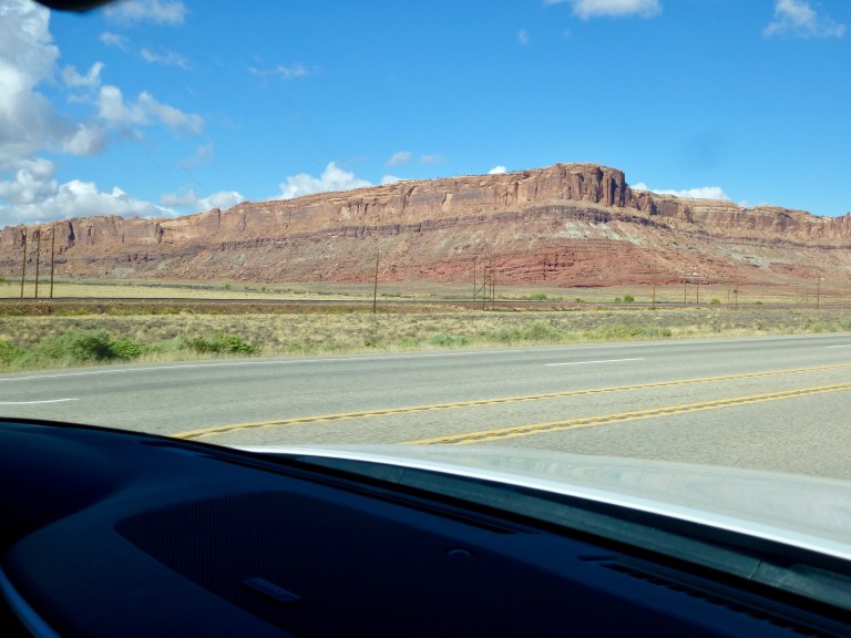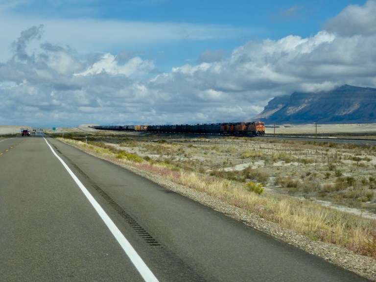 I drove the first section, past the queue for Arches, the red rock cliffs, the open golden cliffs as we headed to I-70. Past a train (3 engines pulling, 2 pushing).
