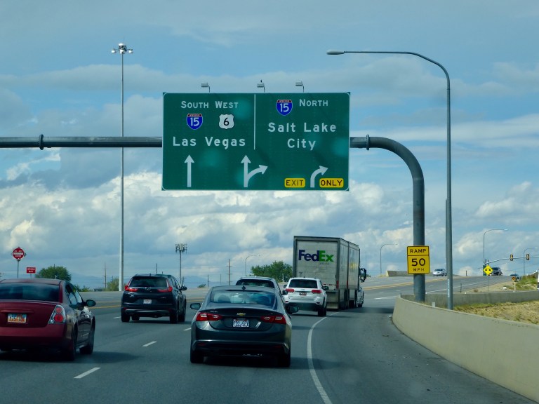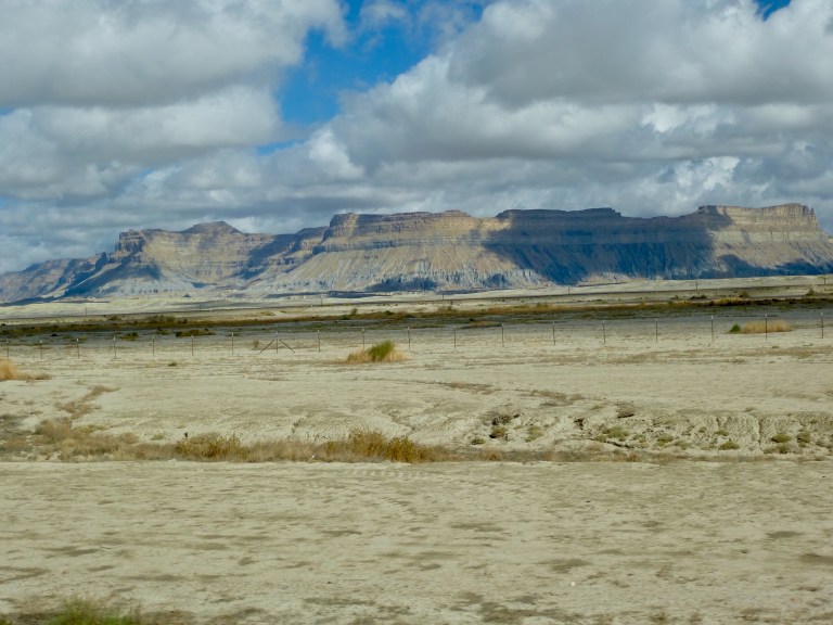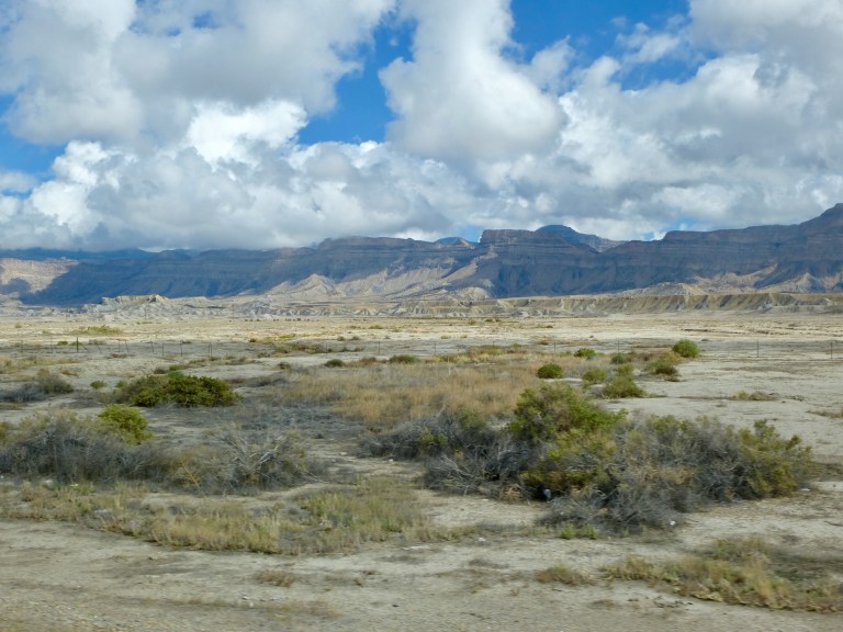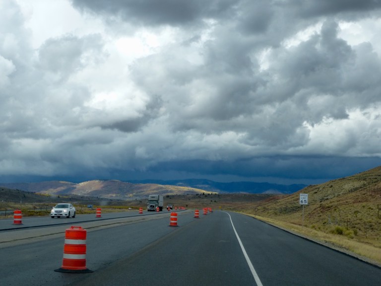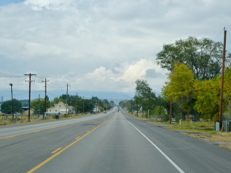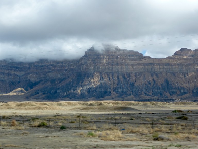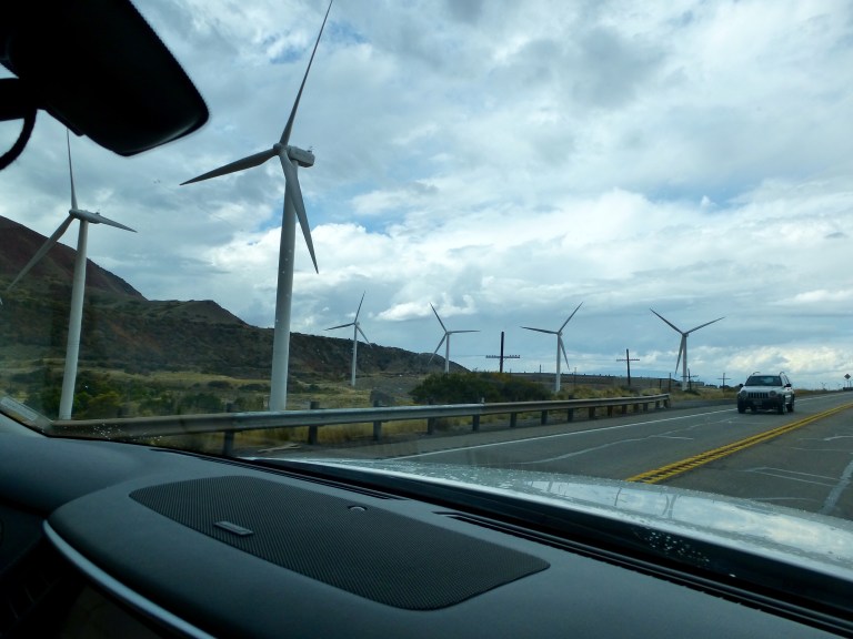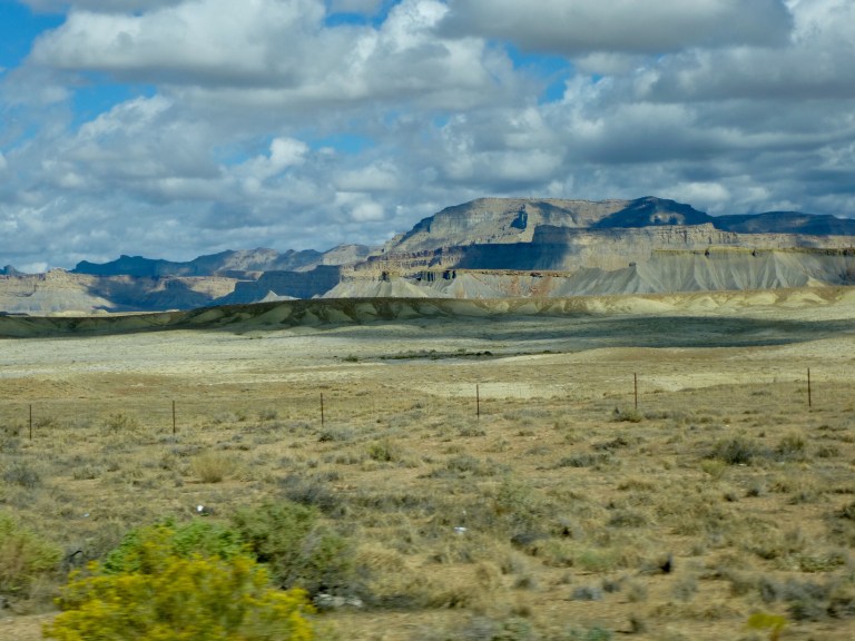I handed over to Andrew at Horse Canyon View rest area. Now, we have an almost standing joke that, if we get bad weather on our journey, you can bet that I’m doing the driving. Today was the exception to that rule. When we left Moab it was hot and sunny. Perhaps I should have checked the forecast before packing the coats in the case. As we past Price, the skies got dark and before long, there was a double-speed wiper type of downpour. So much so, that in one place a flash stream forming at the side of the road was washing away the hard shoulder (didn’t manage to get a photo of that!).