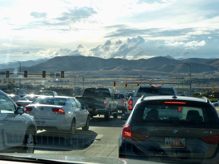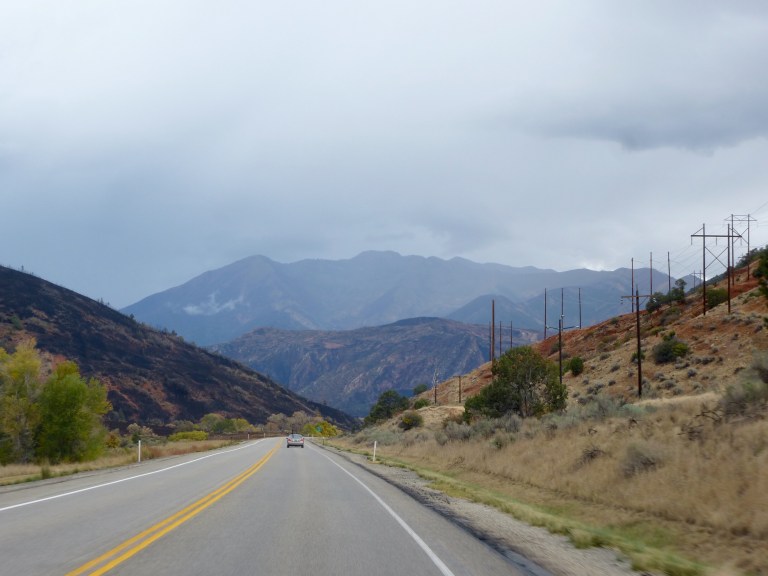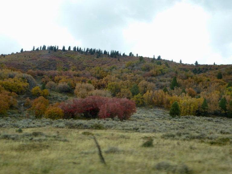 As we came out of the rain, we came through the mountains and over the Soldier Summit at 7,300 ish feet. We went through an area where one side of the road was completely burned (and still smelled of smoke) and the other was thriving. The colours in general were beautifully autumnal.