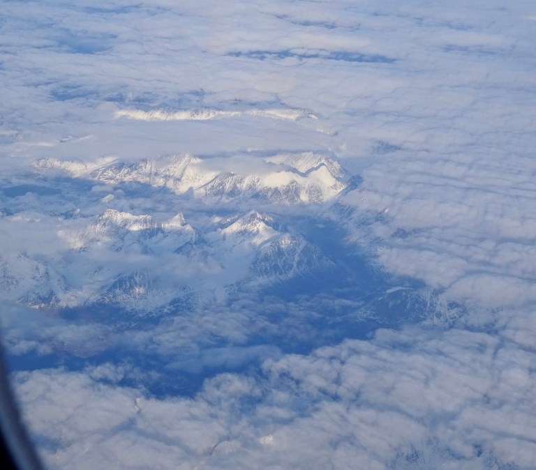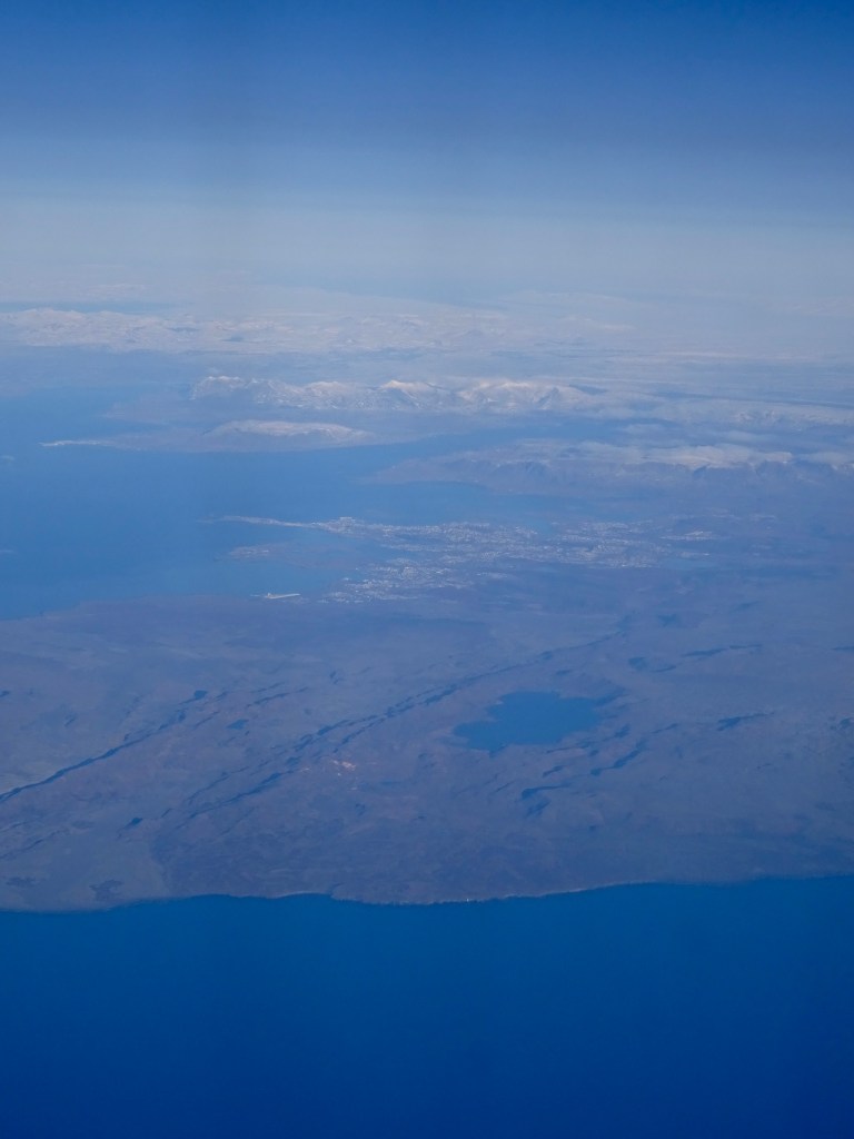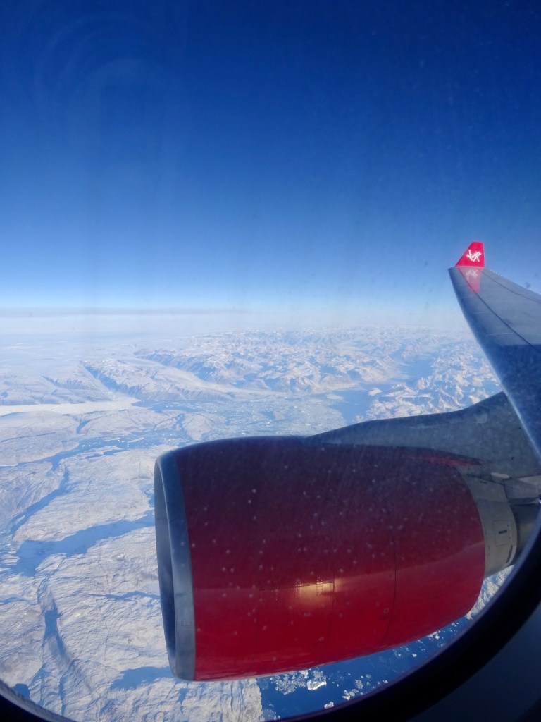 Despite this, we took off at 1140 and the captain was forecasting only a 10 hour flight time, so it was likely we would still land on schedule. We left the wet weather of Manchester and climbed above the clouds to the sunshine and soon saw a few Scottish lochs. I had deliberately chosen seats on the right hand side of the plane. Often the flight skirts the southern edge of Greenland and if you’re going to get a view you need to be on the right. Plus the other side just gets the dazzling sun making it hard to have the window blinds open. Our flight seemed to go a little bit further north than usual as today, after a couple of hours, we got to see Iceland. The mountains appeared very tall, even from 38,000 feet up. We spotted Reykjavik too.