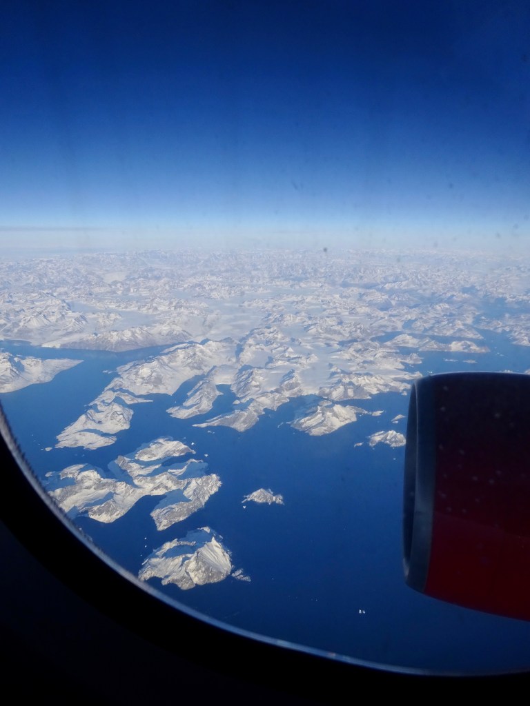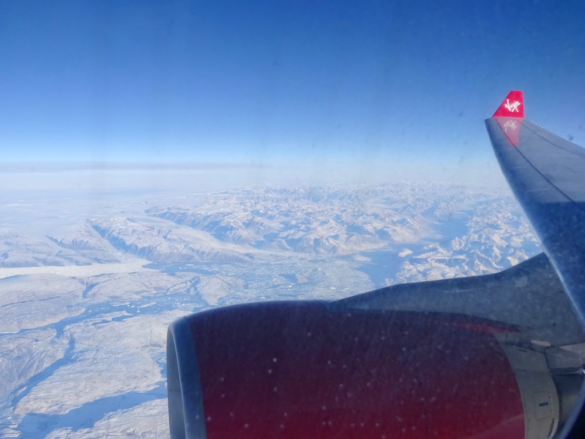 An hour later (less time than it took Andrew to drive the M6 from the Lake District a couple of weeks ago) and we were over Greenland, with its ice bergs, canyons, glaciers and mountains. The afternoon light really highlighted the landscape, although it was hard to photograph well through the layers of airplane window.