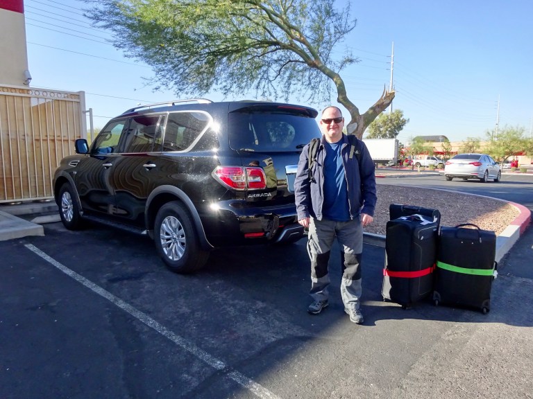 We landed just before 1325 (20 minutes ahead of schedule despite our delayed departure) and tracked to the new (to us, but we haven’t been here for three years) international terminal. It was a long walk from the plane to the customs hall, but we didn’t have to much of a wait to get allowed in to the country, and our bags were among the first out so we were soon headed to the shuttle bus stop. A bus appeared like magic almost straight away to take us to the car rental centre, where we were able to go straight to the garage because I had done the online check in. We chose a Nissan again, like last year’s, although Andrew did have a browse of the Chevy Suburban first.