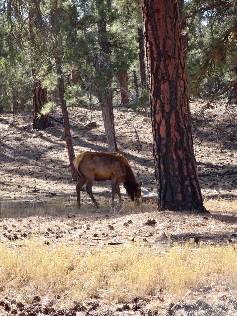 The ride goes out along a Greenway, a shared foot/cycle path from the visitor centre, past the Market Plaza and Yavapai Lodge, through the woods with grazing elk, to the Grand Canyon village. We rode past the train, parked and waiting to make the return journey to Williams in the afternoon, and then were at the start of the Hermit Road.