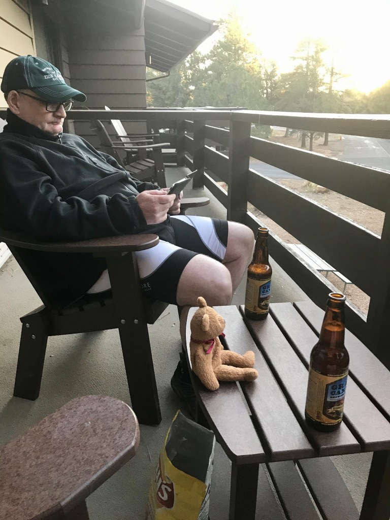 After returning our bikes (and getting our water bottles) we bought a coffee from the shop there (because all good rides need a coffee stop, even if it is at the end) and then had a browse in the Grand Canyon Conservancy shop, before returning to our room, where we replaced lost salts and calories on the balcony… crisps and beer do count as good nutrition, don’t they?…