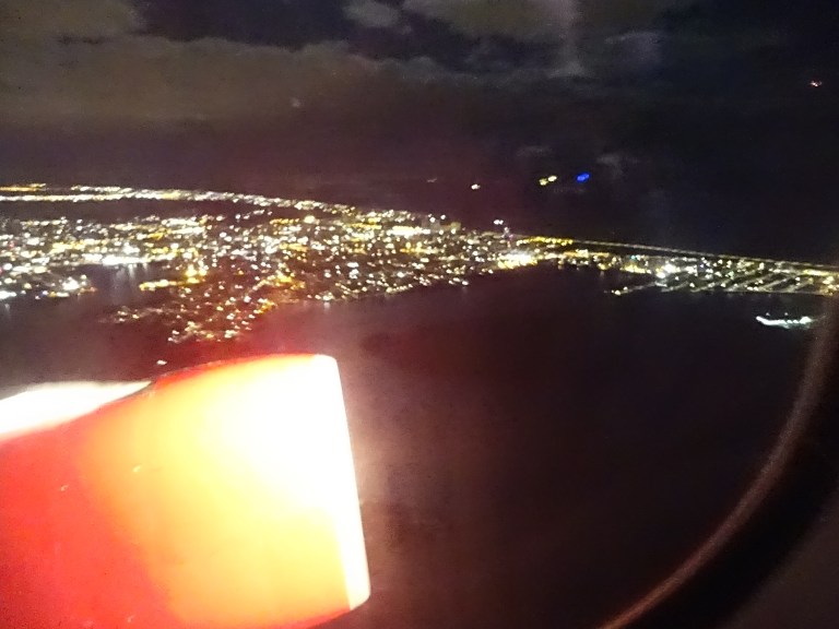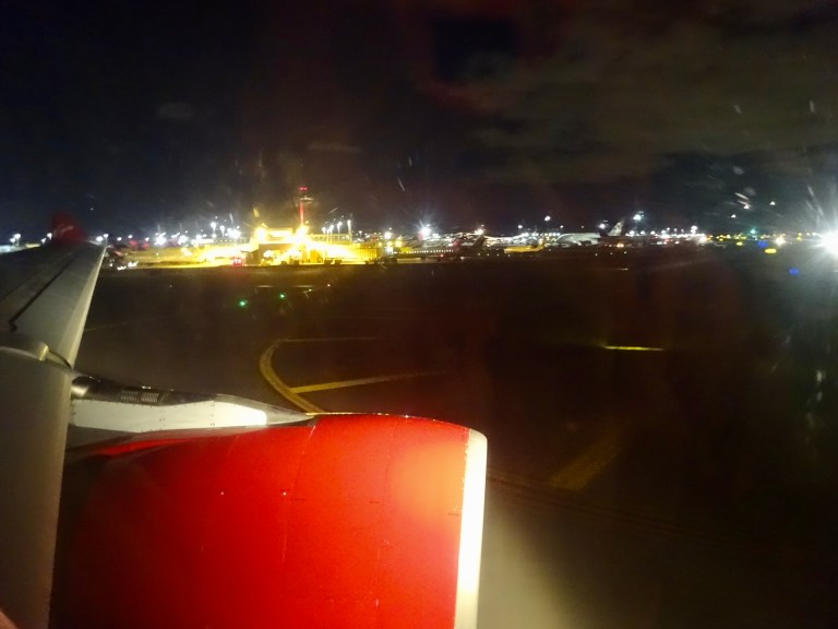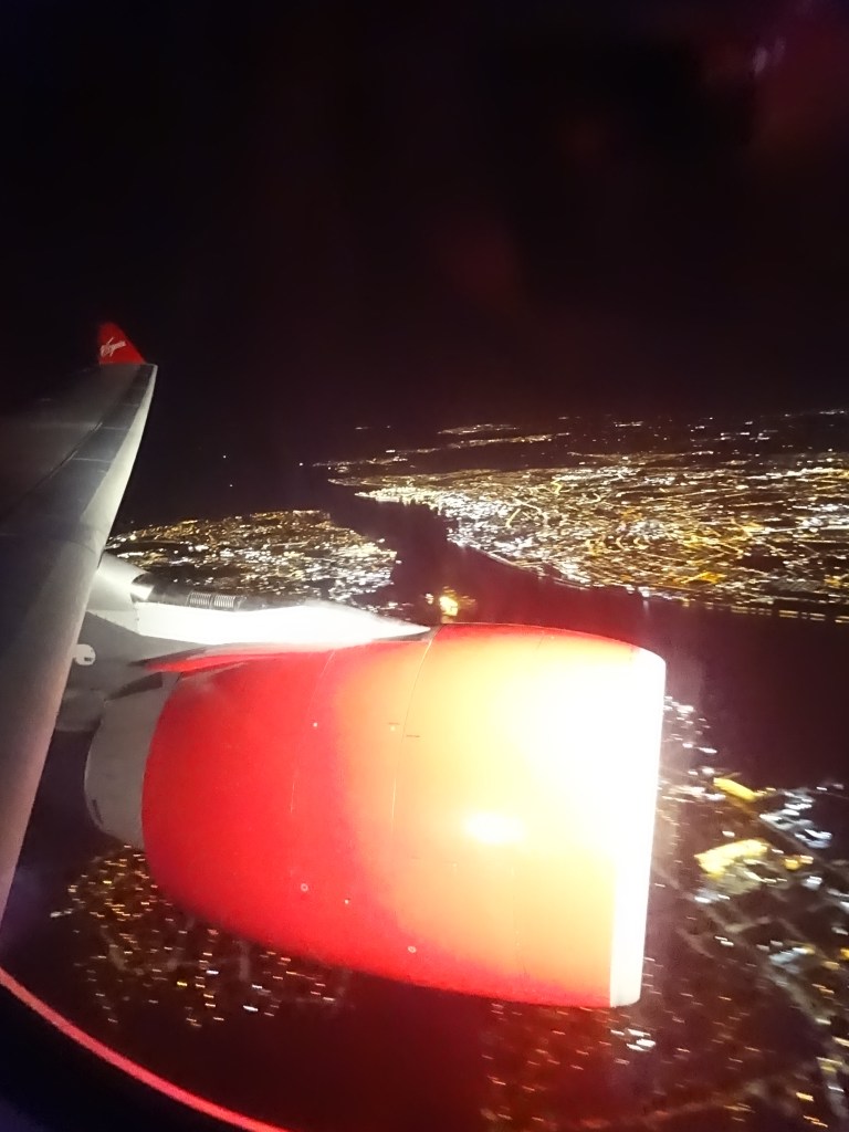 Leaving JFK, we have previously experienced long delays in waiting to take off. The pilot even warned us of this today. It was therefore quite a pleasant surprise when the engines revved up just 25 minutes after pushing back. Once airborne we had been warned of turbulence but, except for a few moments that weren’t really that bad, it was a fairly smooth flight. The reason for the possibility of turbulence was that the captain was making the most of a strong tailwind… up to 160mph. This meant that our speed got up to around 700mph and we arrived an hour early, just two movies, dinner and breakfast later, after a 5.5 hour flight time.