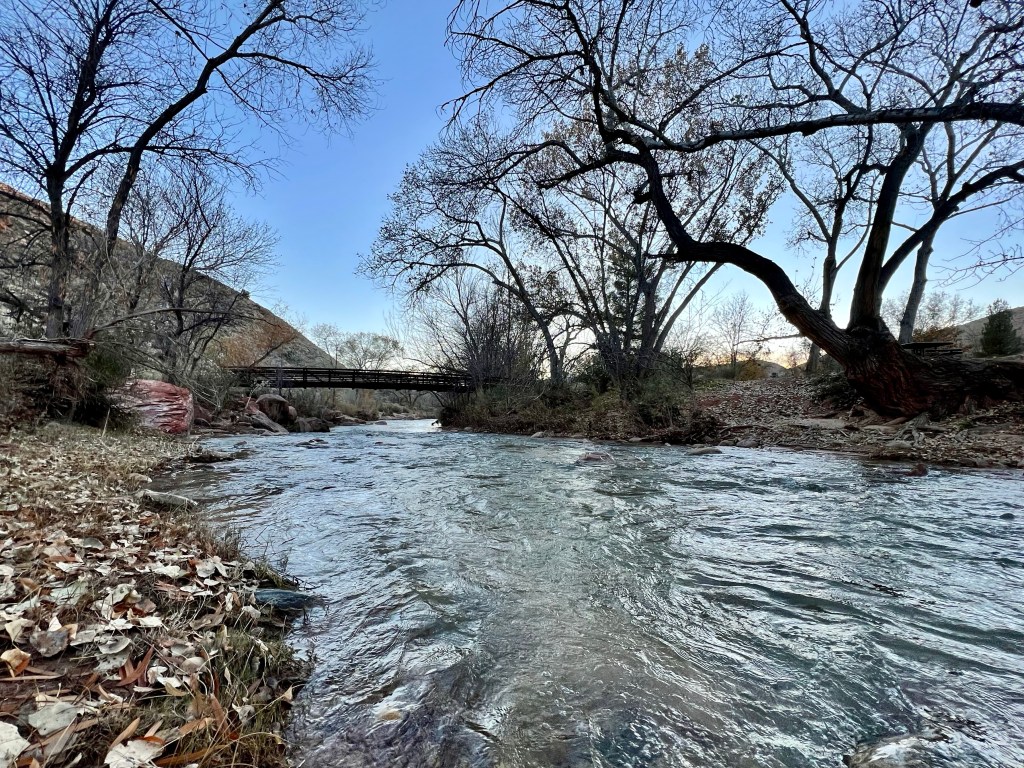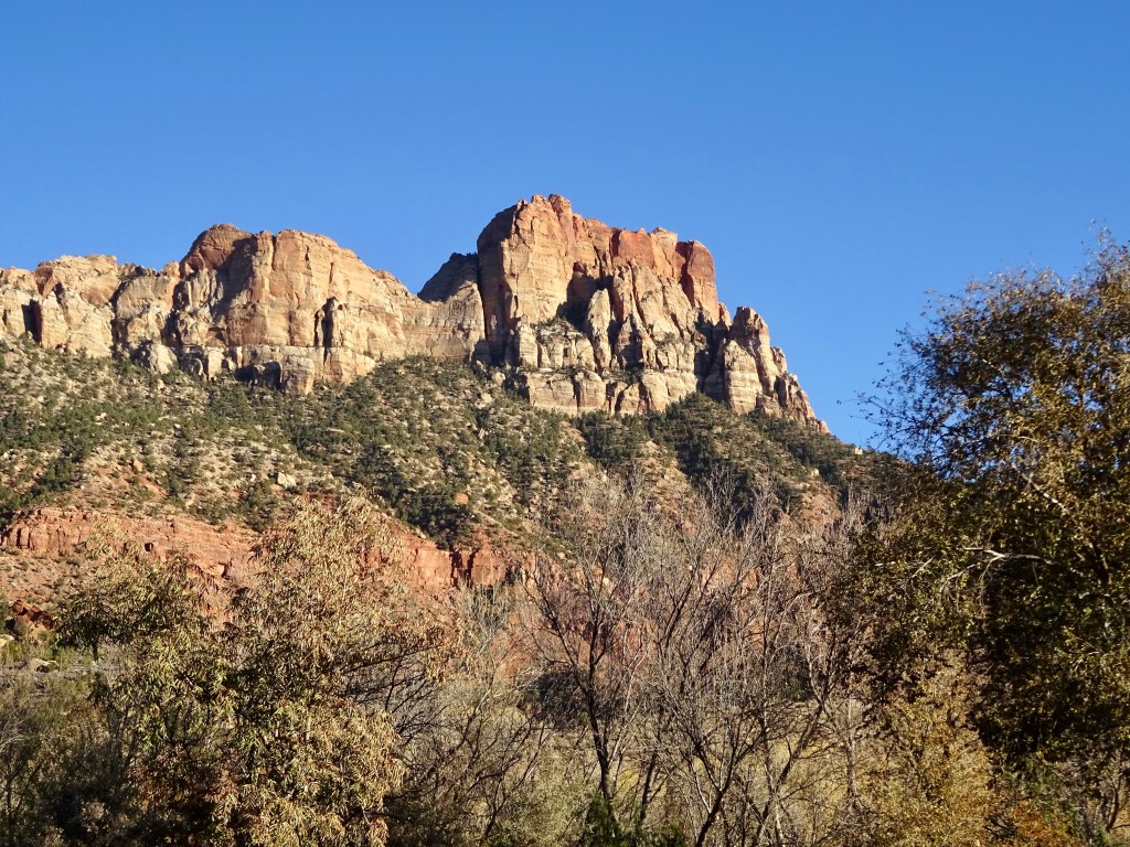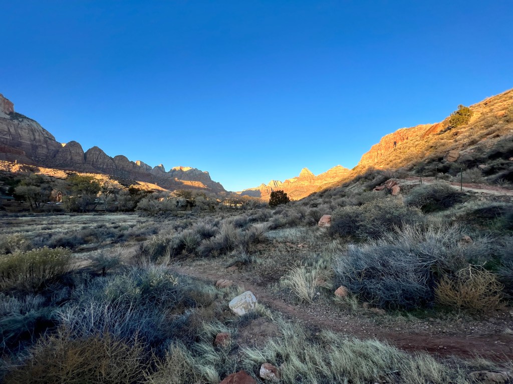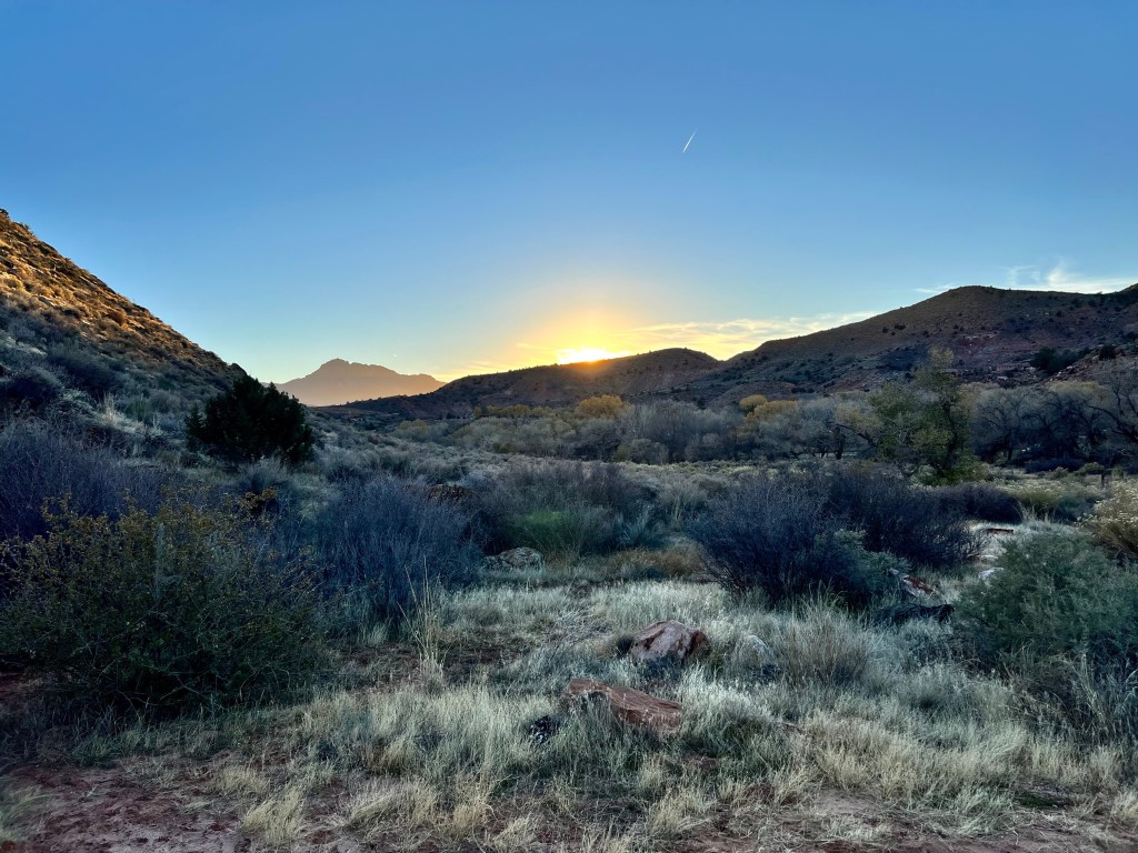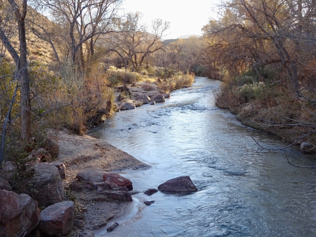 By then it was nearly 3pm (we lost an hour as we moved from Nevada to Arizona), so we checked in to our hotel and had a brief rest, before going for a sunset walk. I’d found a route from the town park, which headed up a local hill and hoped it would provide good views of both the Virgin River and the cliffs surrounding the town. I’ll let you conclude whether it did..!