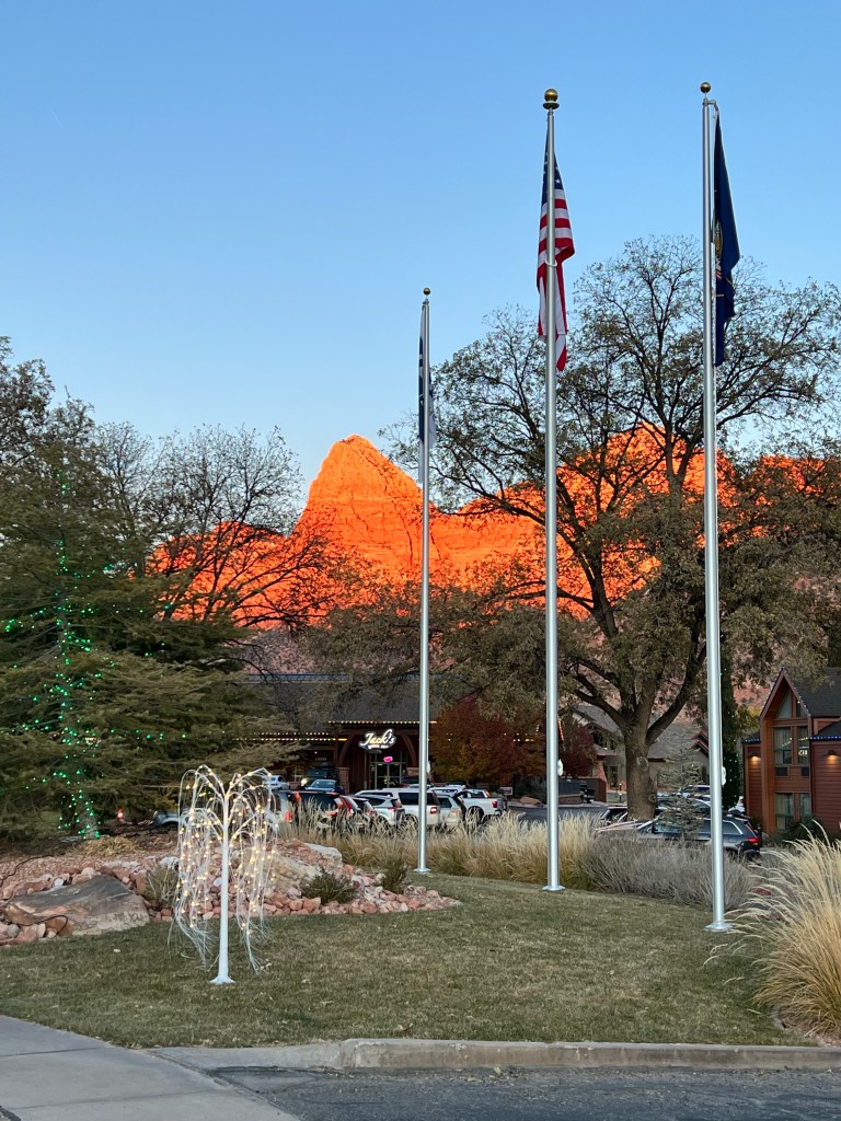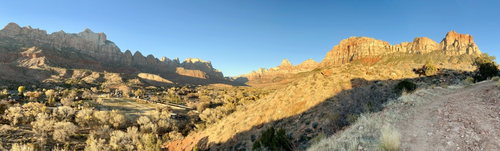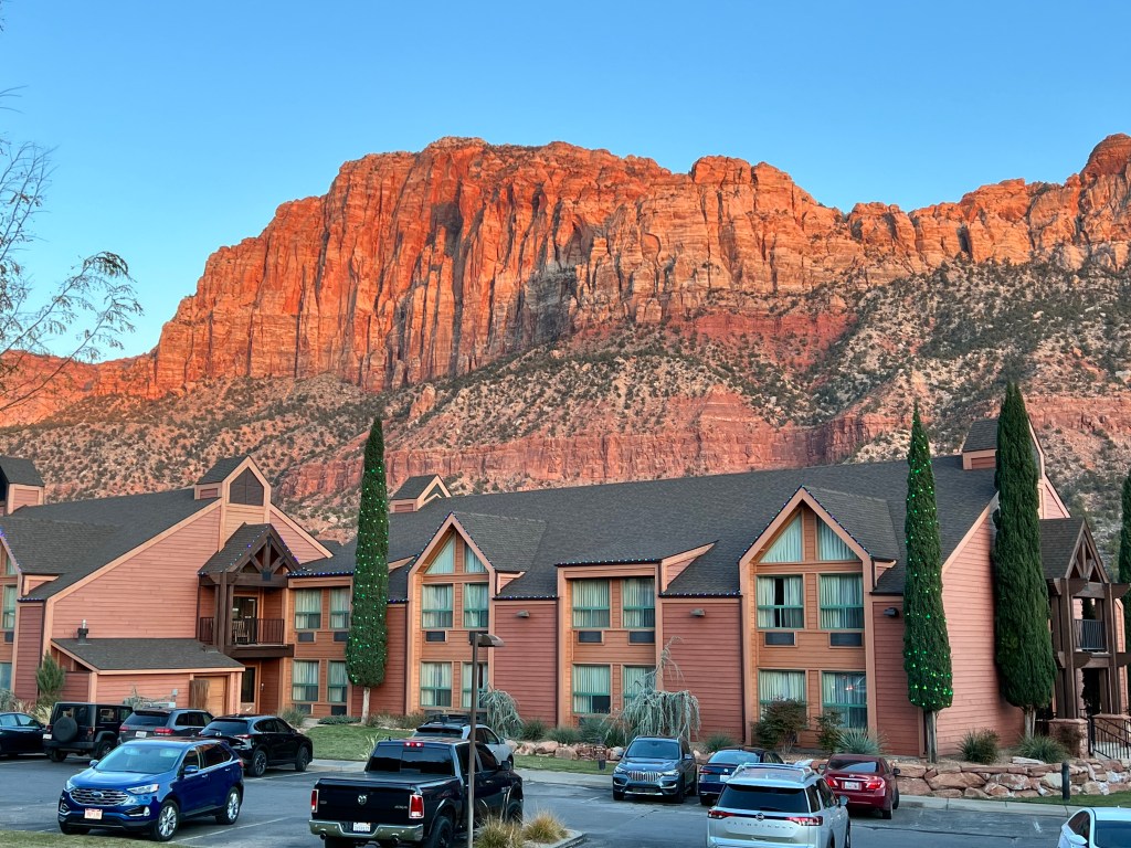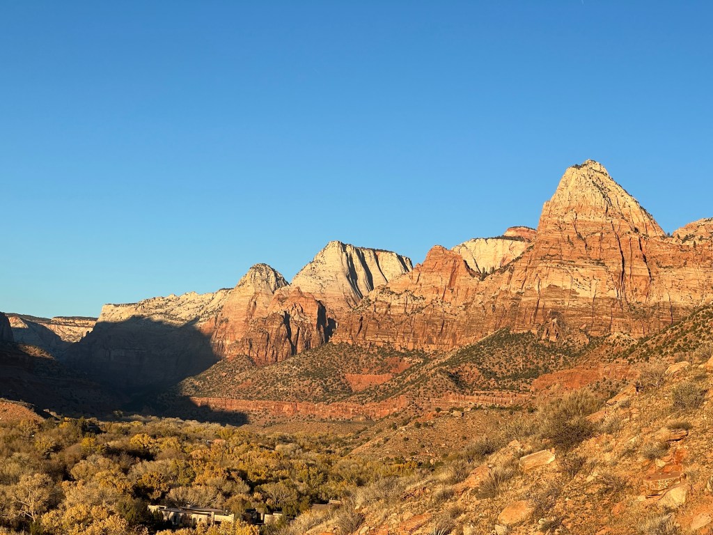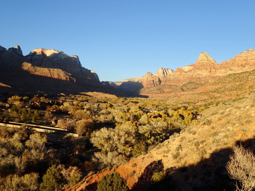 We crossed into Utah and, after a brief stop in Hurricane (the weather bearing no relation to the name, I’m happy to confirm), we drove the scenic UT-9 eastwards to Springdale, through La Verkin Virgin and Rockville. The views of the trees and cliffs make this one of my favourite routes.