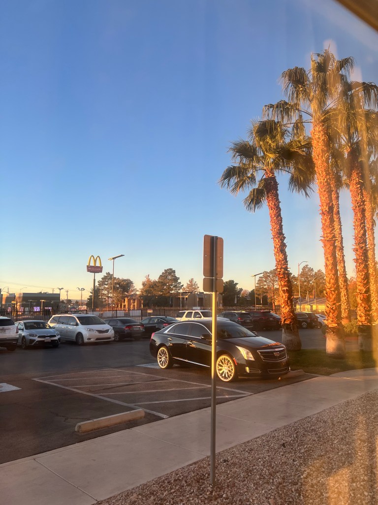 The sun rose shortly after 0630 and I got up and took a picture of palm trees in the morning sunlight before going back to bed and reading my book for half an hour, and then finishing yesterday’s blog. We got up, showered, had a light breakfast and left for Zion at 0945. I was excited simply to see snow on the mountain tops – I’m easy to please!