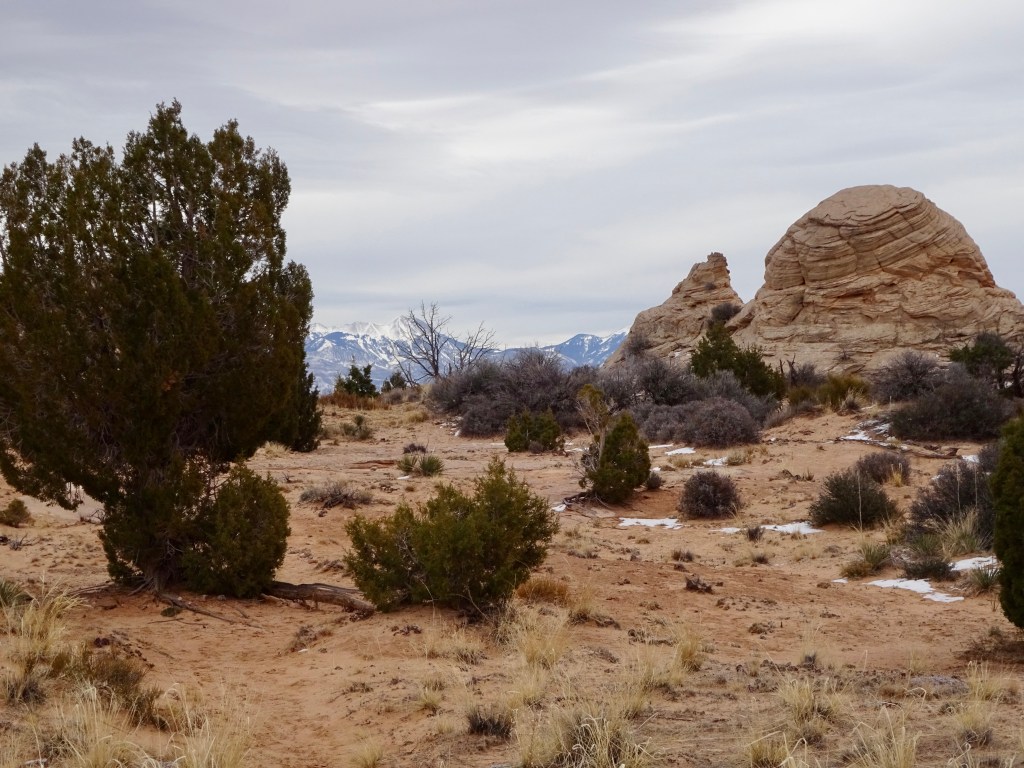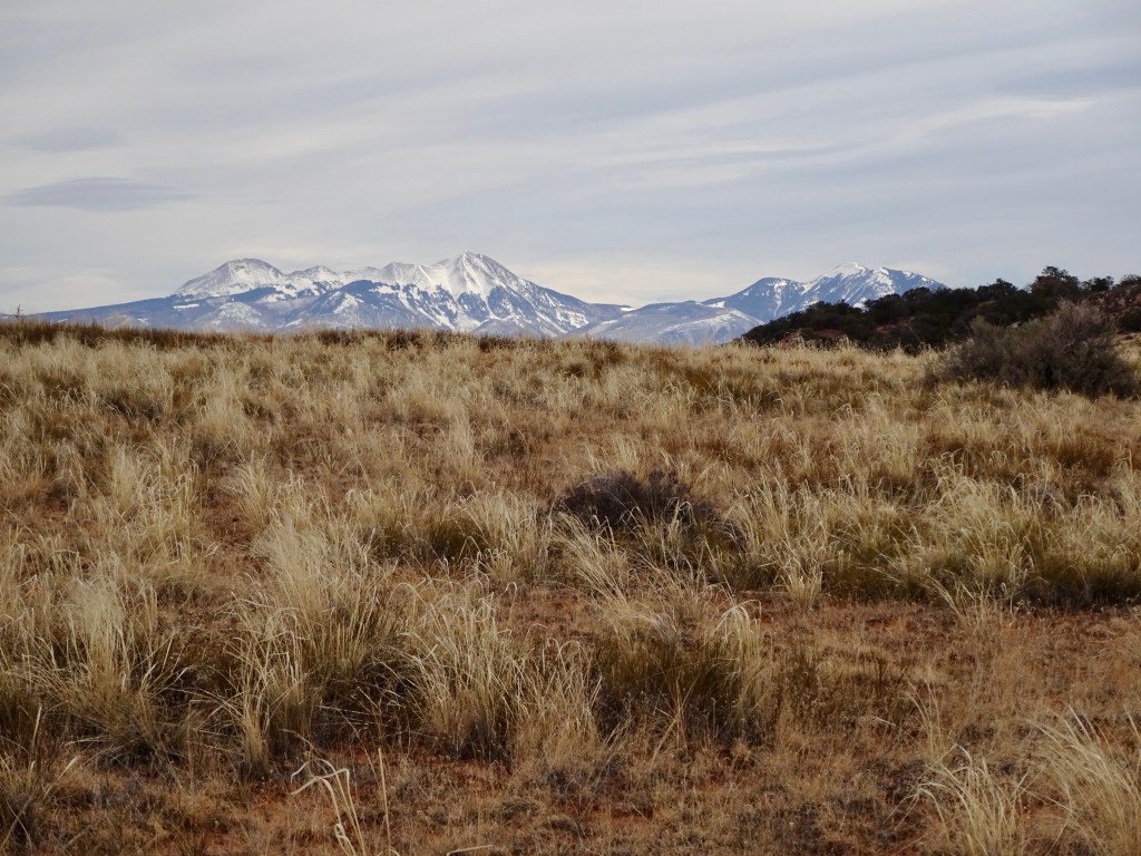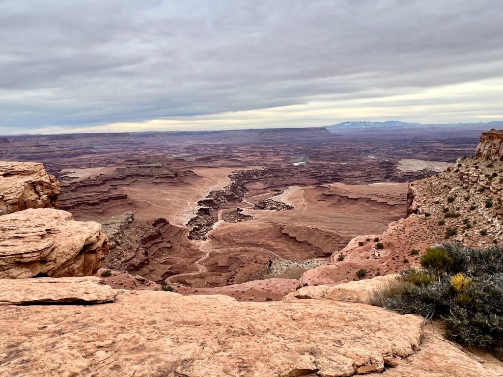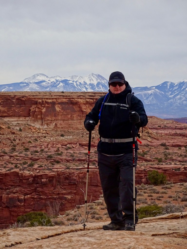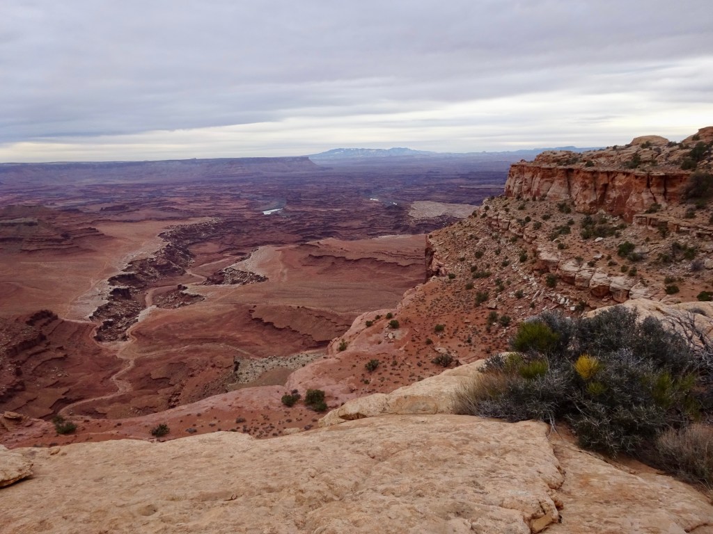 Along the way, we caught glimpses of the mountains and the canyon. Eventually, however, we reached the canyon rim and the views opened up. We could see the Colorado River meandering through the canyon, the eroded lands surrounding it, the White Rim Road far below, the snow-capped La Sals and the distant Abajo mountains.