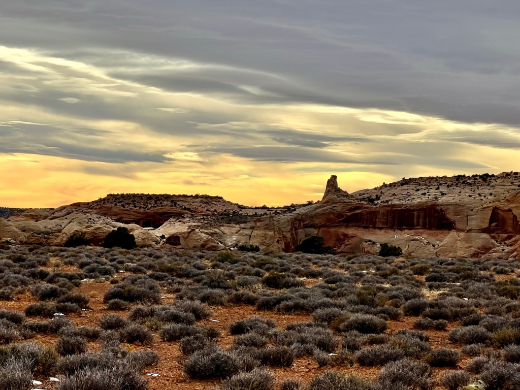 When we eventually got back to the car, we decided to drive back to Moab. The sun, which had been largely behind clouds all day somehow slipped down and found a sliver of a gap before setting, just enough to light up the rim and the mountains. We went to the City Market for essential supplies…batteries for the torch, lunch snack bars…chocolate…beer…essential supplies.