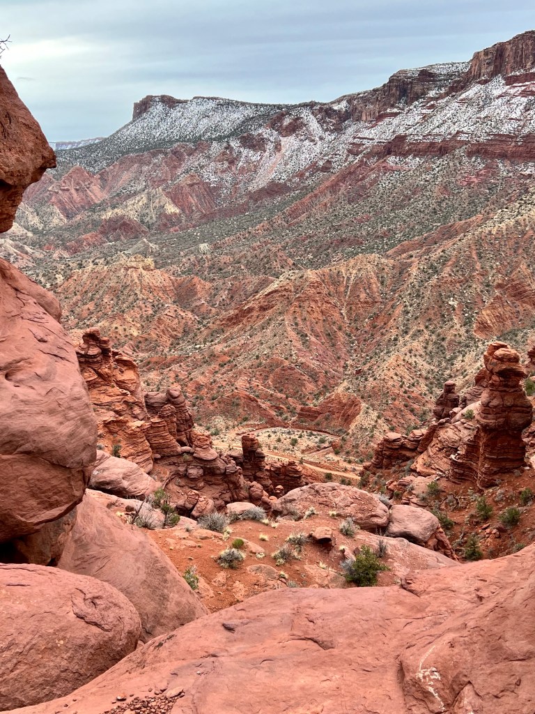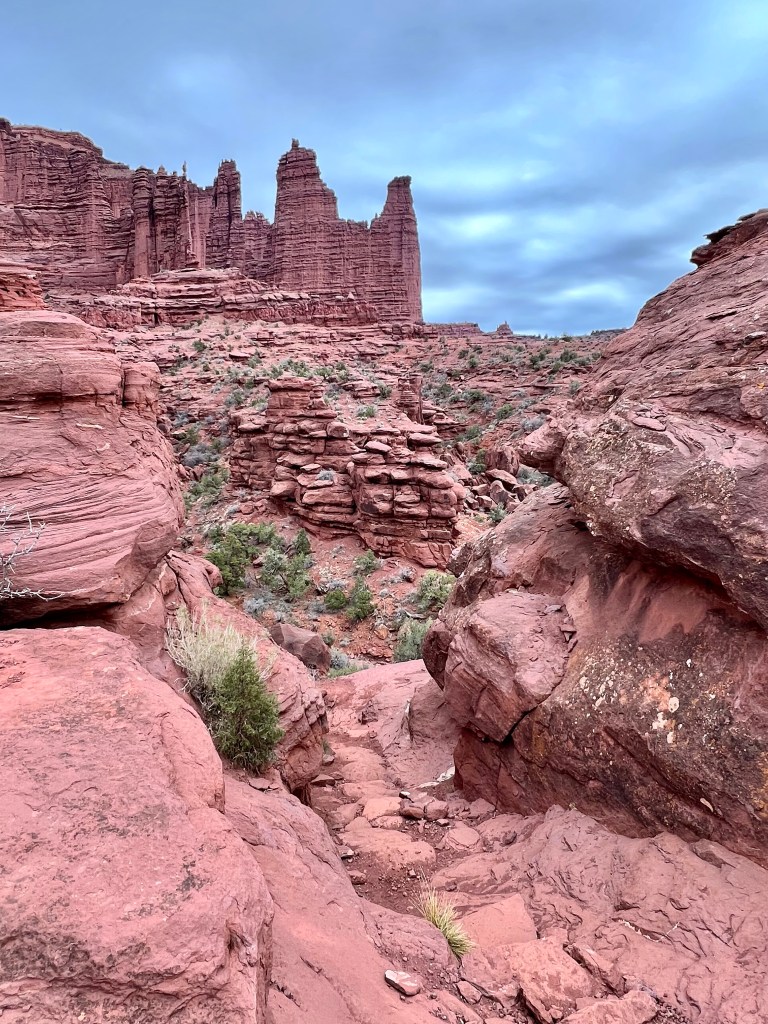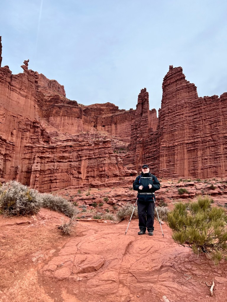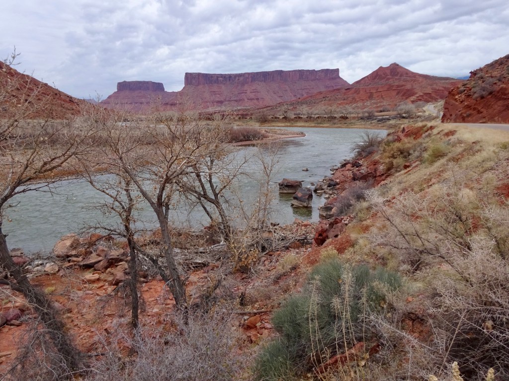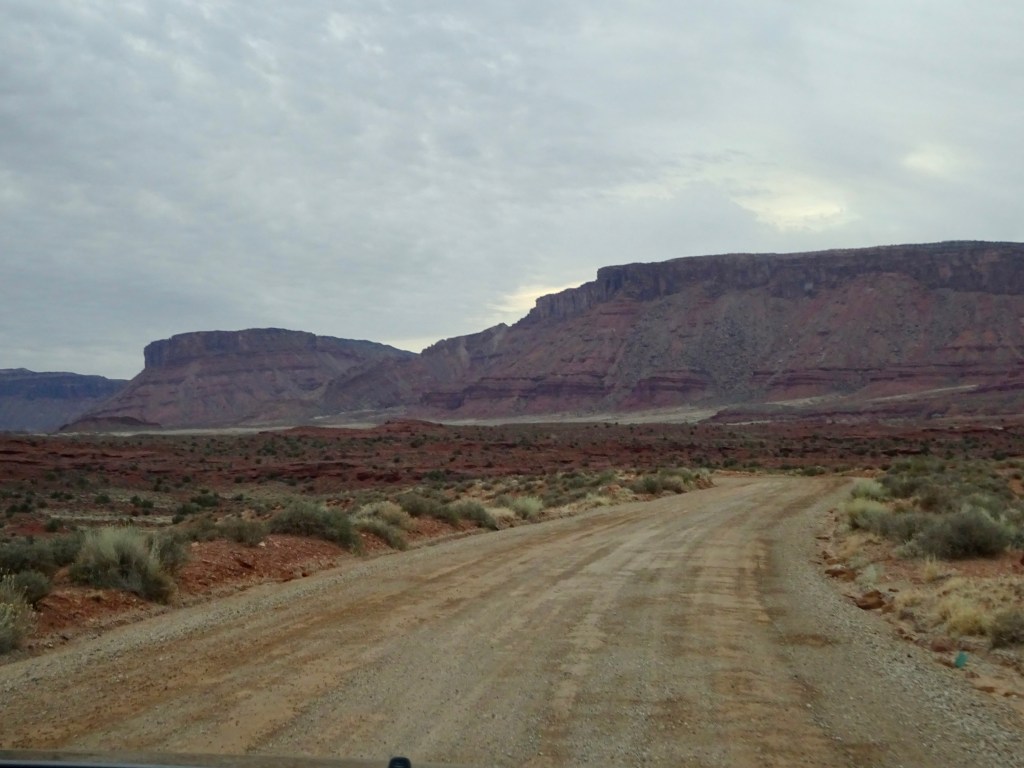 A good night’s sleep was had by all, following which was our customary breakfast. We layered up and brewed tea and then set off up highway 128, more generally known as the river road. After 25 miles and 40 minutes of winding canyon scenery, the route finishes with 2 miles of dirt road before ending in a car park at the base of stunningly tall cliffs and towers.