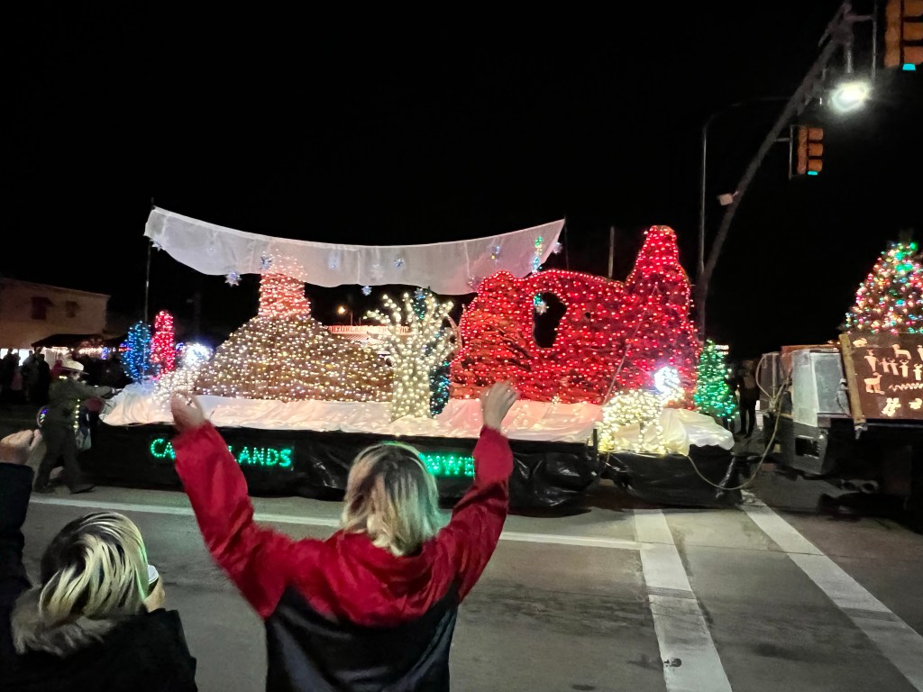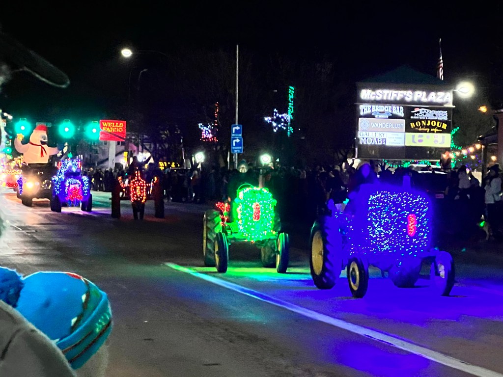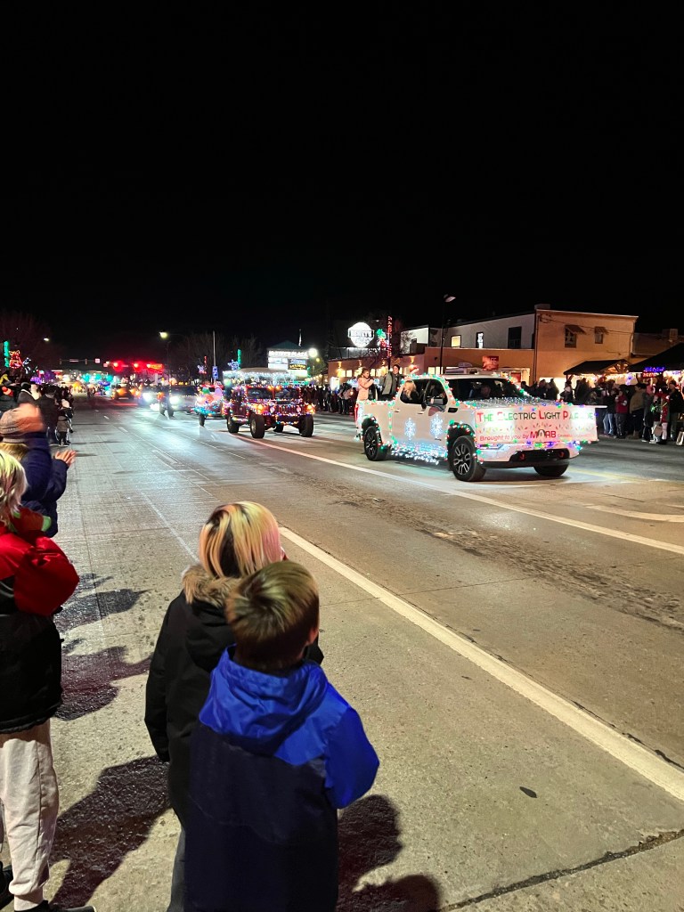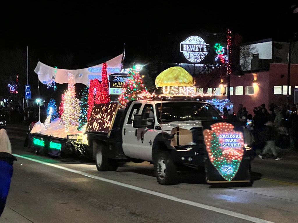 We made our way down Main Street, where crowds were starting to gather. We collected a free hot chocolate from a stand opposite Zax (there were cookies too, but we restrained ourselves) before going and standing outside Zax, ready for the Christmas Electric Light Parade. We aren’t usually in Moab this late in the year, so it was the first time we had seen it (although I was actually in it, way back in 2006, but that’s a different story). Our waitress on Tuesday had recommended this spot, and she was there too, delighted to see us again.