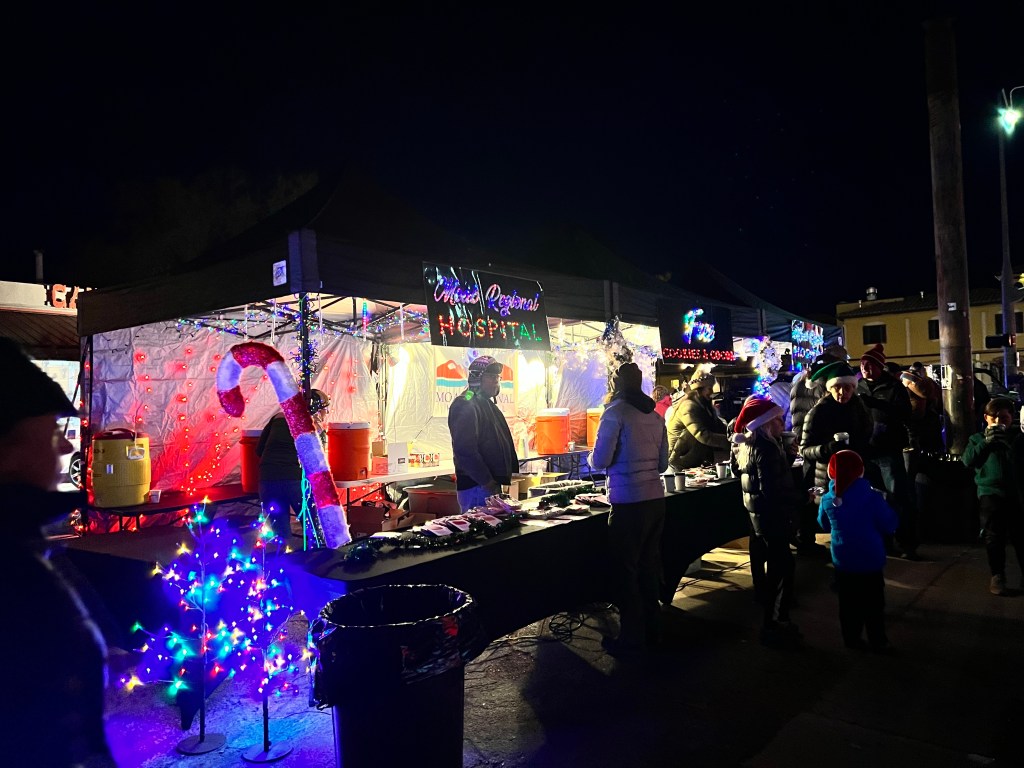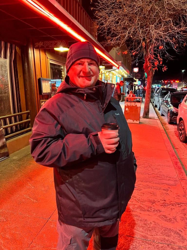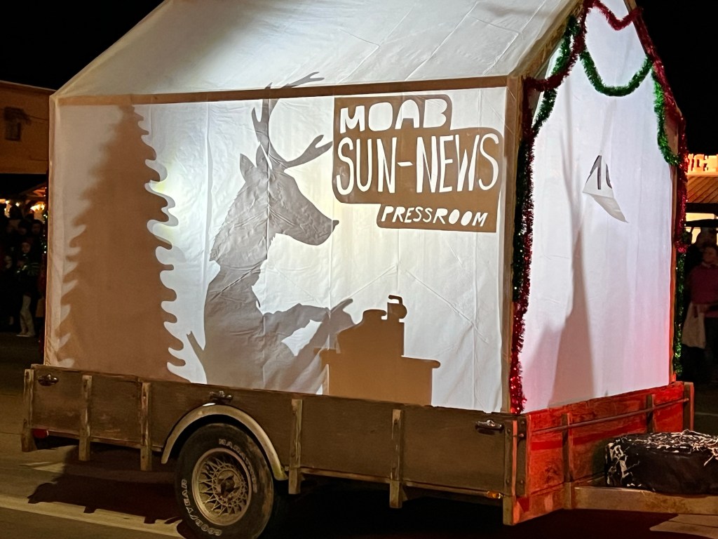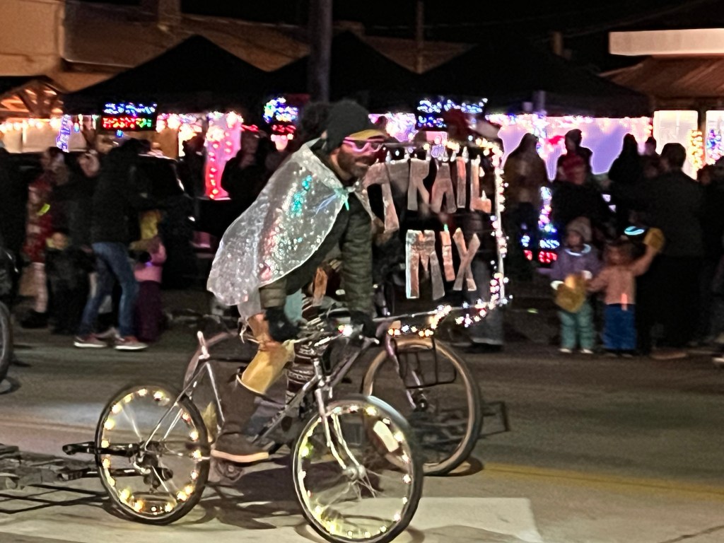 We made our way down Main Street, where crowds were starting to gather. We collected a free hot chocolate from a stand opposite Zax (there were cookies too, but we restrained ourselves) before going and standing outside Zax, ready for the Christmas Electric Light Parade. We aren’t usually in Moab this late in the year, so it was the first time we had seen it (although I was actually in it, way back in 2006, but that’s a different story). Our waitress on Tuesday had recommended this spot, and she was there too, delighted to see us again.
