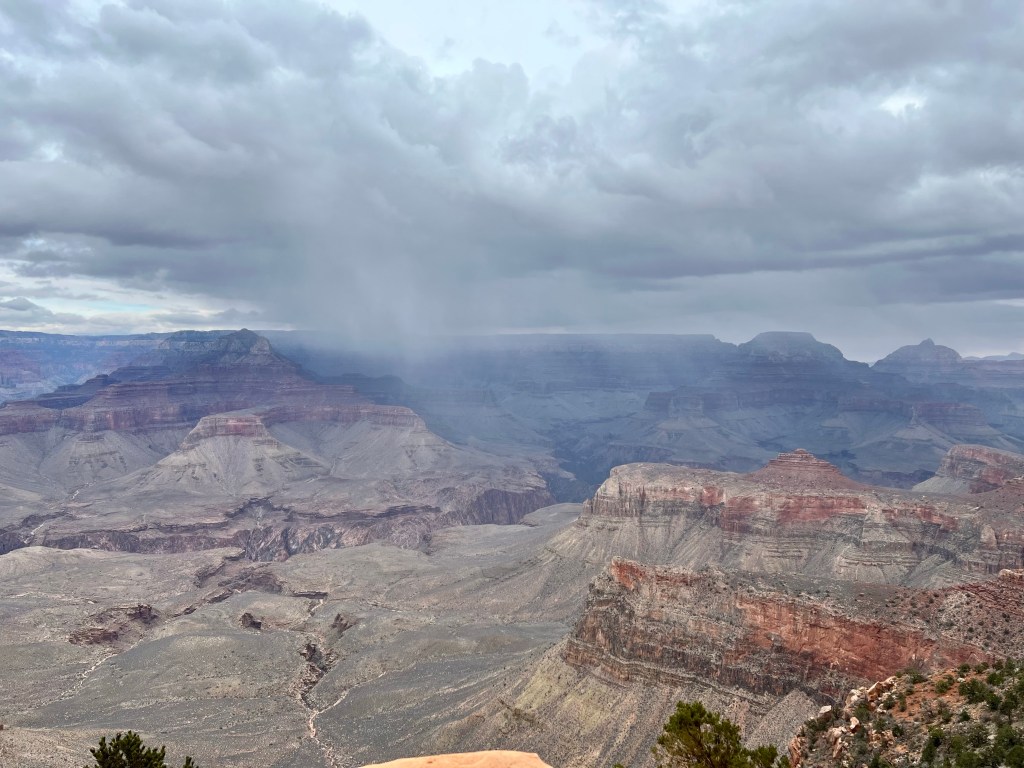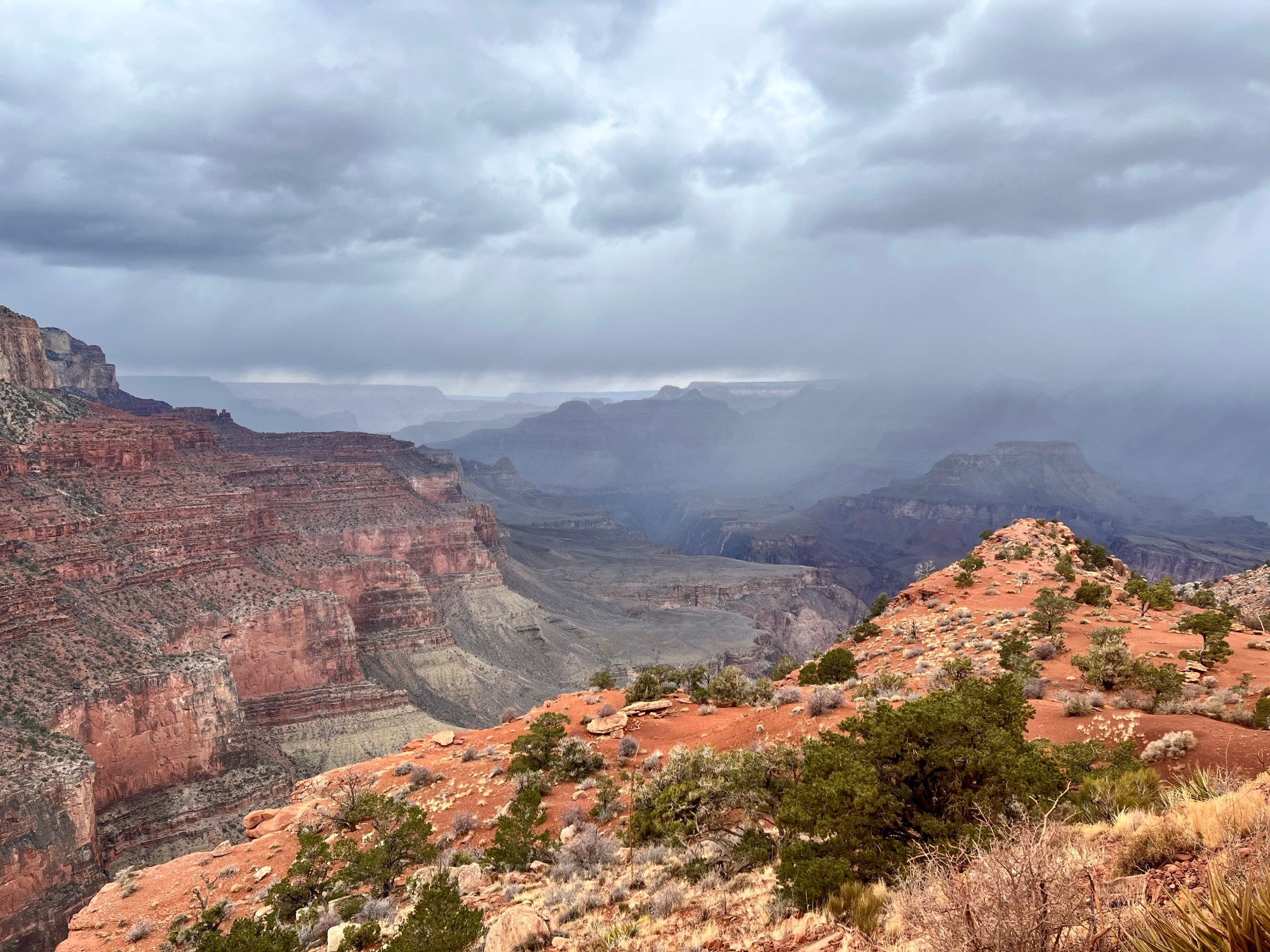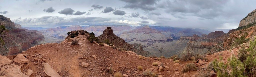Then the route follows the ridge line, providing extensive views, all the way down to Cedar Ridge. We could see rain further down the canyon.