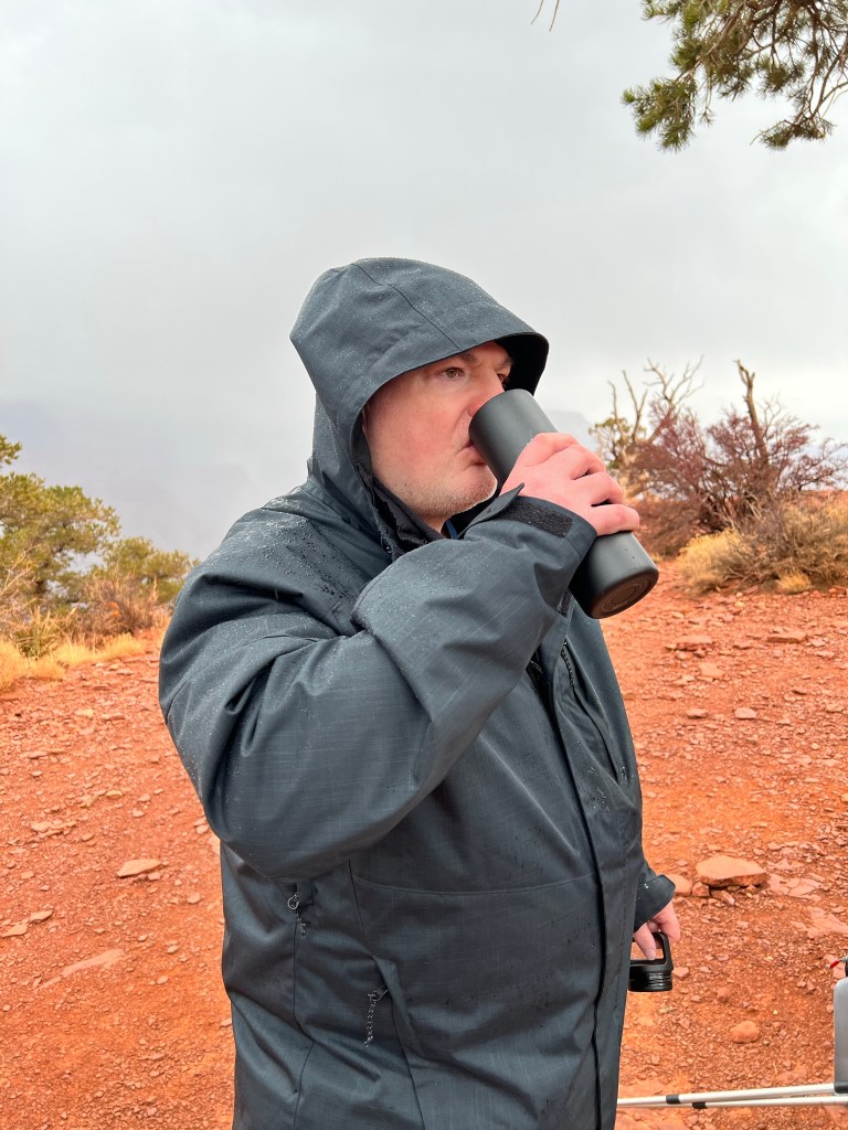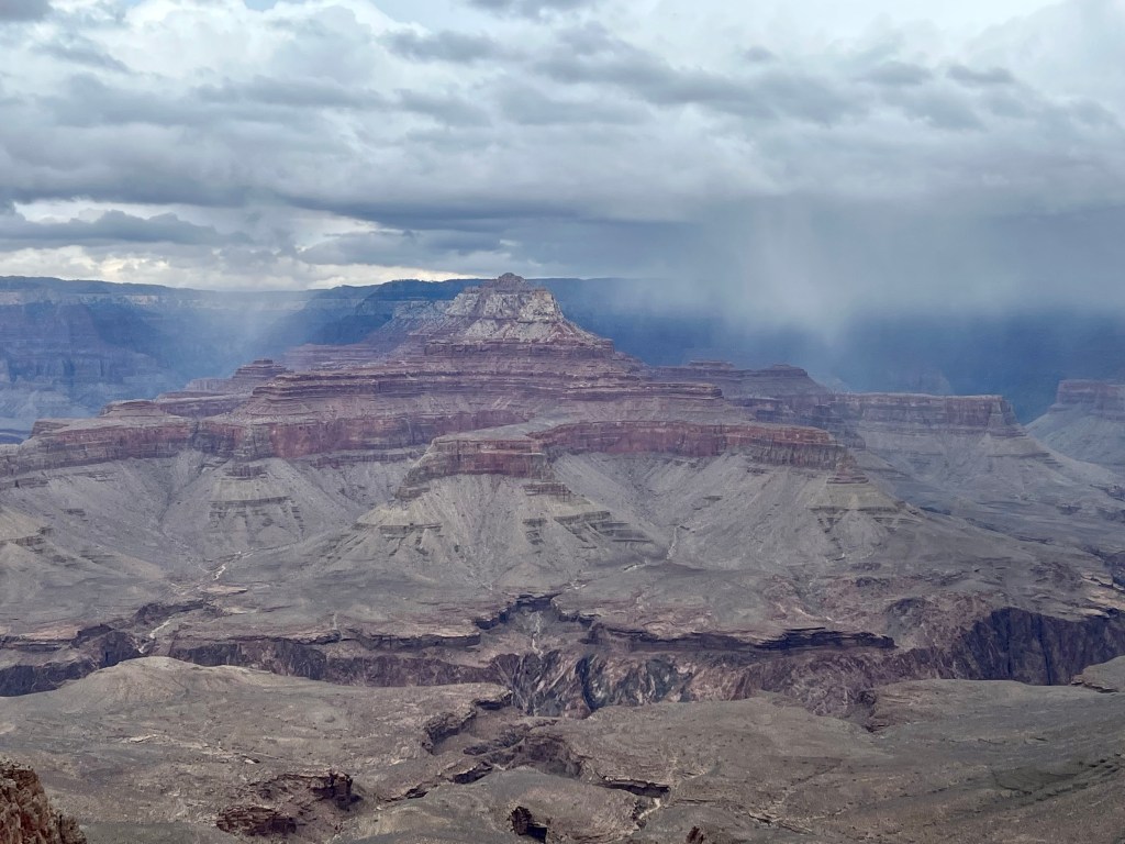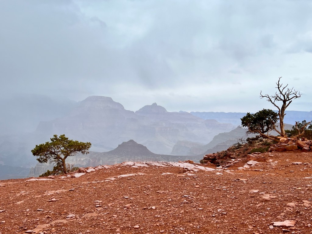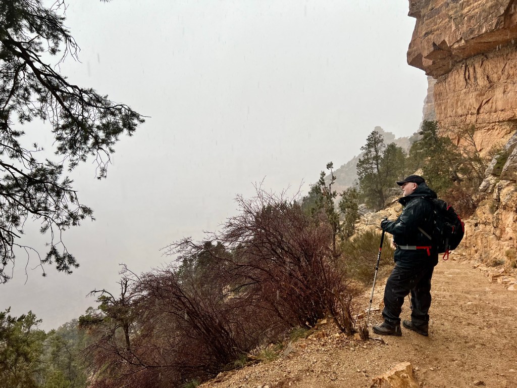 We walked out along the ridge but, by this time, rain or snow was moving in obscuring parts of the north rim and, as we has our lunch snacks, it started to rain and sleet on us too.