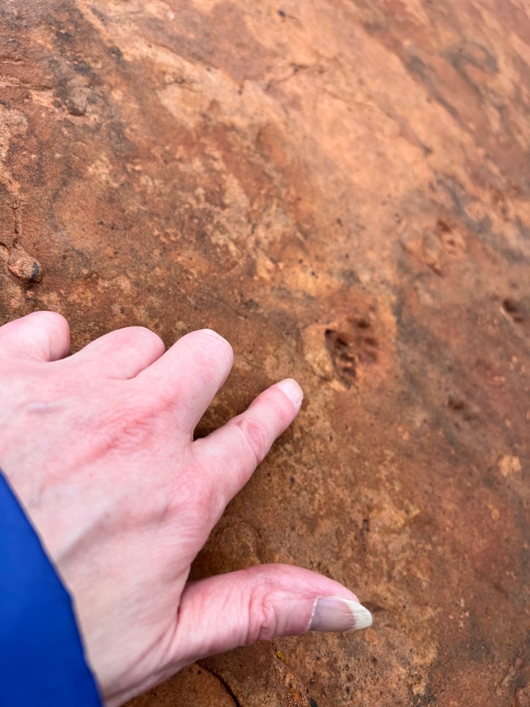 As we climbed, the canyon gradually disappeared. We saw more birds (Woodhouse’s scrub jay, robins, sparrows, ravens, mountain chickadees) but unusually this trip we haven’t seen any critters, such as squirrels. I did see some kind of fossilised animal track in a rock at the side of the trail. The prints wound across it, but I still haven’t identified them.