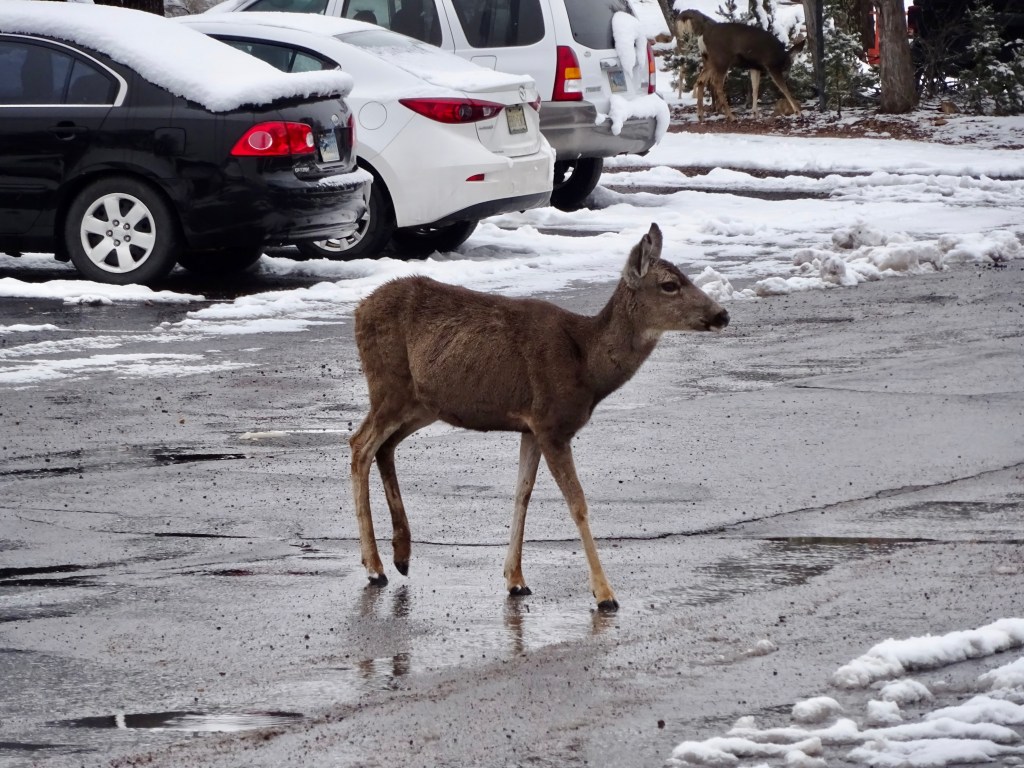 We went past the mule stables, and then spotted the deer grazing, before getting back to the rim to see if there was a view yet. There wasn’t.