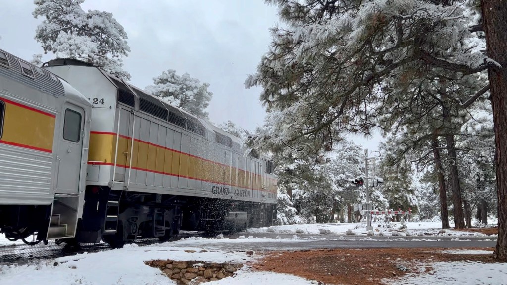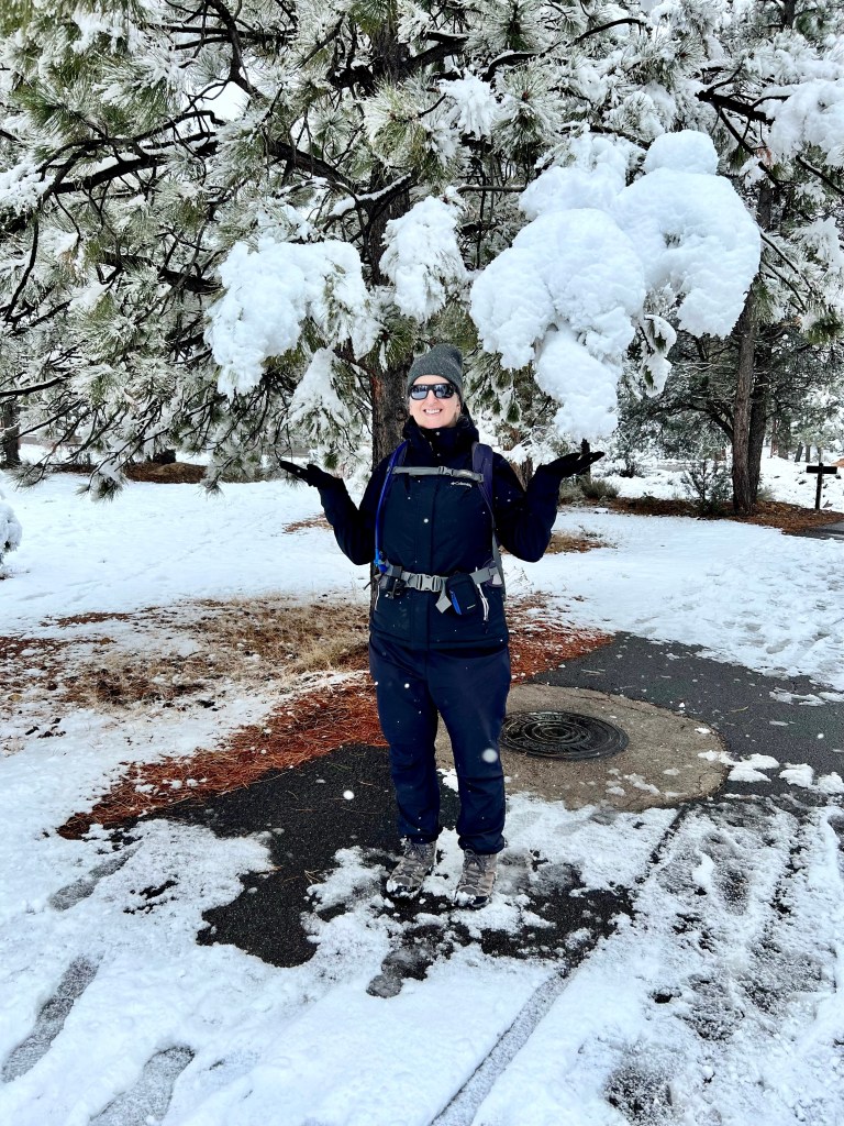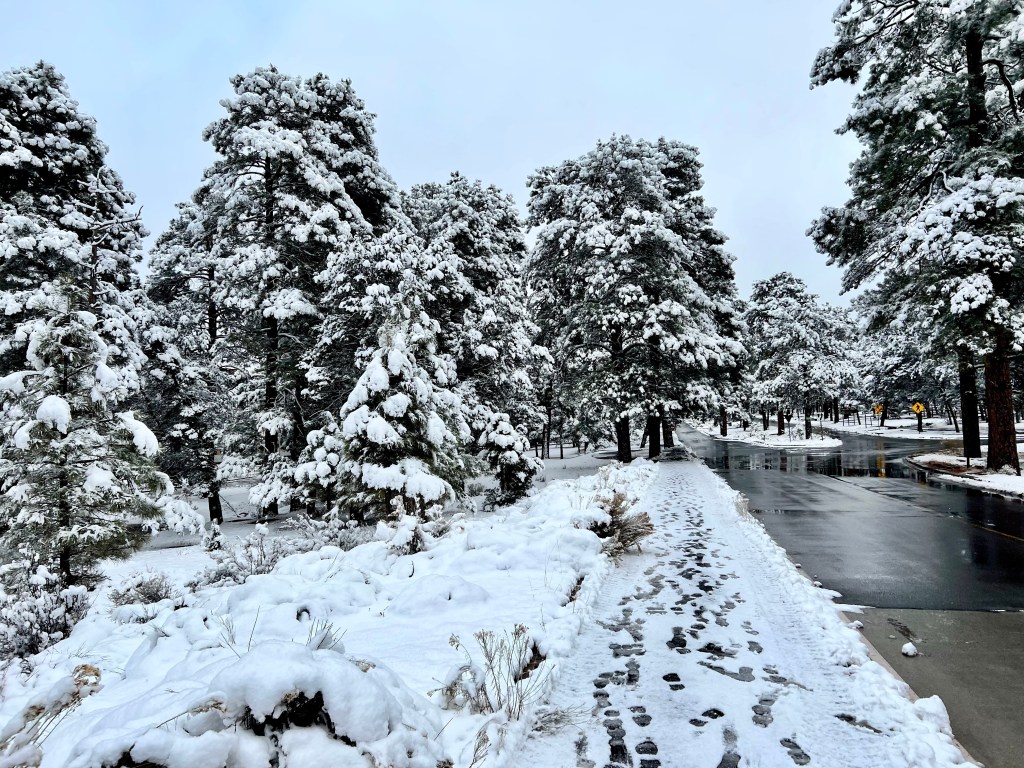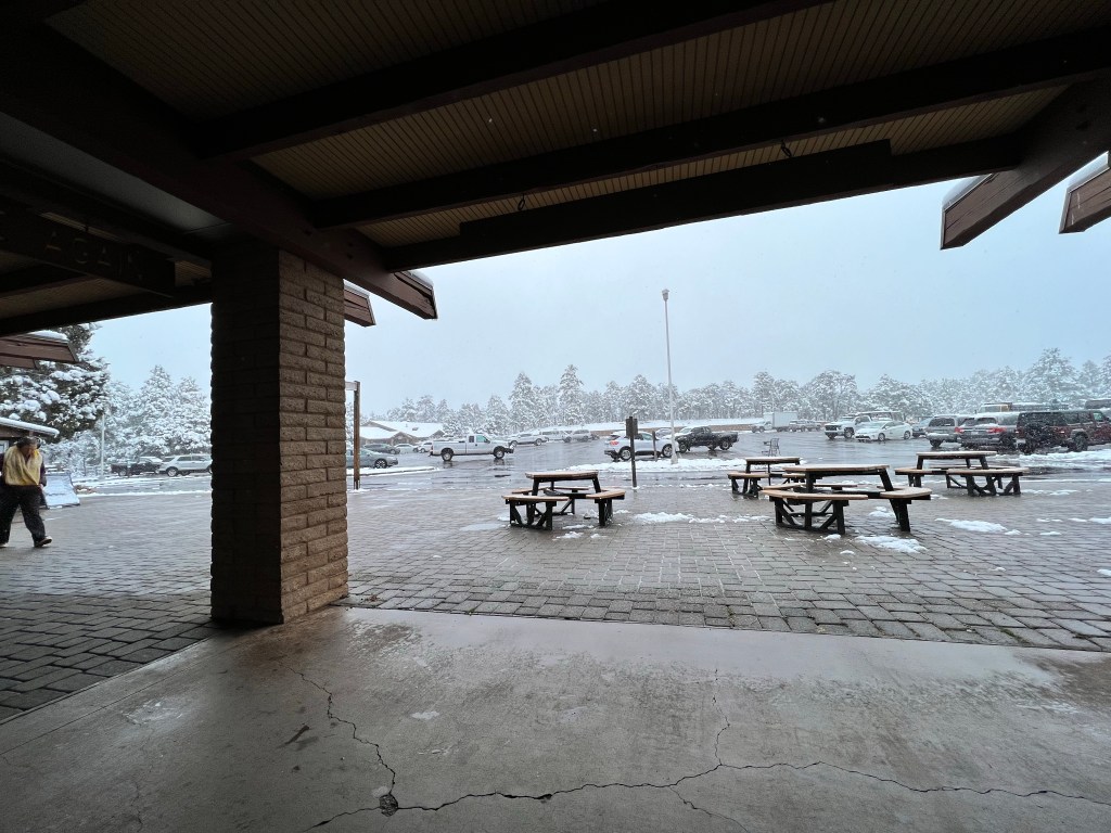 With that excitement over, we relaxed for a bit and then decided to walk the Greenway over to the market plaza, which was something we both wanted to do if it snowed. However, we went by the rim first, to look at the view. Andrew handily pointed out the canyon, for anyone in doubt.