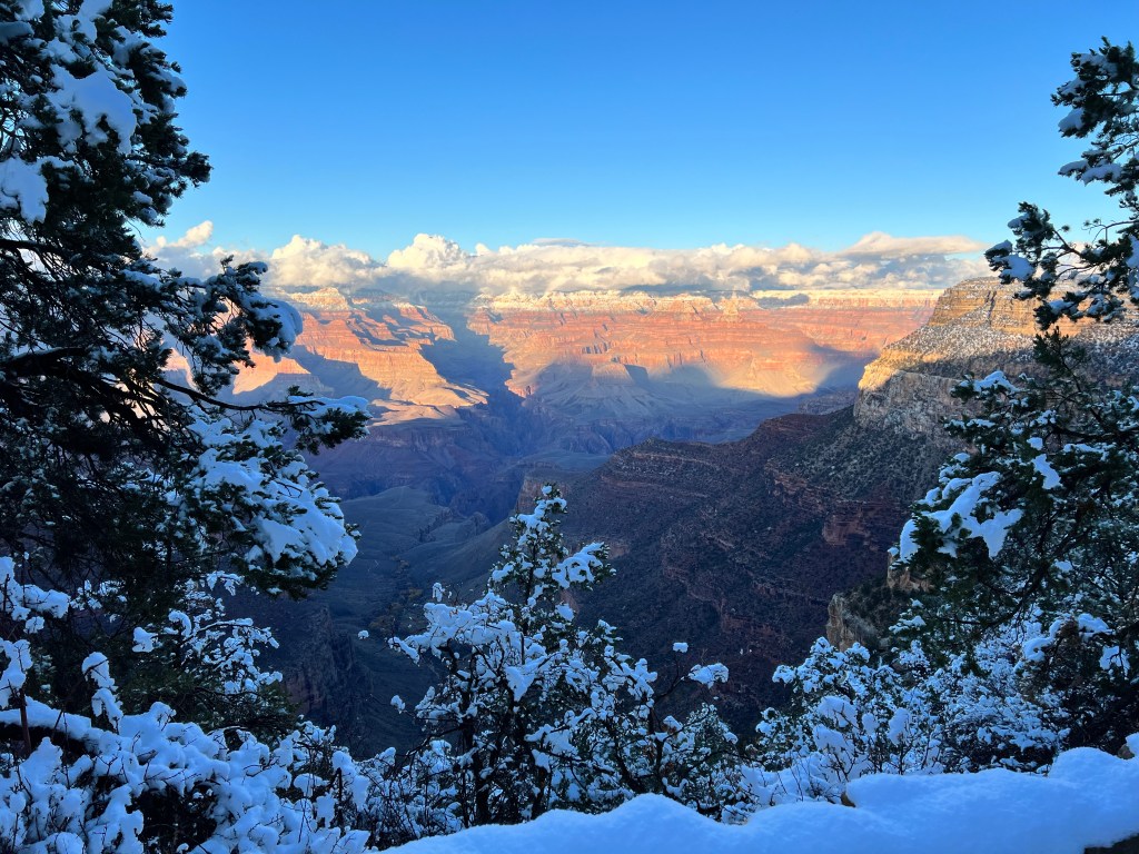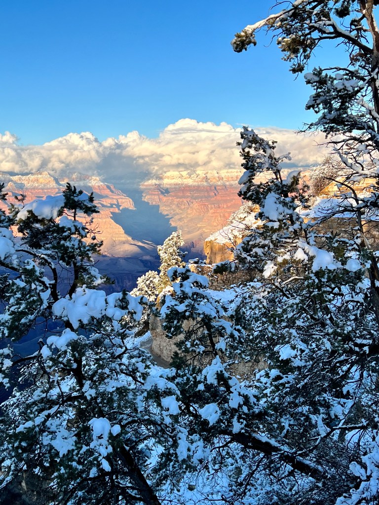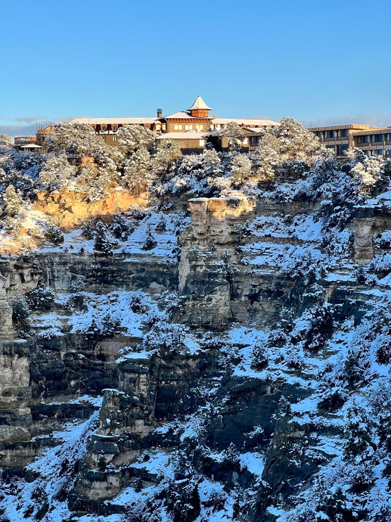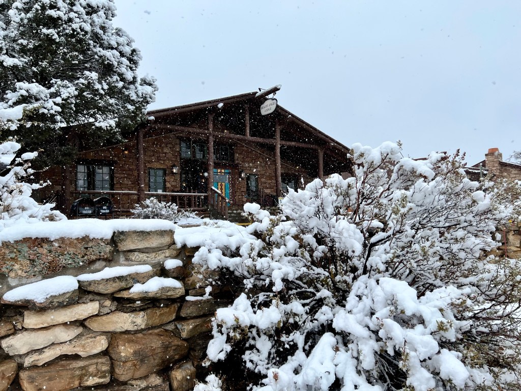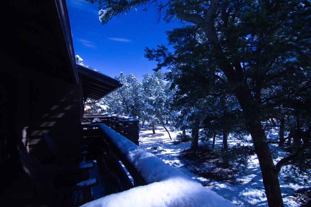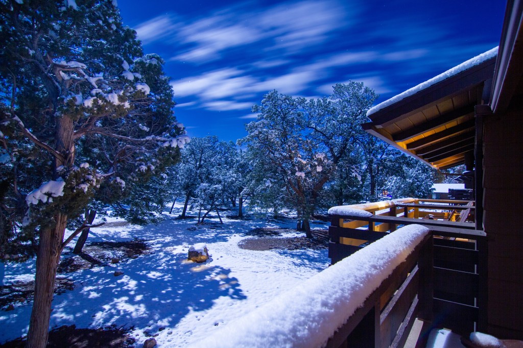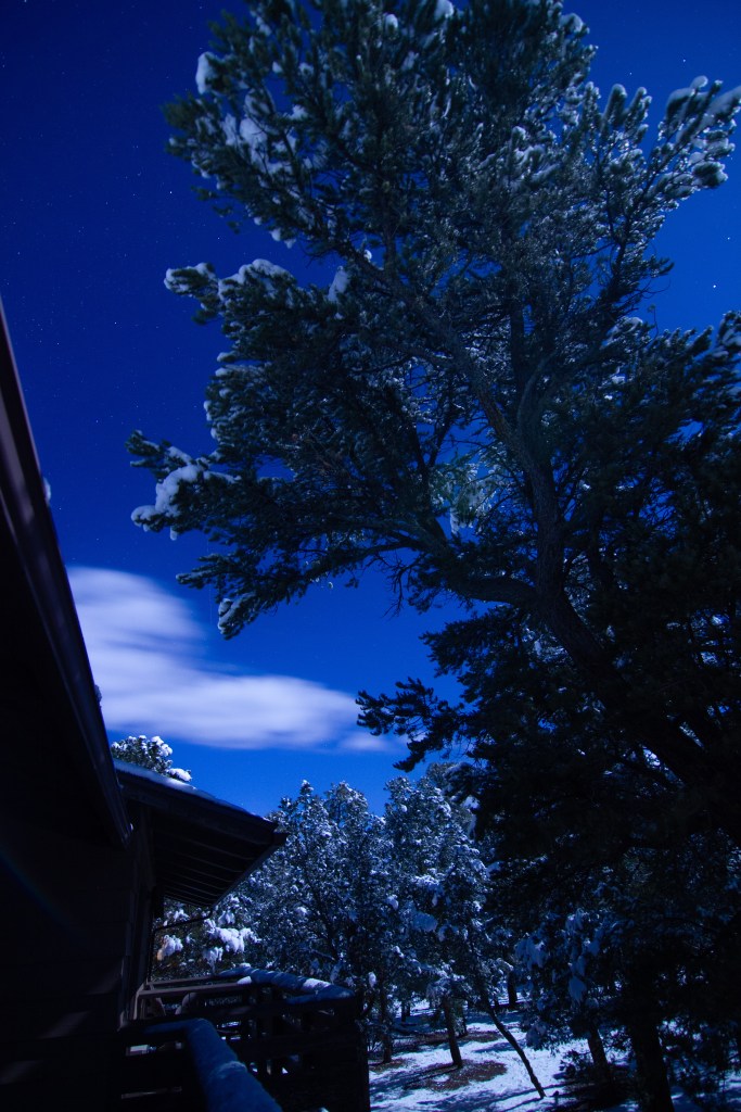 It was definitely cold, and I didn’t fancy the icy walk back to the rim, and the potential for slipping over, but I did eventually drag myself out onto our balcony…as ever, they need proper editing at home, but you’ll get the idea! The moon was too bright to photograph with the camera lens I have with me, but it lit up the snow, and the clouds were speeding past the stars. And that brings our days in Grand Canyon to a close. Tomorrow, we drive to Las Vegas.