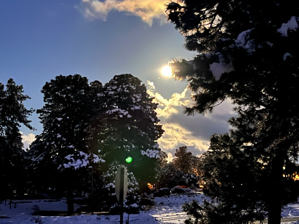Then we went for our last-night-at-the-canyon meal at the Bright Angel. Although they’ve changed the restaurant and it now serves mainly burgers, it is still a more relaxed and better experience than the cafeteria. We had a lovely meal and then started the mini expedition back to our room. It wasn’t far, but the paths, which had been cleared but had stayed wet, were now frozen and slippy. We tried as far as possible to walk on the landscaped and snowy areas, as this gave much better traction. We looked at the Moon and Mars coming close to occultation. This full moon is rather appropriately called the Cold Moon.