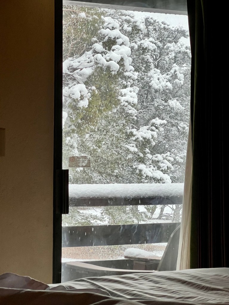 After I calmed down, which was after I’d run for my phone, taken a photo and thrust it in front of Andrew’s only half open eyes, I made coffee and opened the curtain so that I could watch the falling snow from the warmth of my bed.