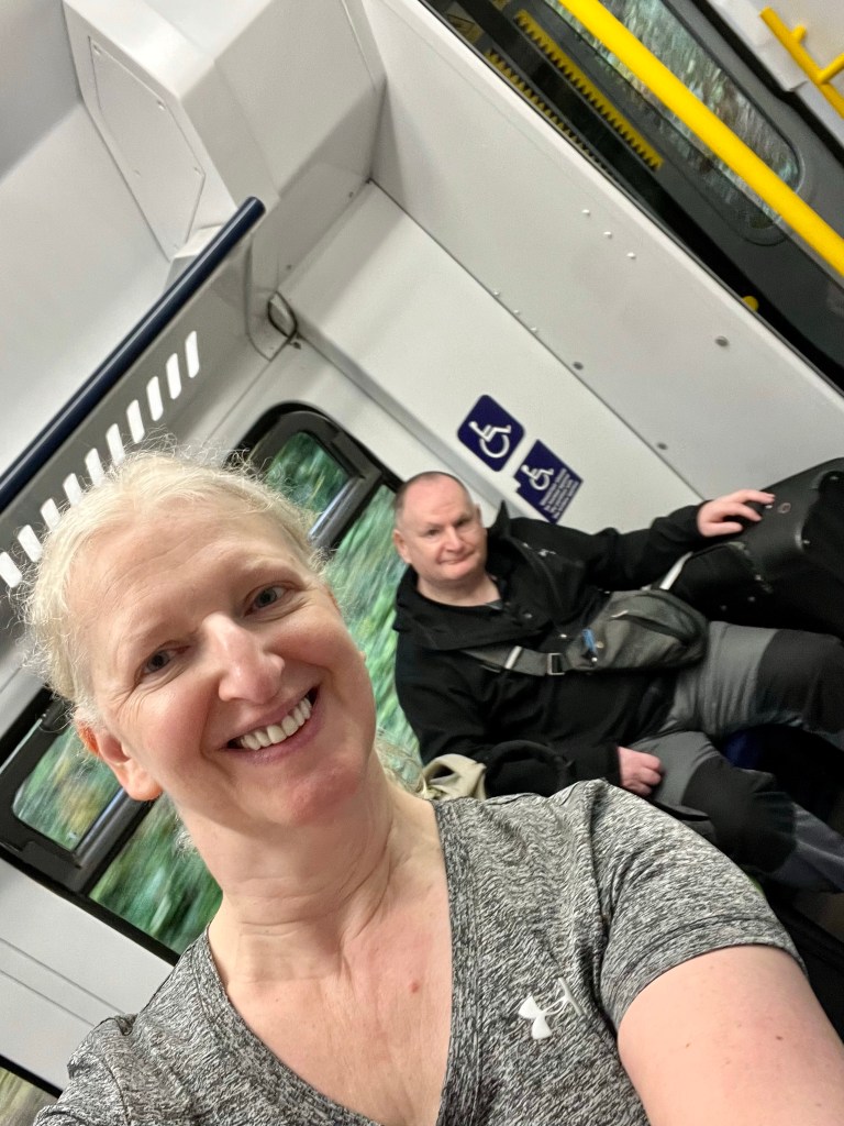 After a leisurely 50 minutes, it was action stations again. Our train got in a few minutes late (nothing particularly unusual about that), meaning a connection of just 5 minutes to get from platform 1 to platform 13. We could either take the short route, involving two flights of stairs (with our cases) and possibly make the train…or the long way with travellators and lifts and definitely miss it. We took the short route and boarded the airport train with less than a minute to spare. It wouldn’t have been a problem as the next train was in another 25 minutes, but it was good not to have to wait.