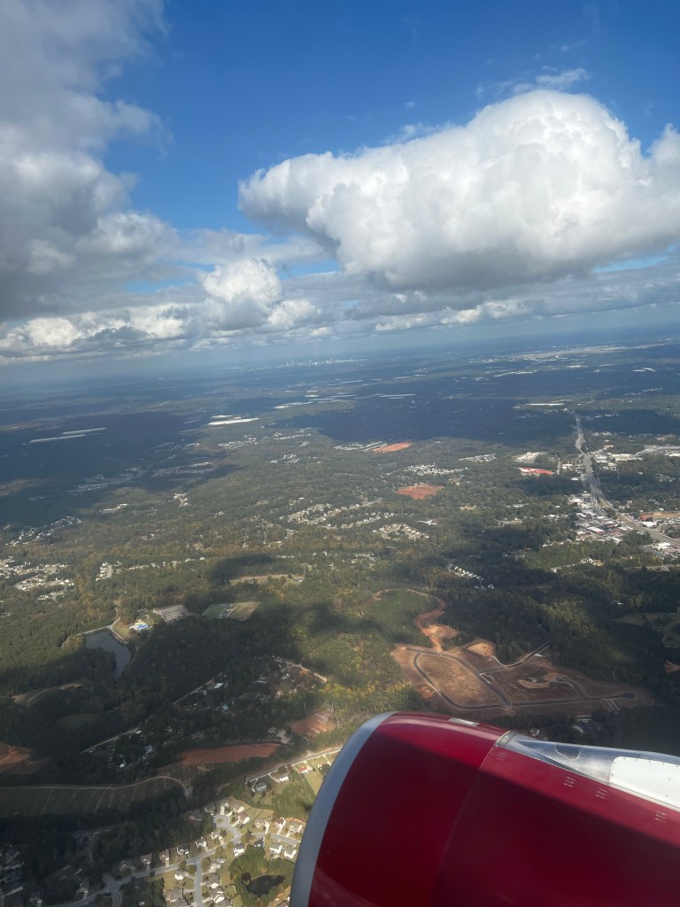 We settled in with the usual pre flight drink, the flight pushed back right on time, and after a short taxi it departed without any queue for the runway. One minute into the flight we got to cloud level (1100 feet), and after that we didn’t see much for the whole flight. It turned out that it wasn’t just Manchester that was cloudy. Brief sightings of land were had near southern Canada and over the Georgia mountains.