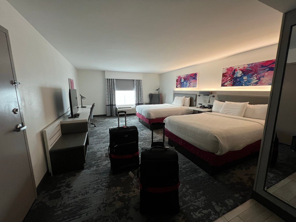 After a slightly crazy, but certainly speedy, shuttle ride we disembarked and waited for the free shuttle bus to the hotel. It allegedly runs every half hour. After more than half an hour, and having seen a lot of shuttles to just about every other hotel, we gave up, counted our cash left over from previous trips, and decided to get a taxi. It was exorbitant for a 5 minute ride, but worth it to get the last bit of travelling completed. It was the only bit that hadn’t gone extremely smoothly, so not too bad over all.