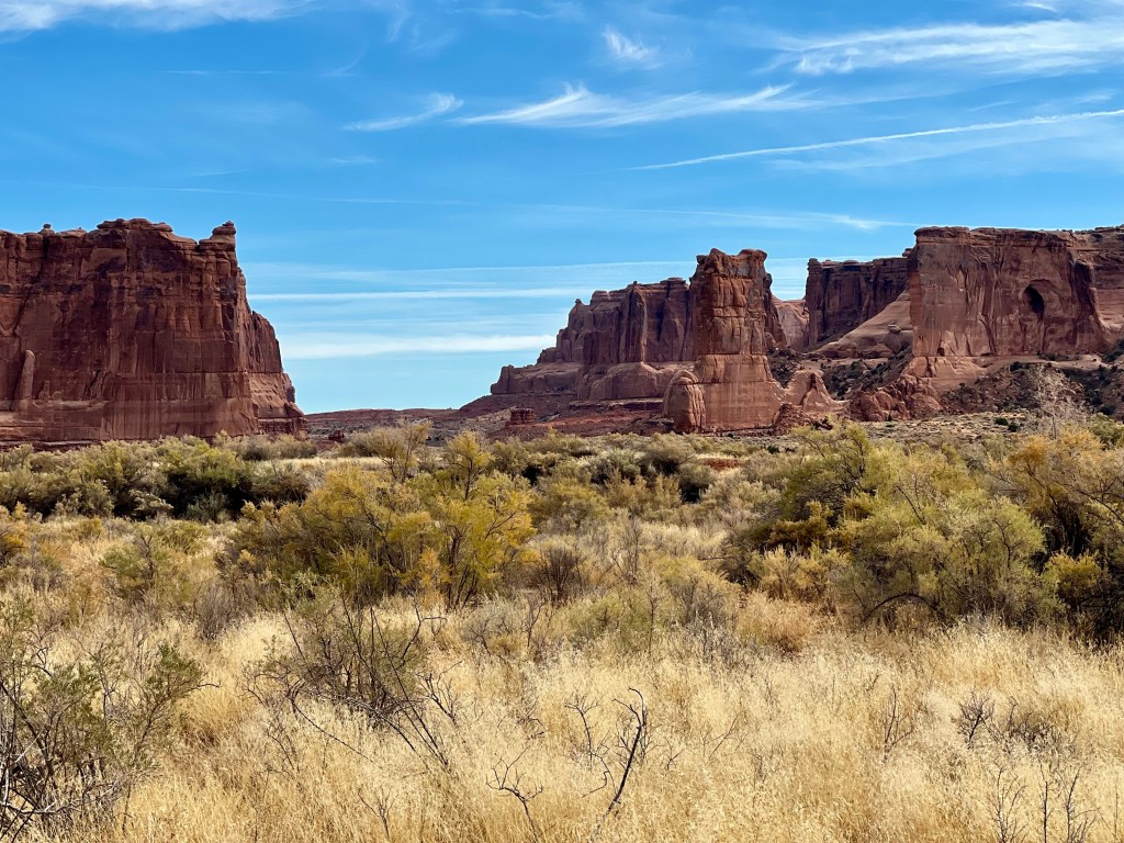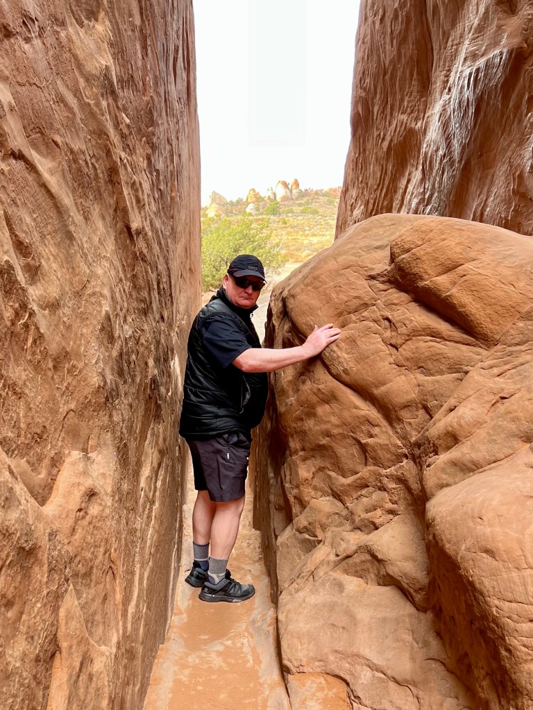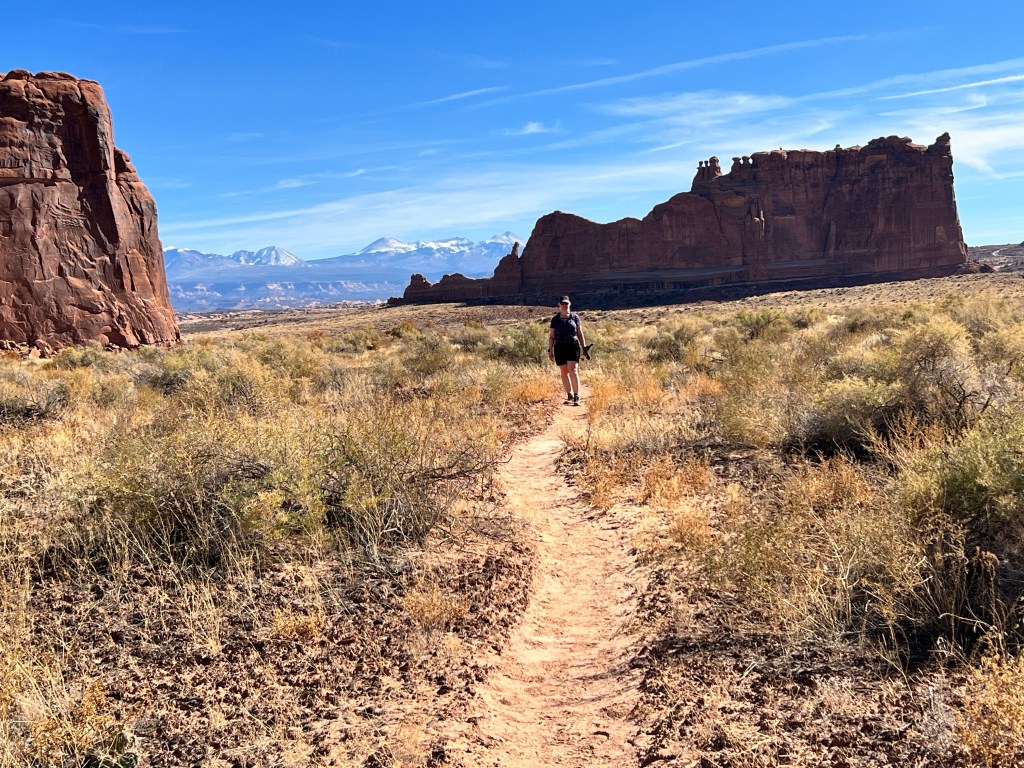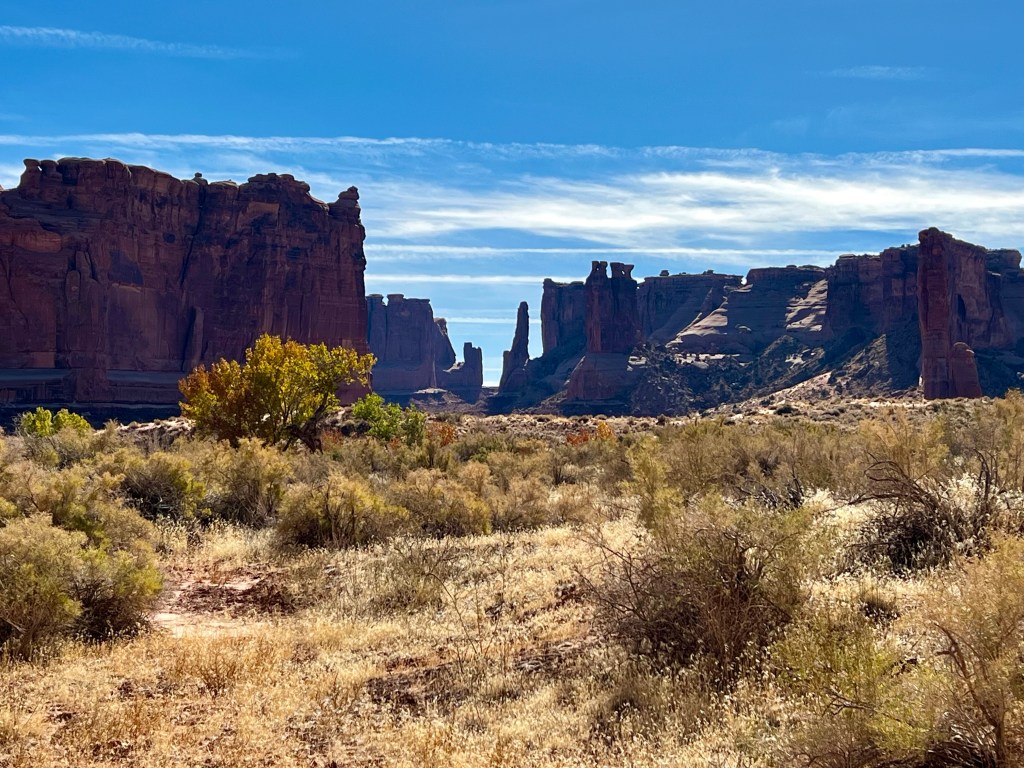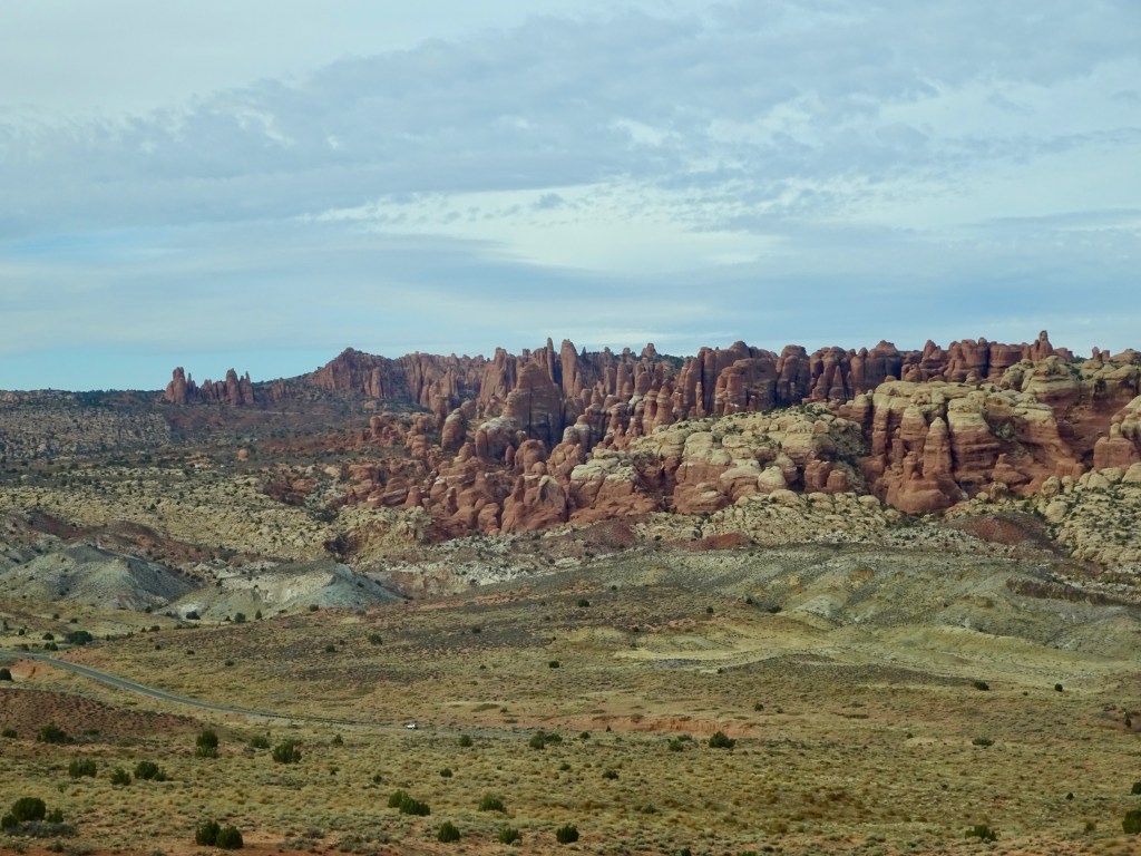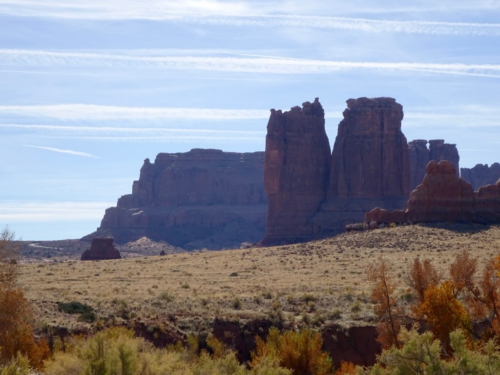 Once suitably conscious, we went down for breakfast. By now I’m a master of using hotel waffle makers. We got another cup of coffee and returned to the room to ponder our options. We decided to try going to Arches. It is the first day when timed entry permits are not required. They were introduced last year over the summer season to manage the number of visitors, and used again this year until thy end of October. Visitation has doubled since we first started coming, 18 years ago. We had Canyonlands identified as a plan B. Both would offer some (relatively) gentle hiking, at least compared to the more vertical options of the Moab Rim/Portal Overlook Trail or Fisher Towers.