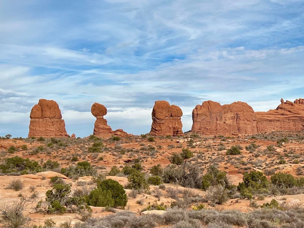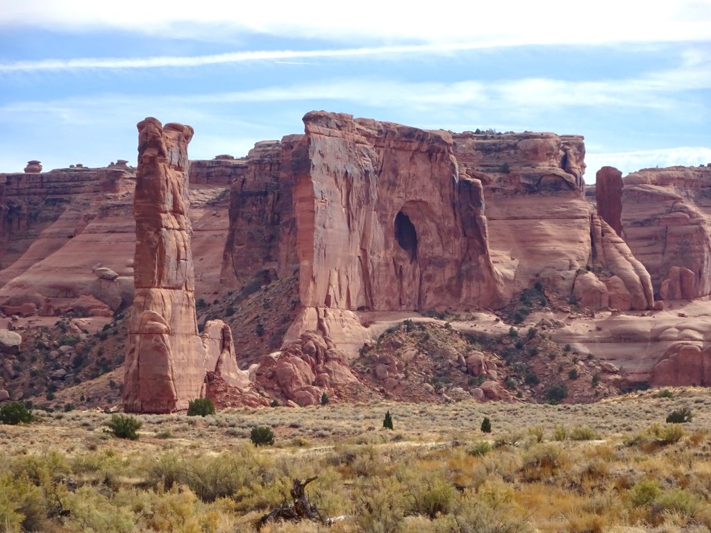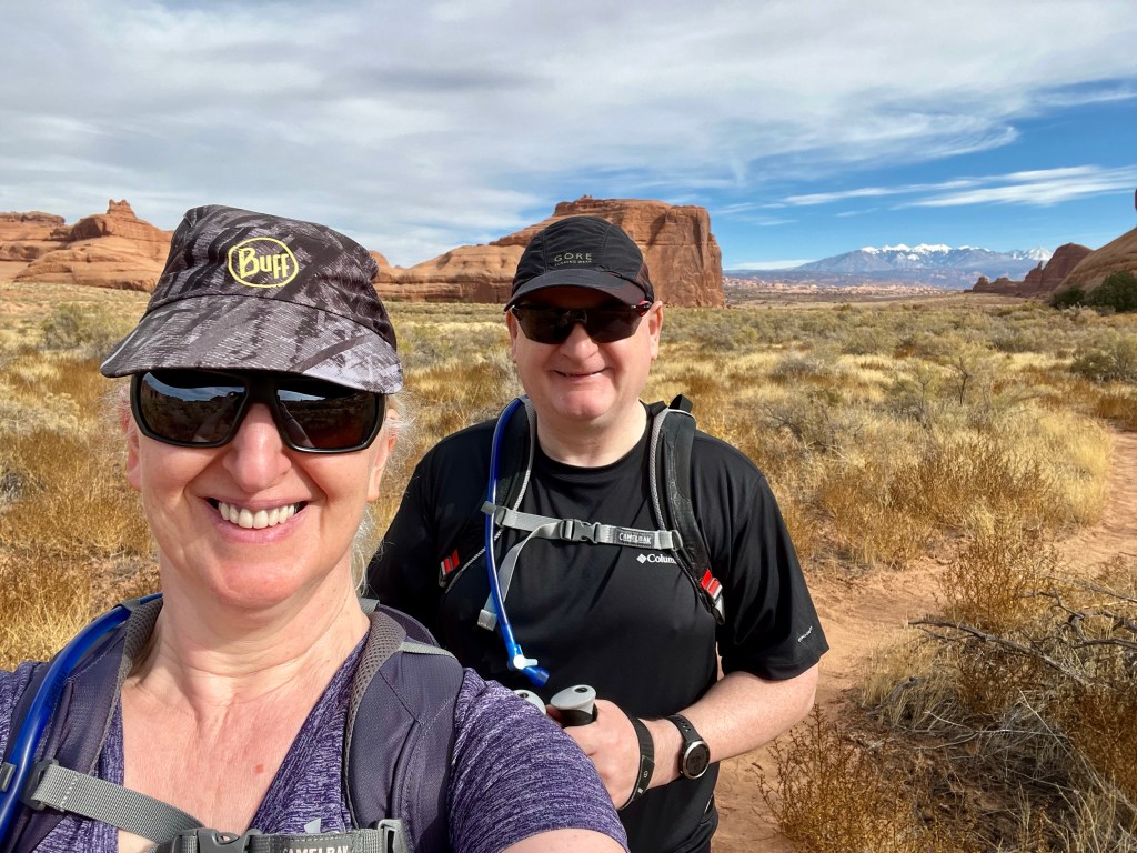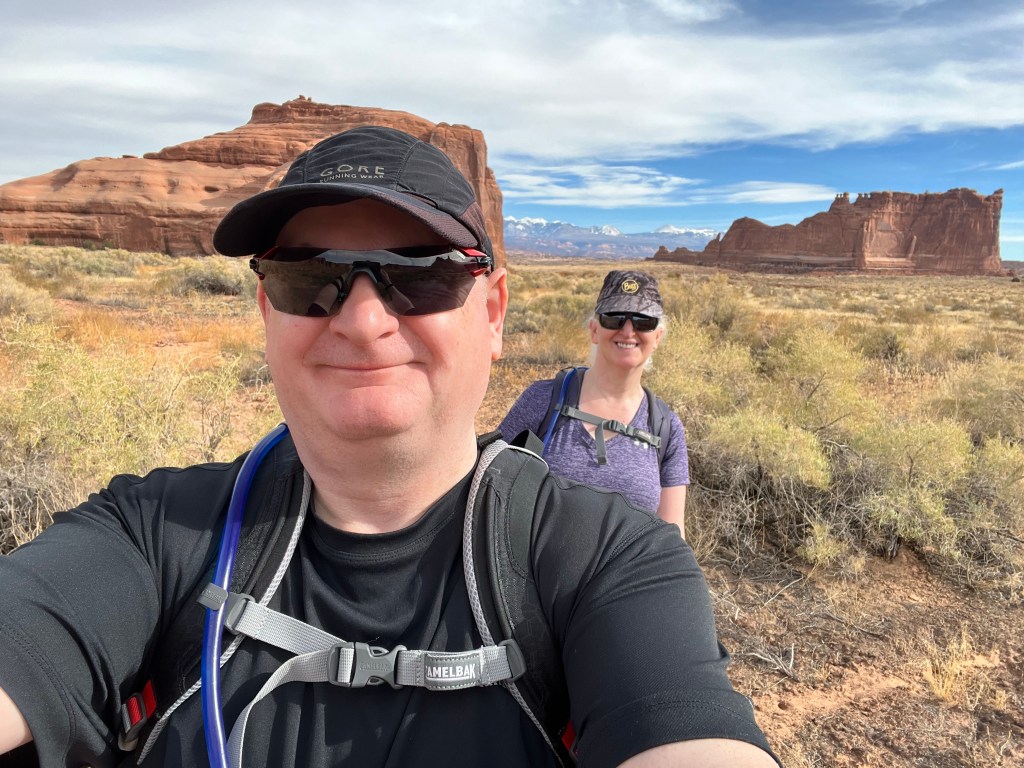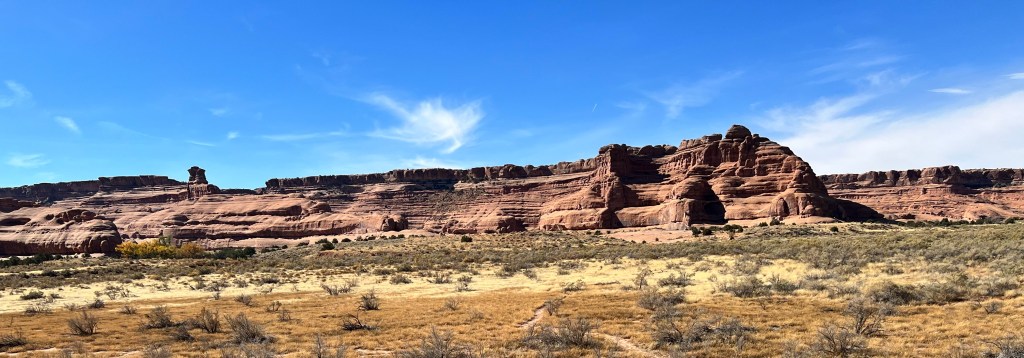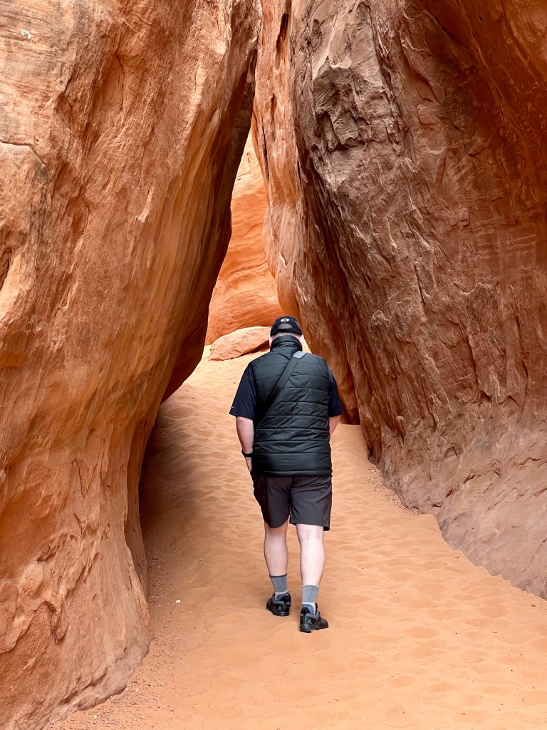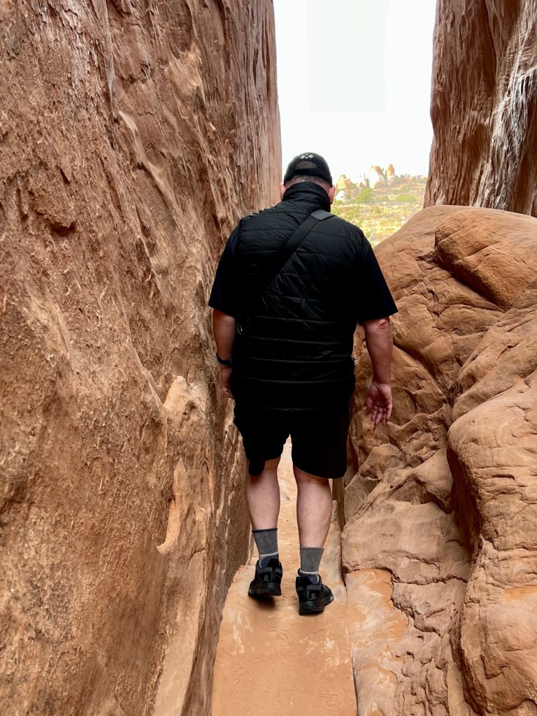 Once suitably conscious, we went down for breakfast. By now I’m a master of using hotel waffle makers. We got another cup of coffee and returned to the room to ponder our options. We decided to try going to Arches. It is the first day when timed entry permits are not required. They were introduced last year over the summer season to manage the number of visitors, and used again this year until thy end of October. Visitation has doubled since we first started coming, 18 years ago. We had Canyonlands identified as a plan B. Both would offer some (relatively) gentle hiking, at least compared to the more vertical options of the Moab Rim/Portal Overlook Trail or Fisher Towers.