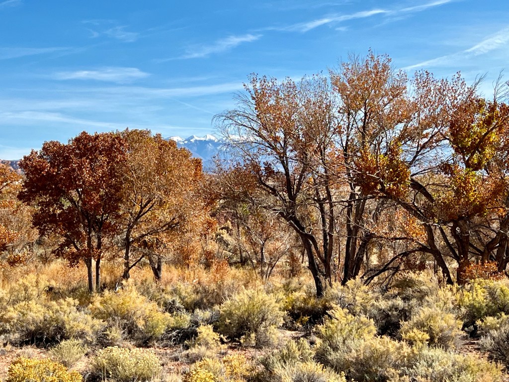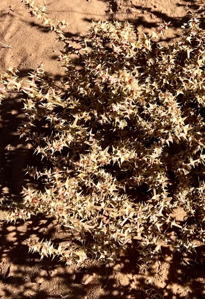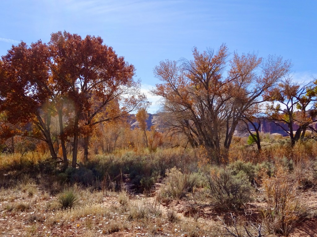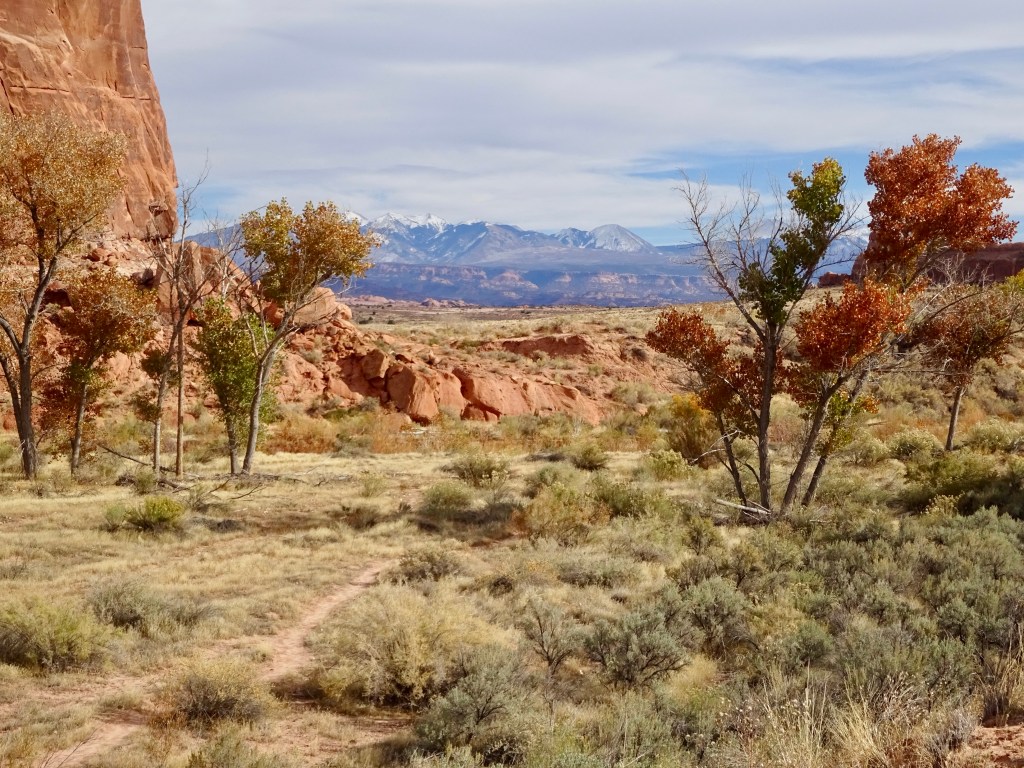 The scenery was beautiful. The autumn colours of the trees in the wash, snow capped mountains, desert bushes and golden Indian rice grass. Slightly less scenic and more pesky was the copious Russian thistle, which hooked into our sticks if your legs got too close to it. Digging the thorns out of our socks tended to result in them sticking into our fingers instead.