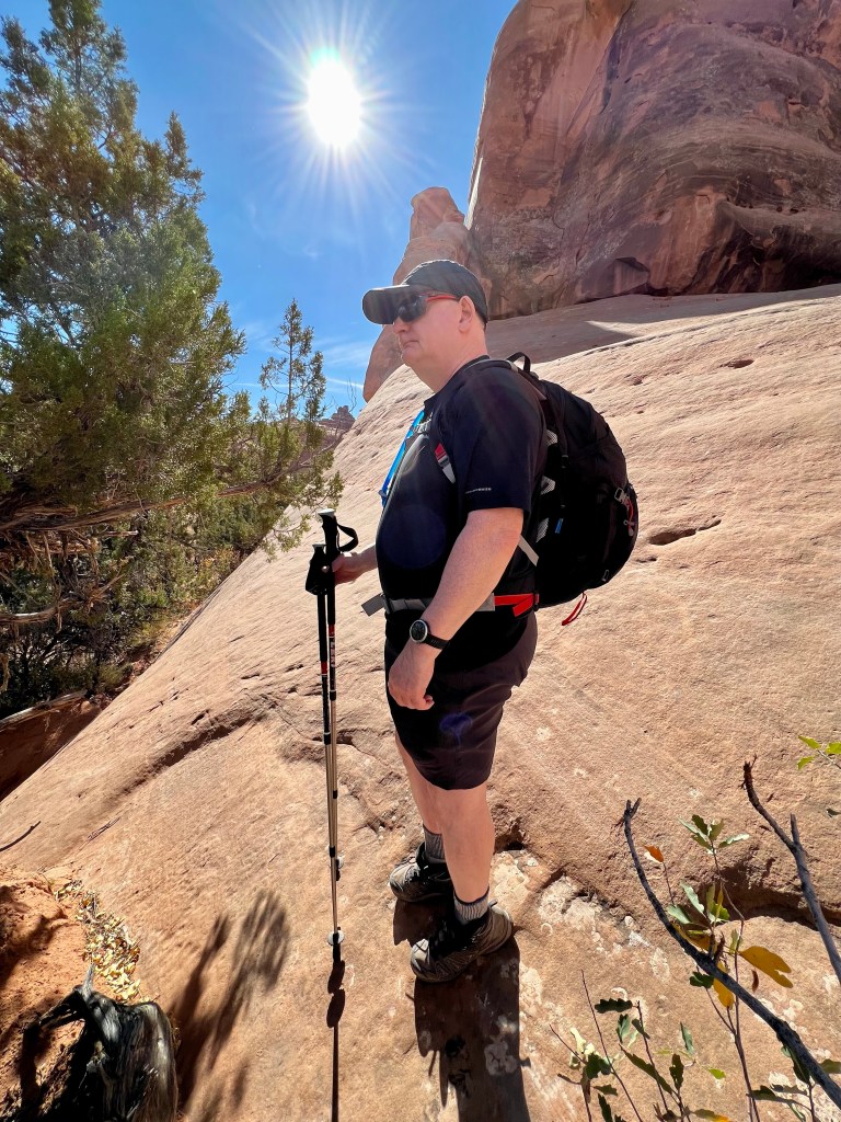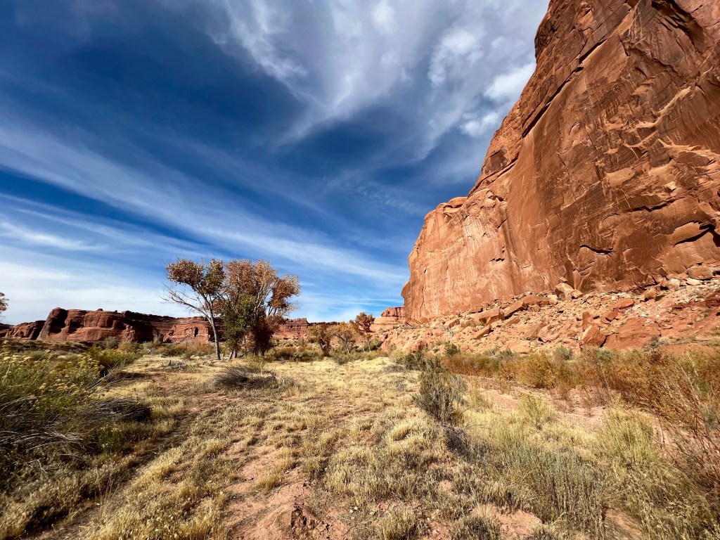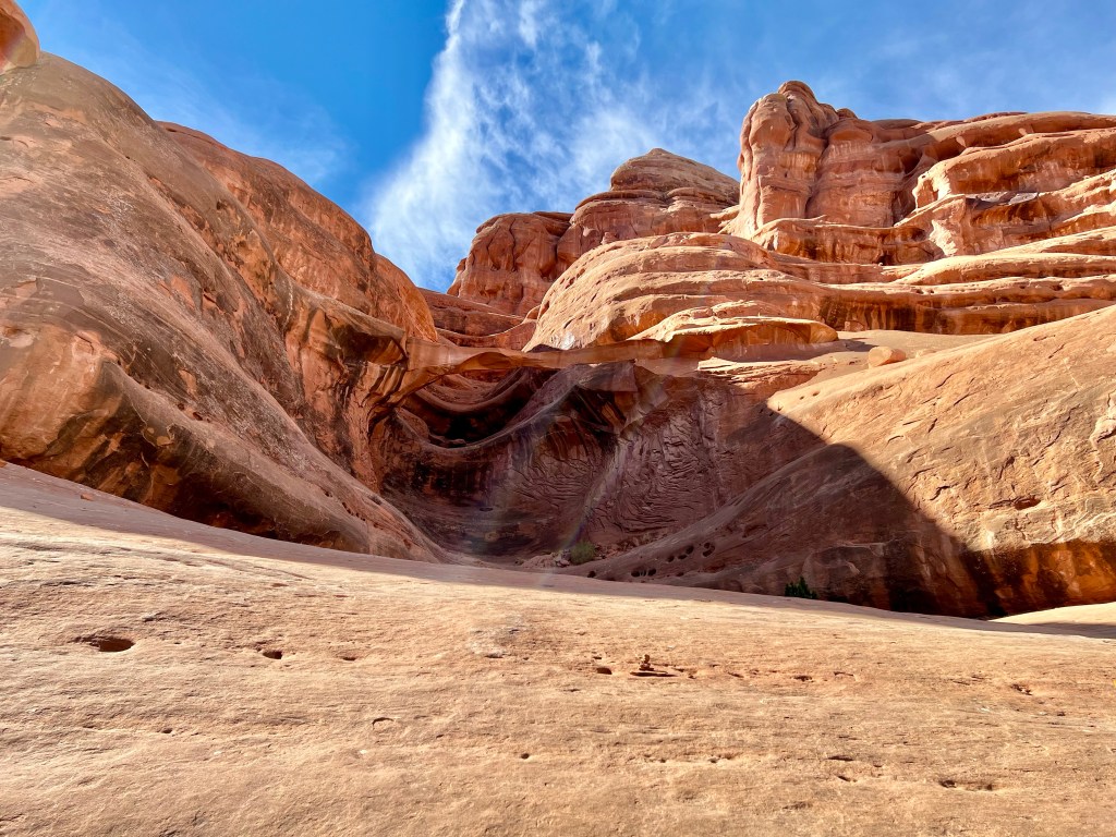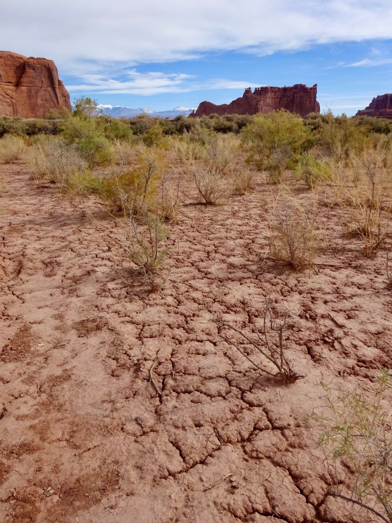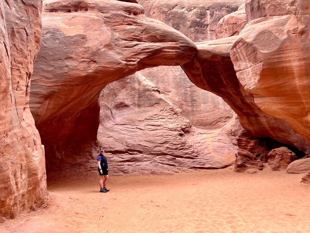 After taking our time it was around noon when we left. Perhaps the morning rush was past, or perhaps there wasn’t a rush at all, but either way, there was no queue at all to enter Arches, and so it was on to Plan A. A short drive up the main park road and we were soon at Courthouse Wash, where we parked in an unmarked lay-by. Today’s trail isn’t even shown on the topo map of the area, just the destination, Ring Arch.