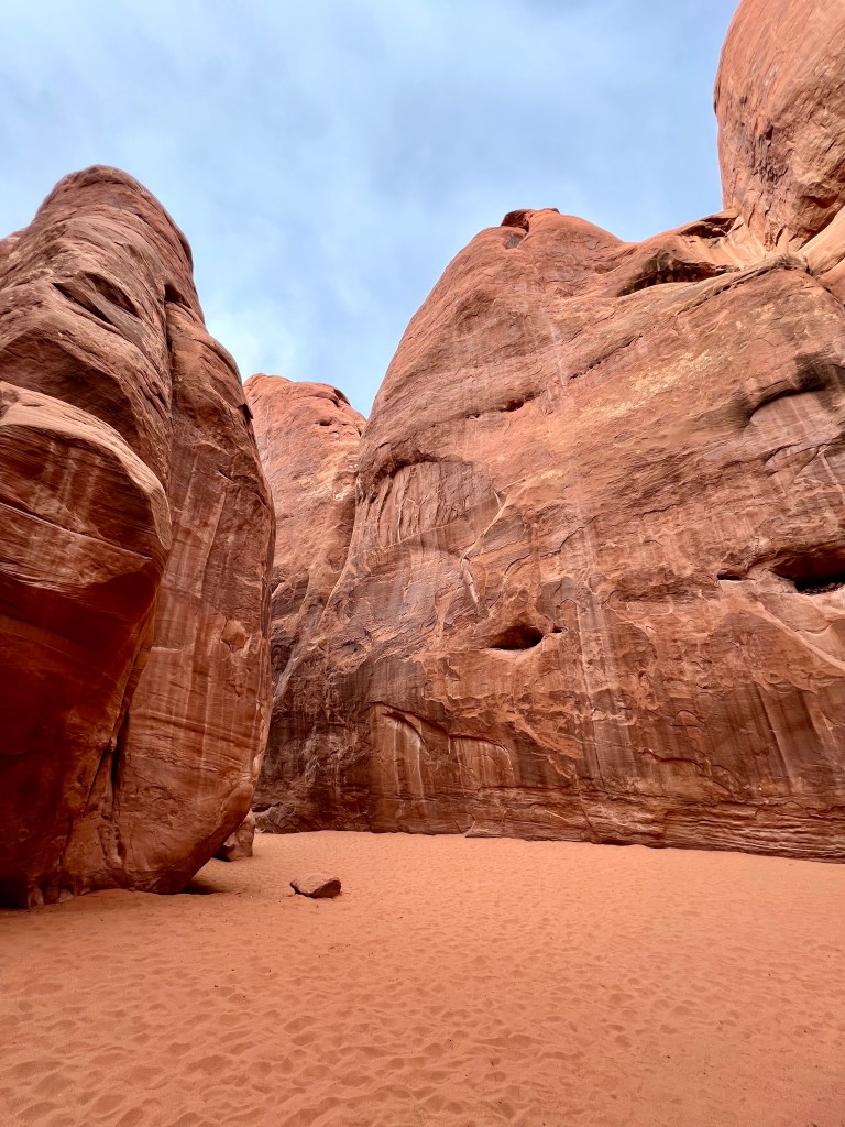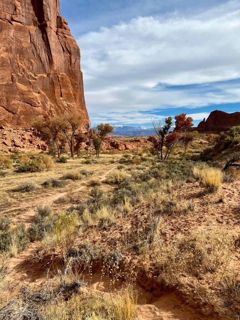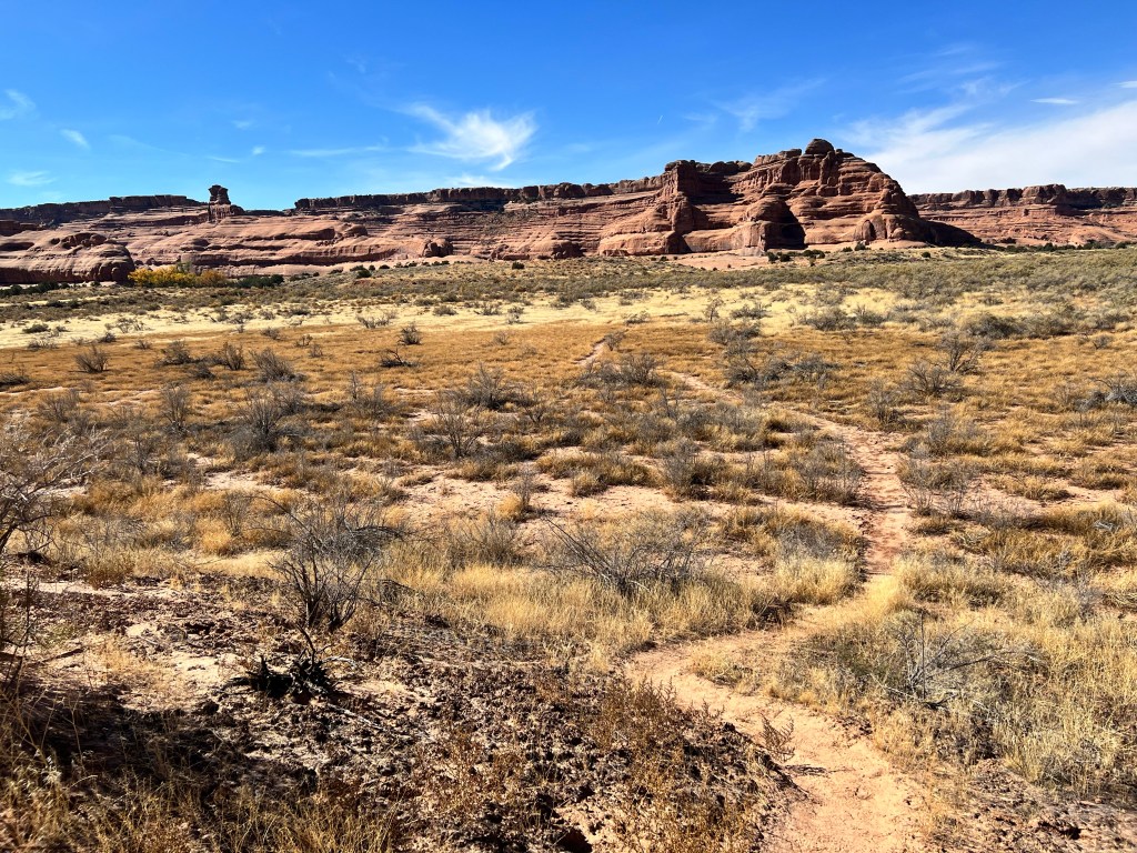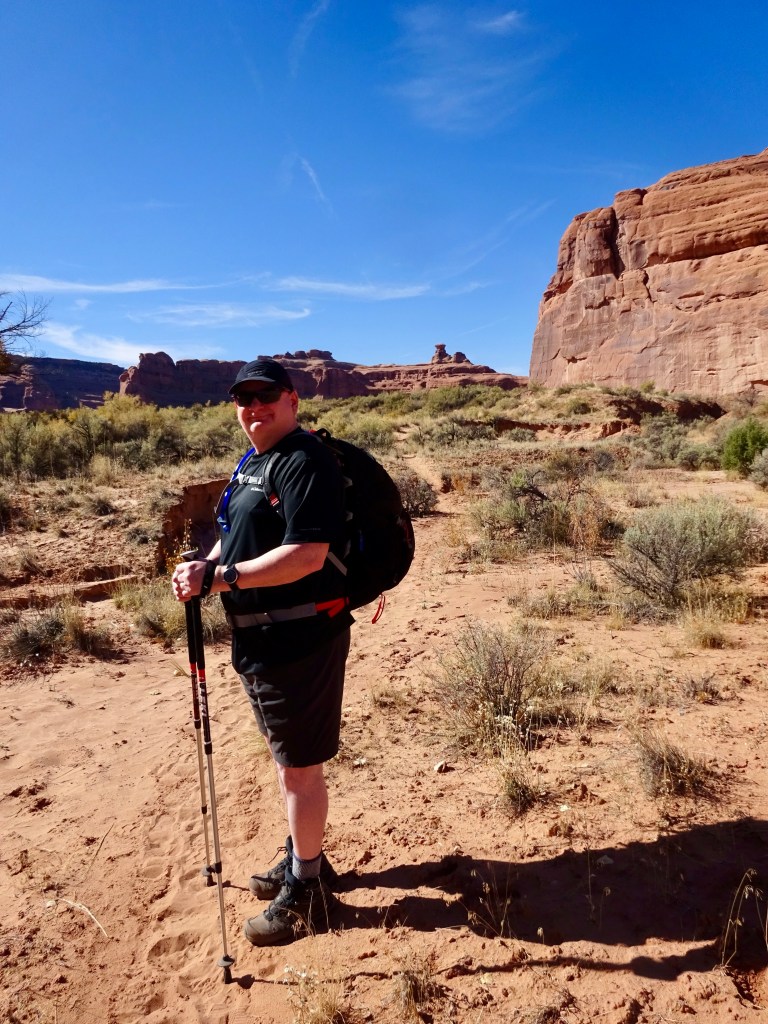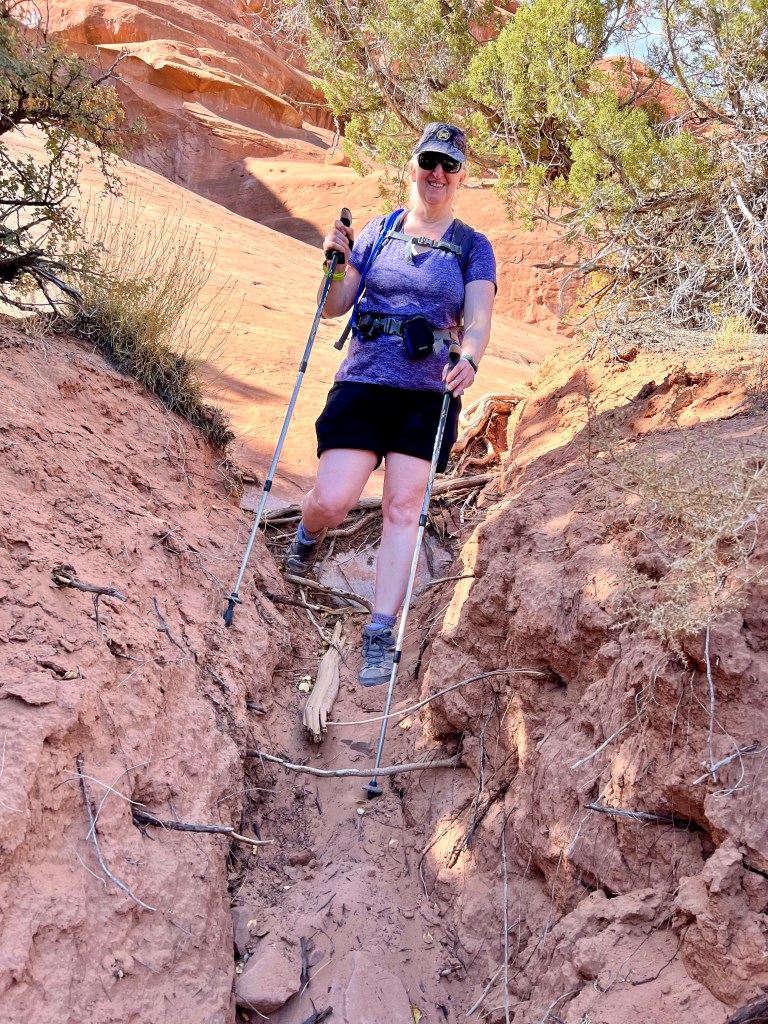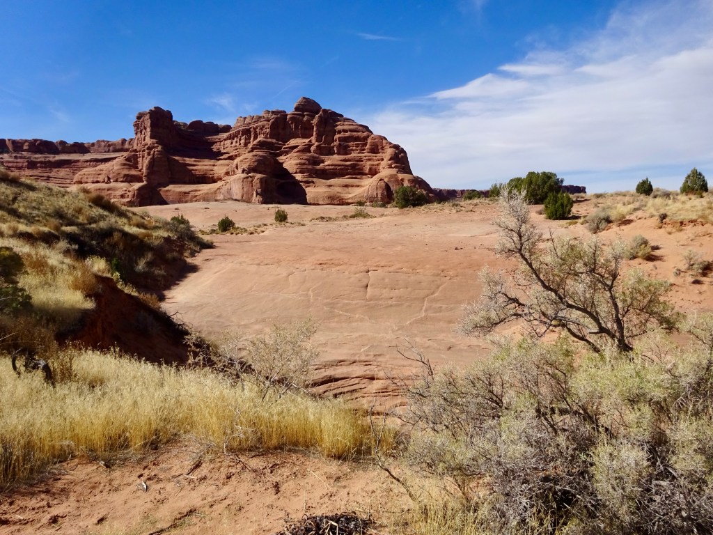 After taking our time it was around noon when we left. Perhaps the morning rush was past, or perhaps there wasn’t a rush at all, but either way, there was no queue at all to enter Arches, and so it was on to Plan A. A short drive up the main park road and we were soon at Courthouse Wash, where we parked in an unmarked lay-by. Today’s trail isn’t even shown on the topo map of the area, just the destination, Ring Arch.