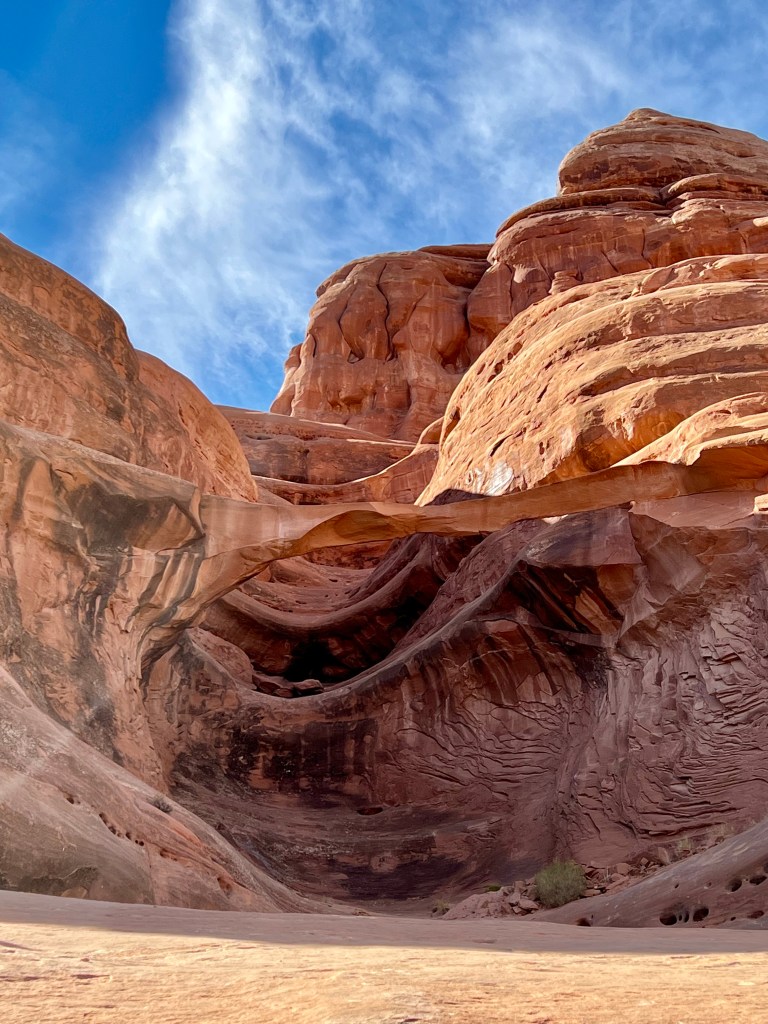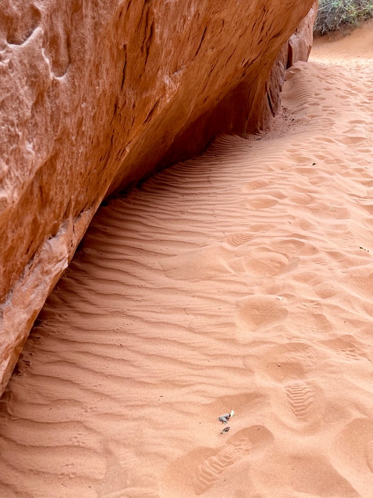 The route ended at Ring Arch, which were nearly got to…but decided the near vertical scramble up the slickrock for the last 100 feet was a stretch too far. I did try, but my boots were slipping on the rock. Instead, having had a good look at it from the end of the sandy trail, we had our lunch bars and then headed back, asking a slightly different path.