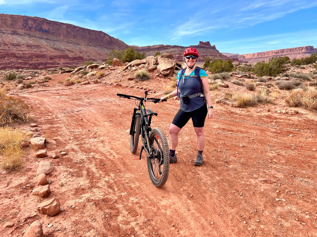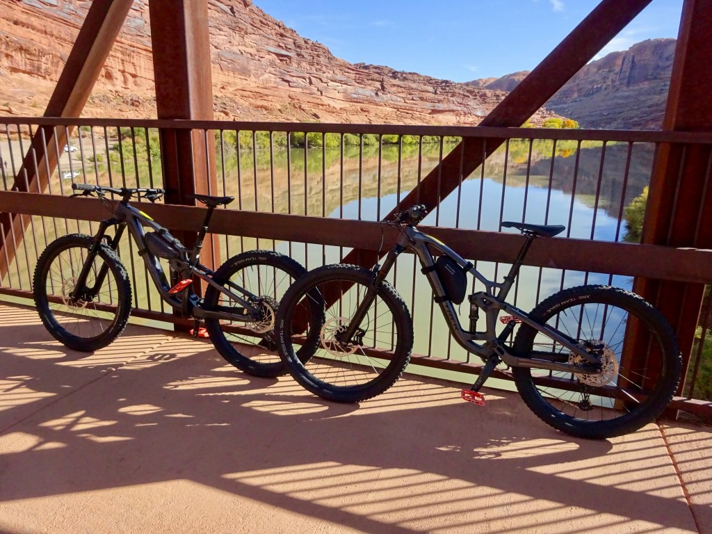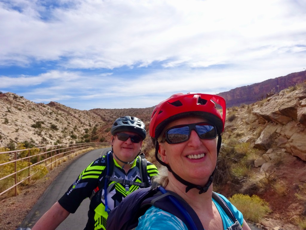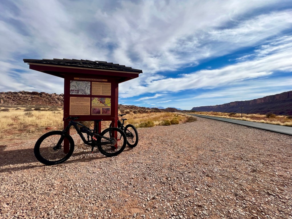 We were promptly introduced to our bikes a did a little test ride around the car park to check the saddle height range (I say ‘range’ because they are full suspension bikes with a seat dropper post). My bike was named Hobby, whilst Andrew’s was named Shetland. It sounded like we’d got a couple of horses! Once we were happy, we set off, crossing to the other side of the road and heading north on the paved Moab bike trail.