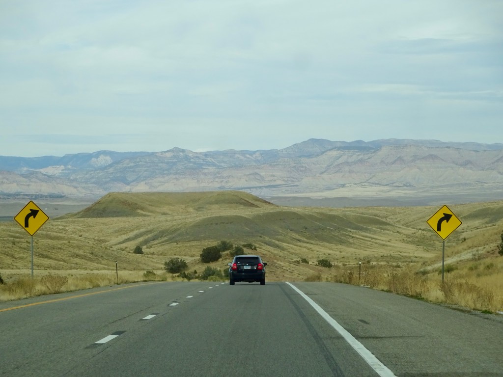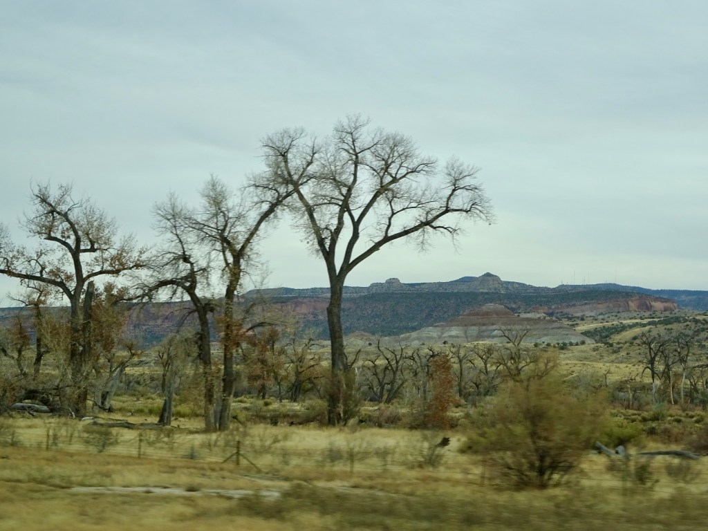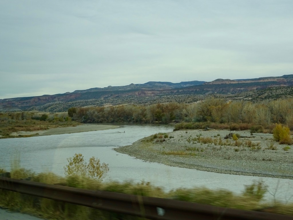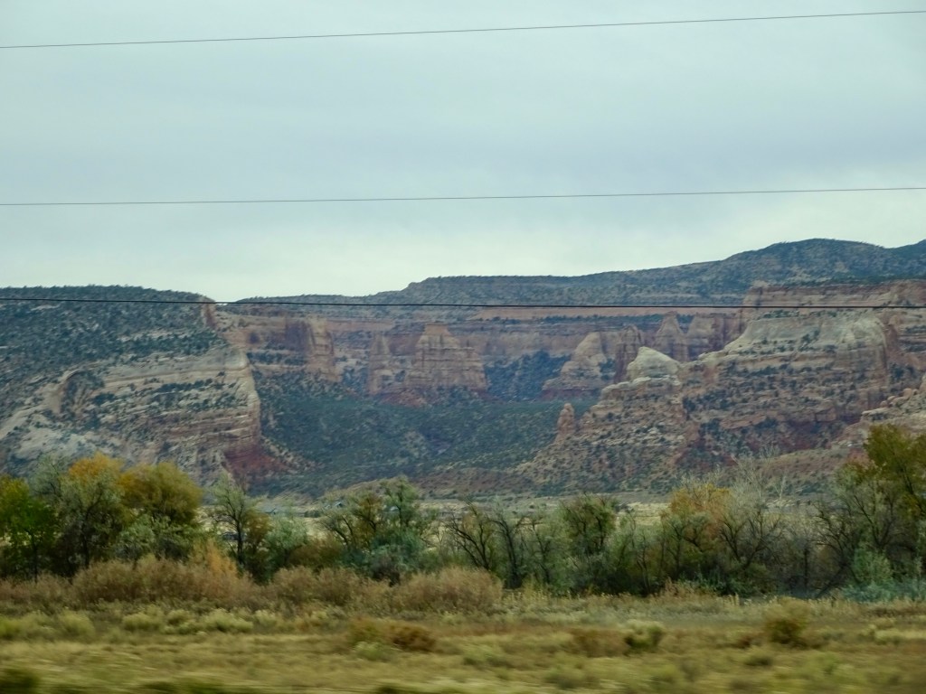 Eventually we had to leave, and after leaving the park we turned north, taking the faster route up UT-191 and onto I-70 east. The views were of the wide valley, the Book Cliffs and the La Sal mountains, which had less snow on now than when we arrived. The trees were less autumnal and more winter-looking as we got closer to Grand Junction, and the cloudy skies made it look cold, although it was still around 64F.
