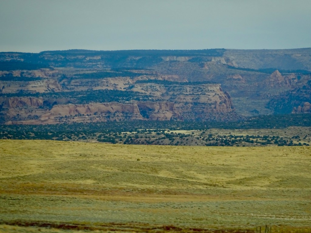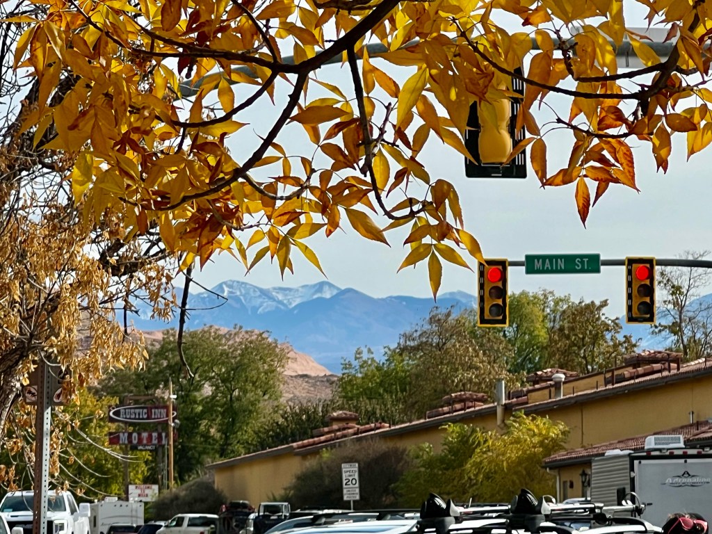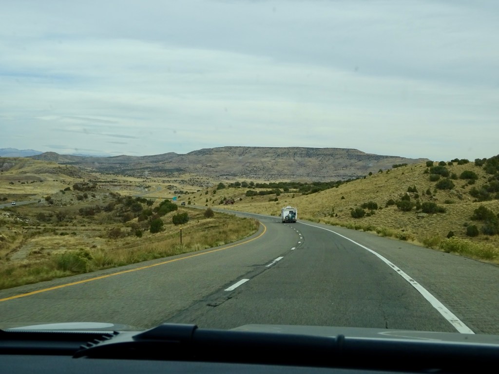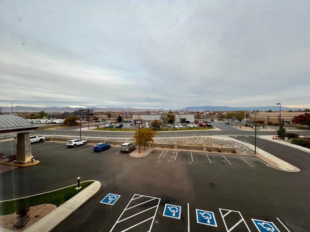 Eventually we had to leave, and after leaving the park we turned north, taking the faster route up UT-191 and onto I-70 east. The views were of the wide valley, the Book Cliffs and the La Sal mountains, which had less snow on now than when we arrived. The trees were less autumnal and more winter-looking as we got closer to Grand Junction, and the cloudy skies made it look cold, although it was still around 64F.
