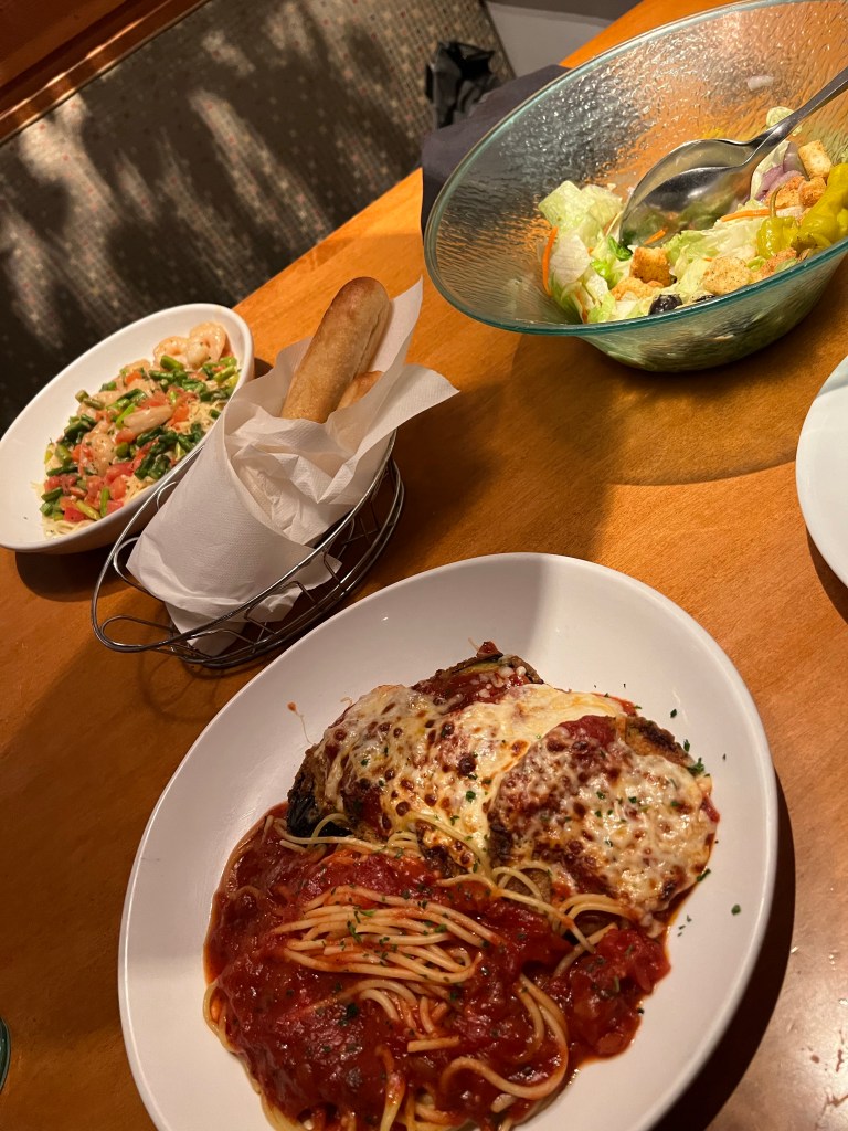 We drove to an Olive Garden restaurant, which was only a few minutes away. It’s been quite a while since we visited one, but they are always reliably good, at least in our experience, and tonight was no exception. (I realise this is in danger of becoming a food blog, rather than a holiday blog!).