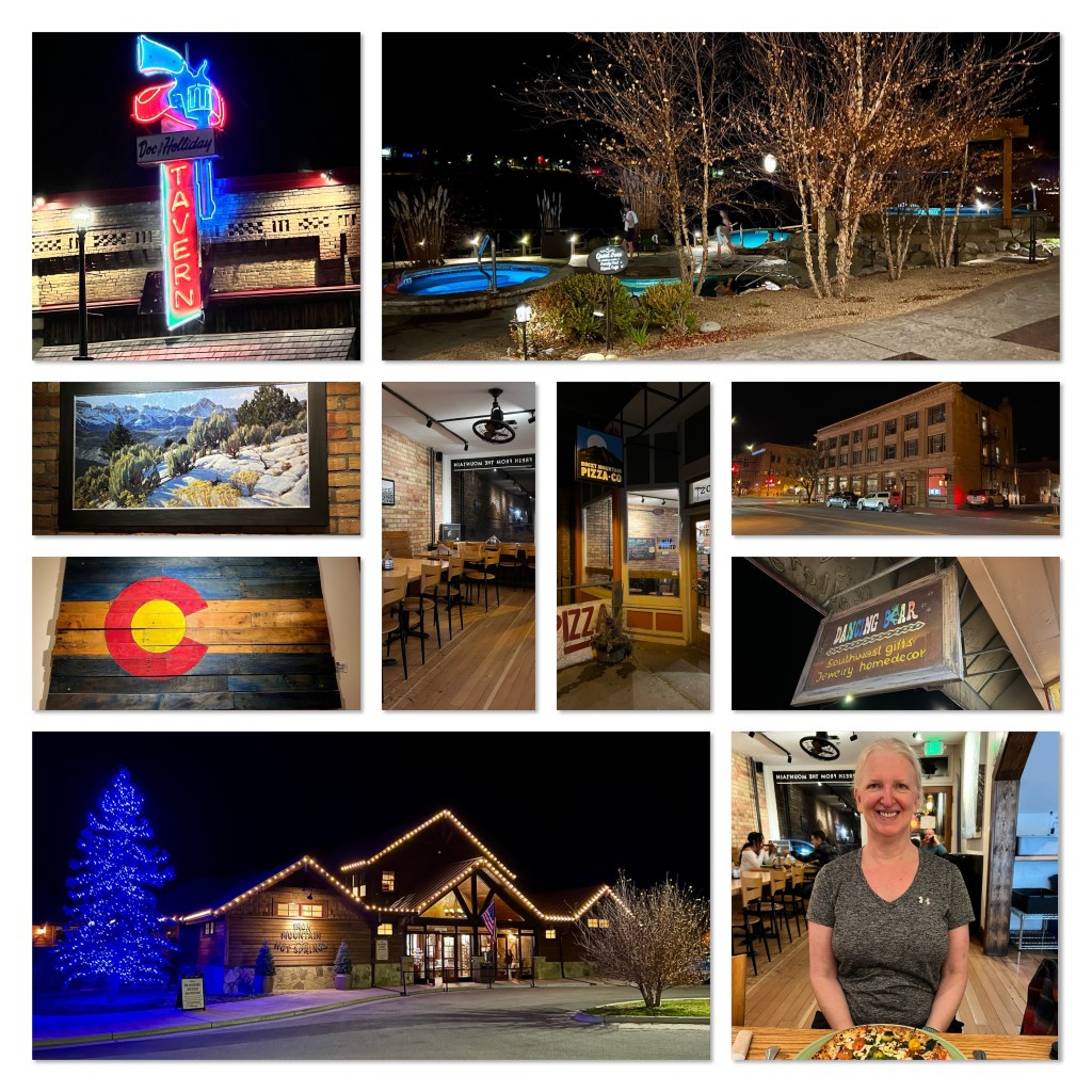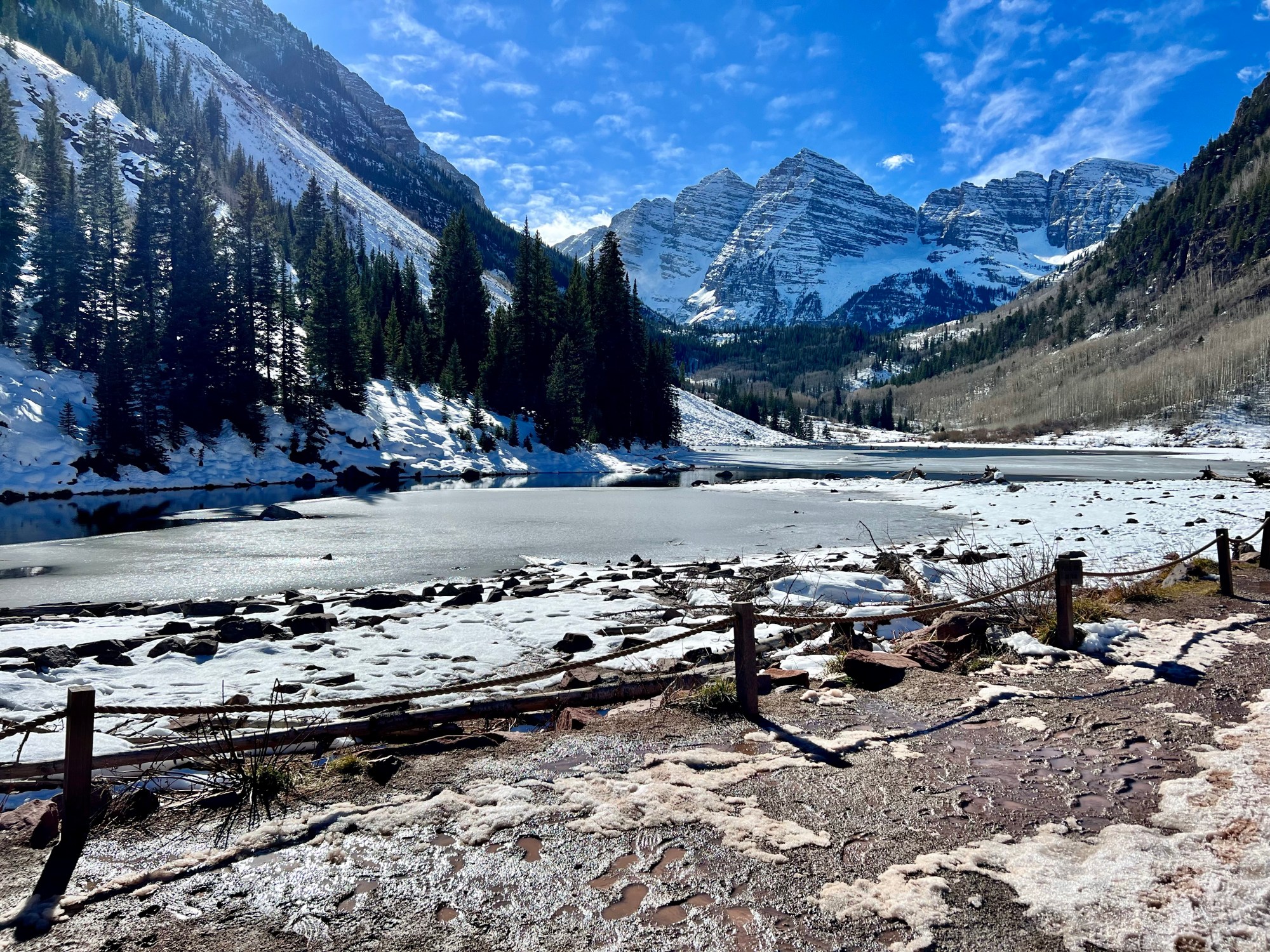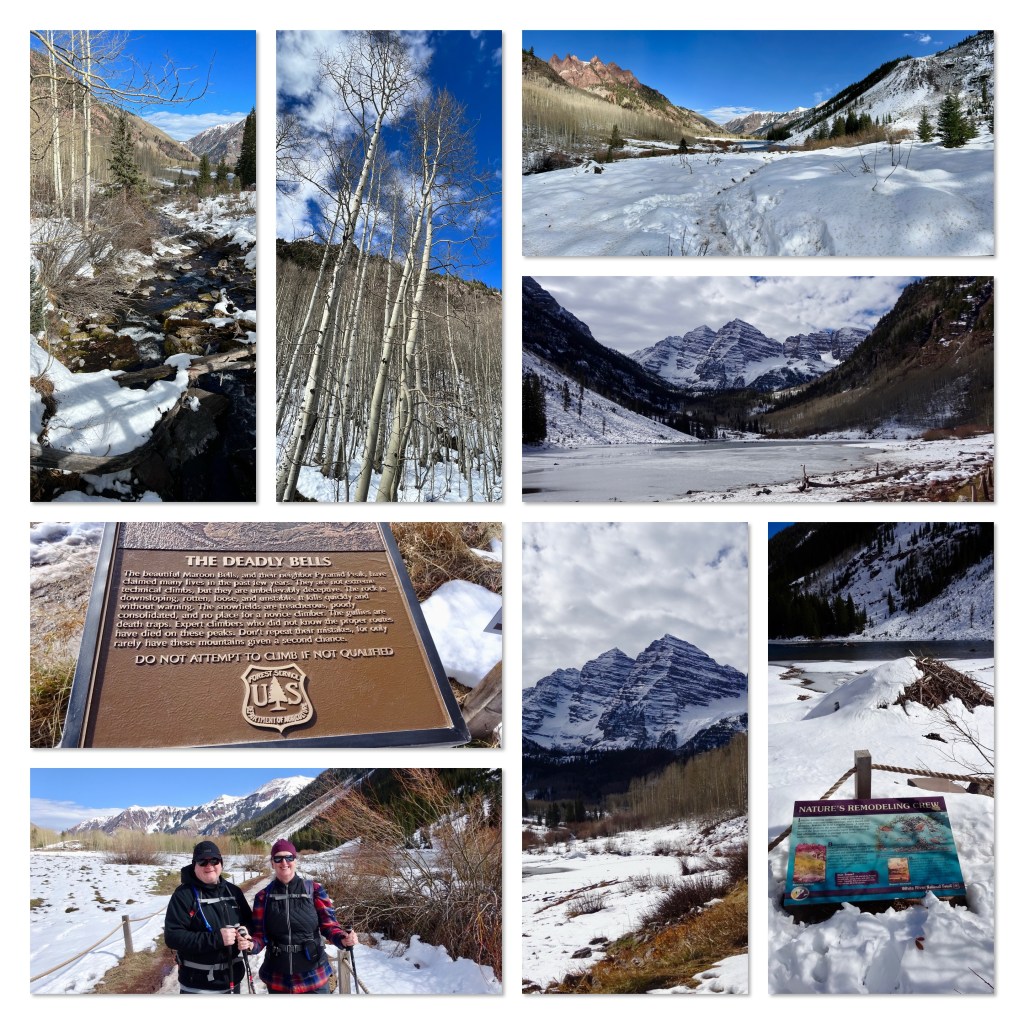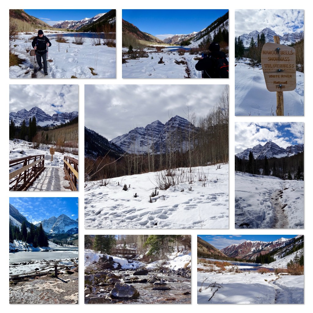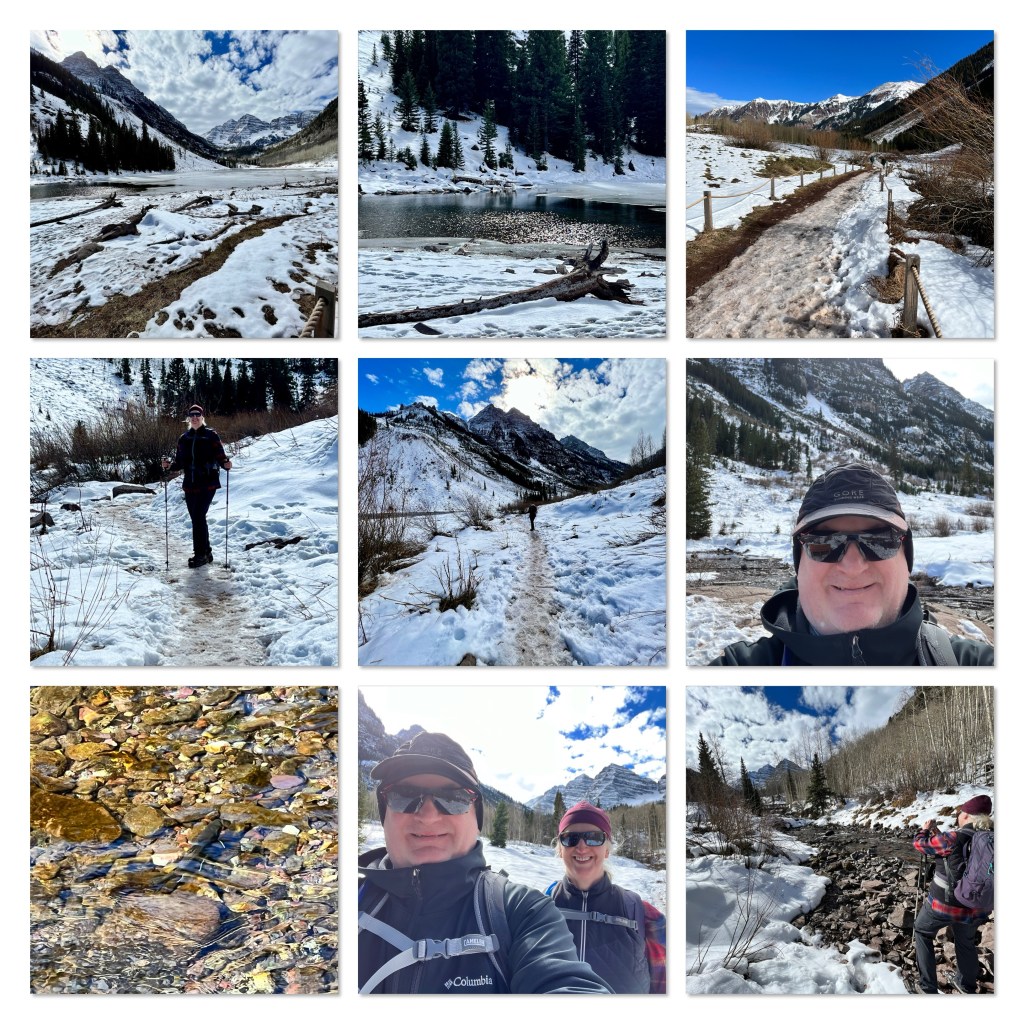 When we got to the car park we were pleased to see there were spaces available. We got ready to hike and set off…only to return and fit our microspikes to our boots, as there was plenty of packed snow. Second time lucky… The trail soon reached the lake. The scenery was amazing. Just…wow. We hiked alongside the lake, where people were skating and practicing iced hockey on the frozen lake surface. We continued up to a bridge over the creek, where we could see fish swimming. We didn’t want to stop, so we went to a group of trees…and then on to the next bridge… we could (probably should) have gone further, but we didn’t have a map. Considering the elevation was 9,600 feet, we felt fine. Perhaps we have finally adapted!